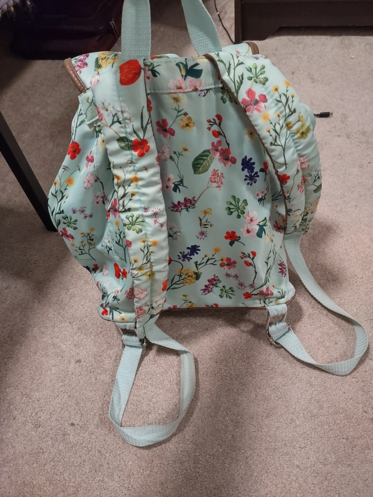 30I'm selling a cute floral backpack! It features a light blue background with a colourful floral pattern. The backpack has brown accents and buckle details, with multiple pockets for storage. Perfect for school, travel, or everyday use!