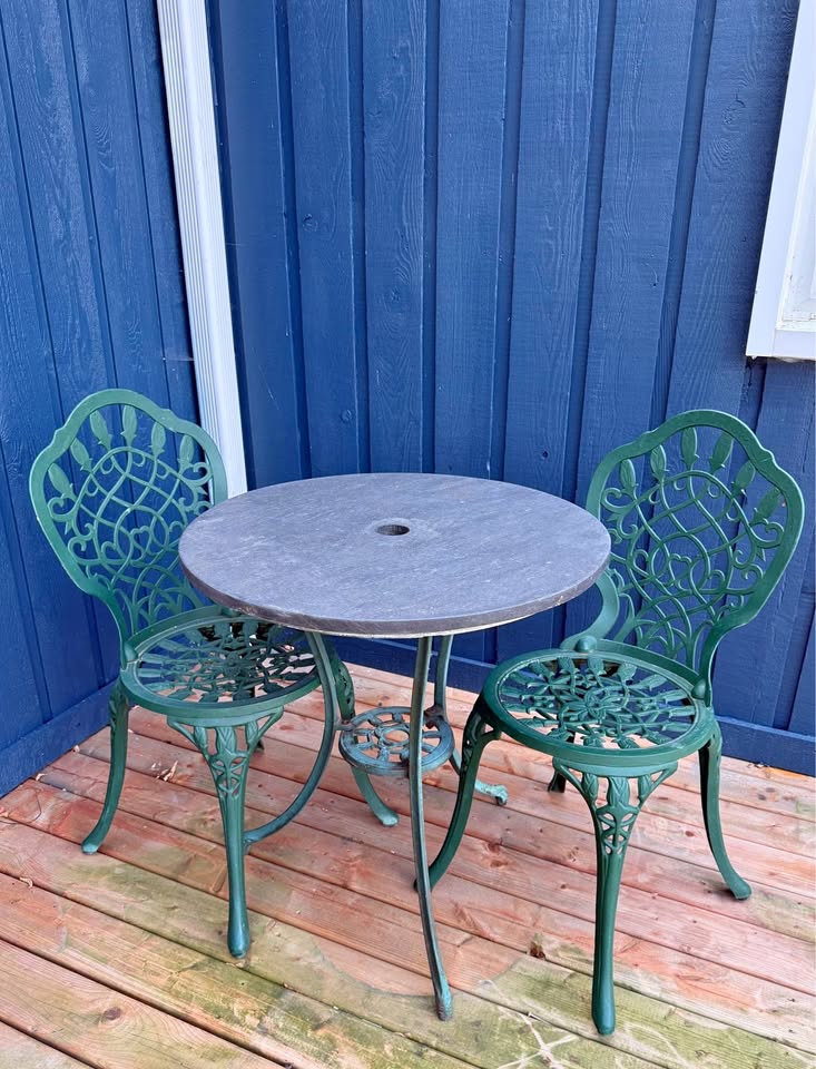 Bistro patio table set with 2 chairs. Metal chairs and table frame. Table has custom real stone top (removable). Hole for umbrella (not included). Chairs and base were recently recoated in high quality all weather coating. Pick up in Stouffville