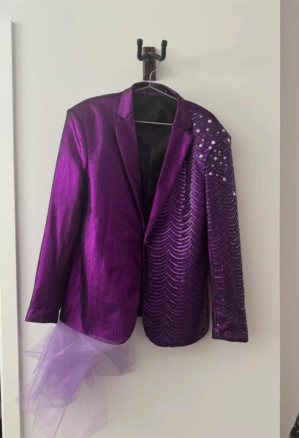 Upcycled blazer worn once for a show. Tulle, pearl decals and sequins are added on. Men’s size M blazer.