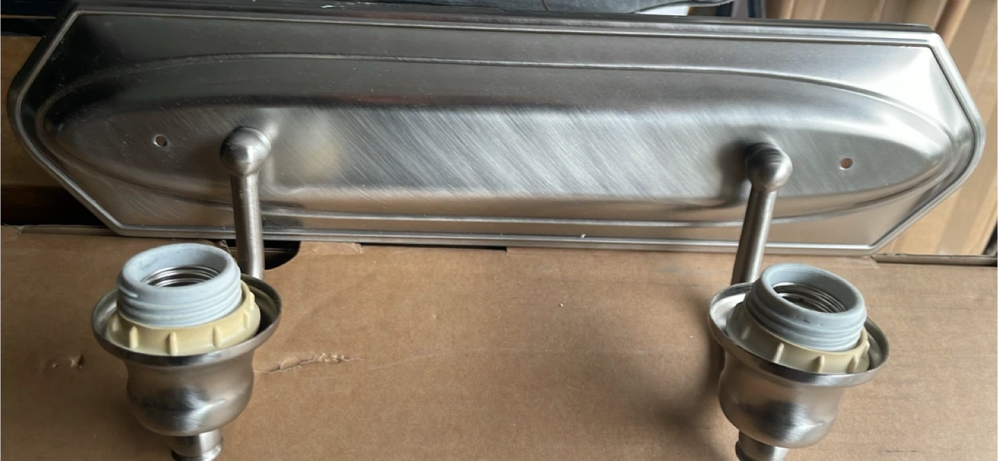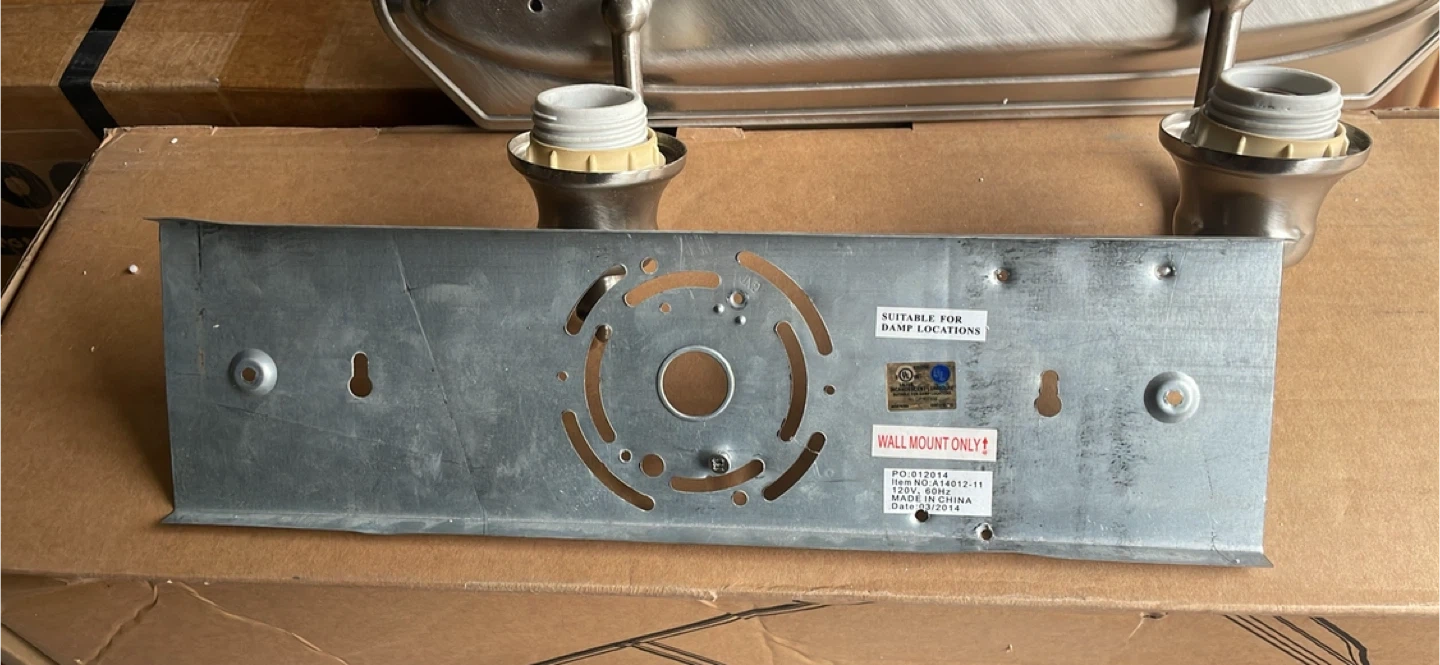 Selling a bathroom vanity light fixture that comes with two lights. It's in great shape and ready to brighten up your space! The fixture is suitable for damp locations and has a manufacturing date of 2014 October 20