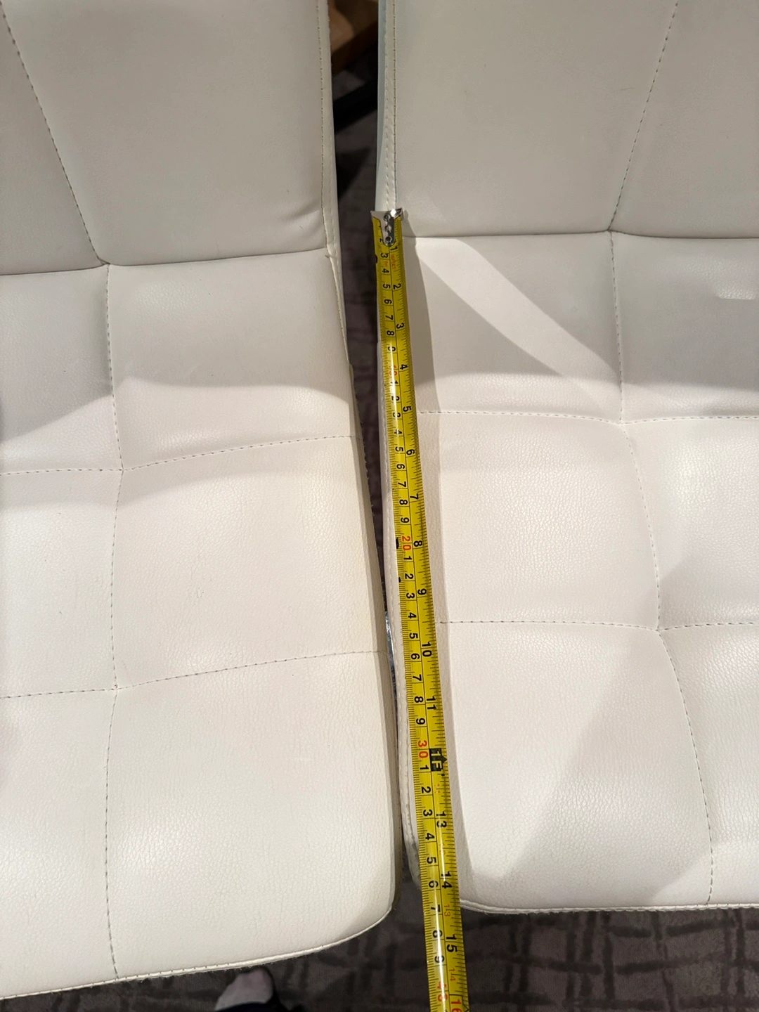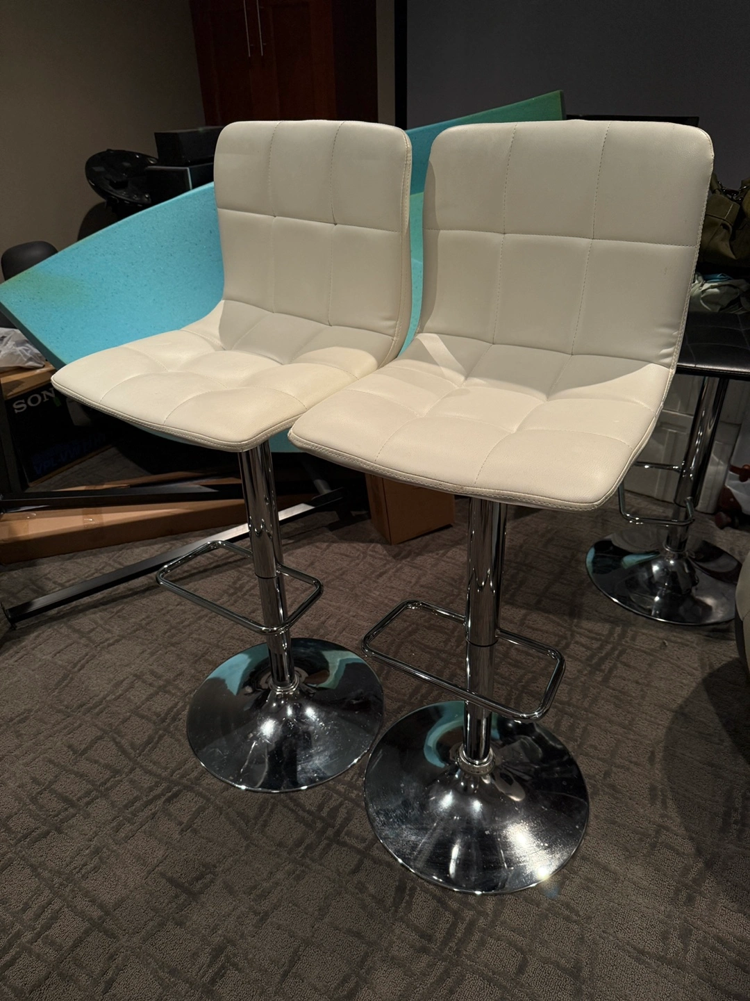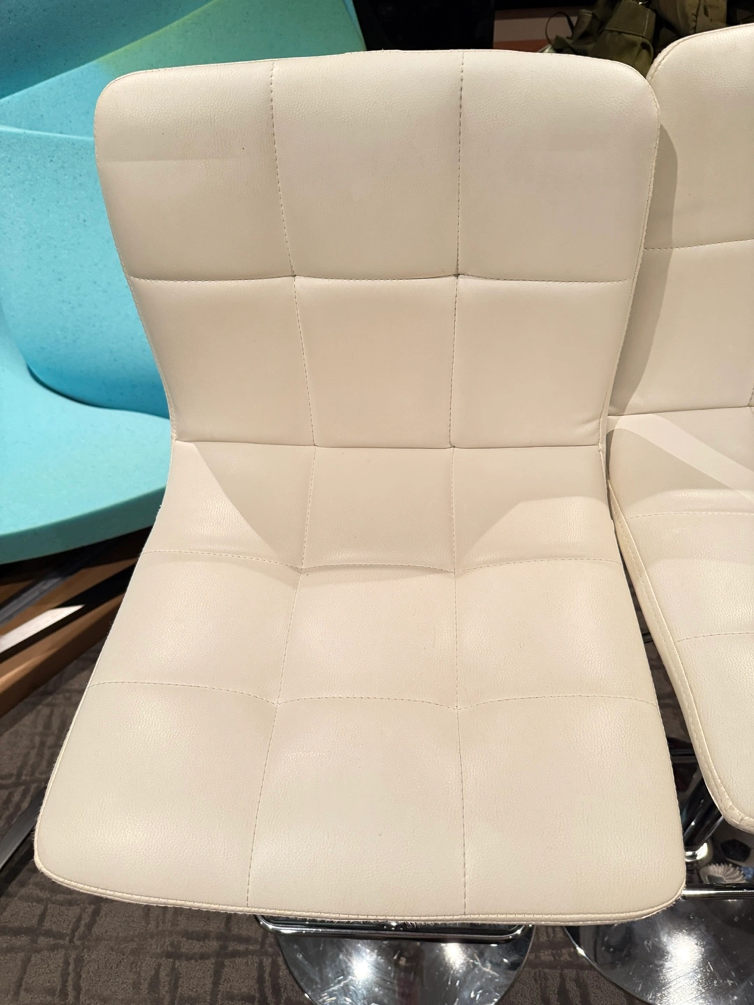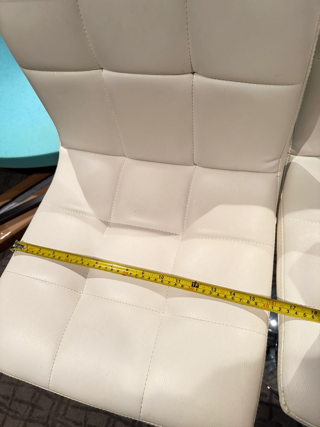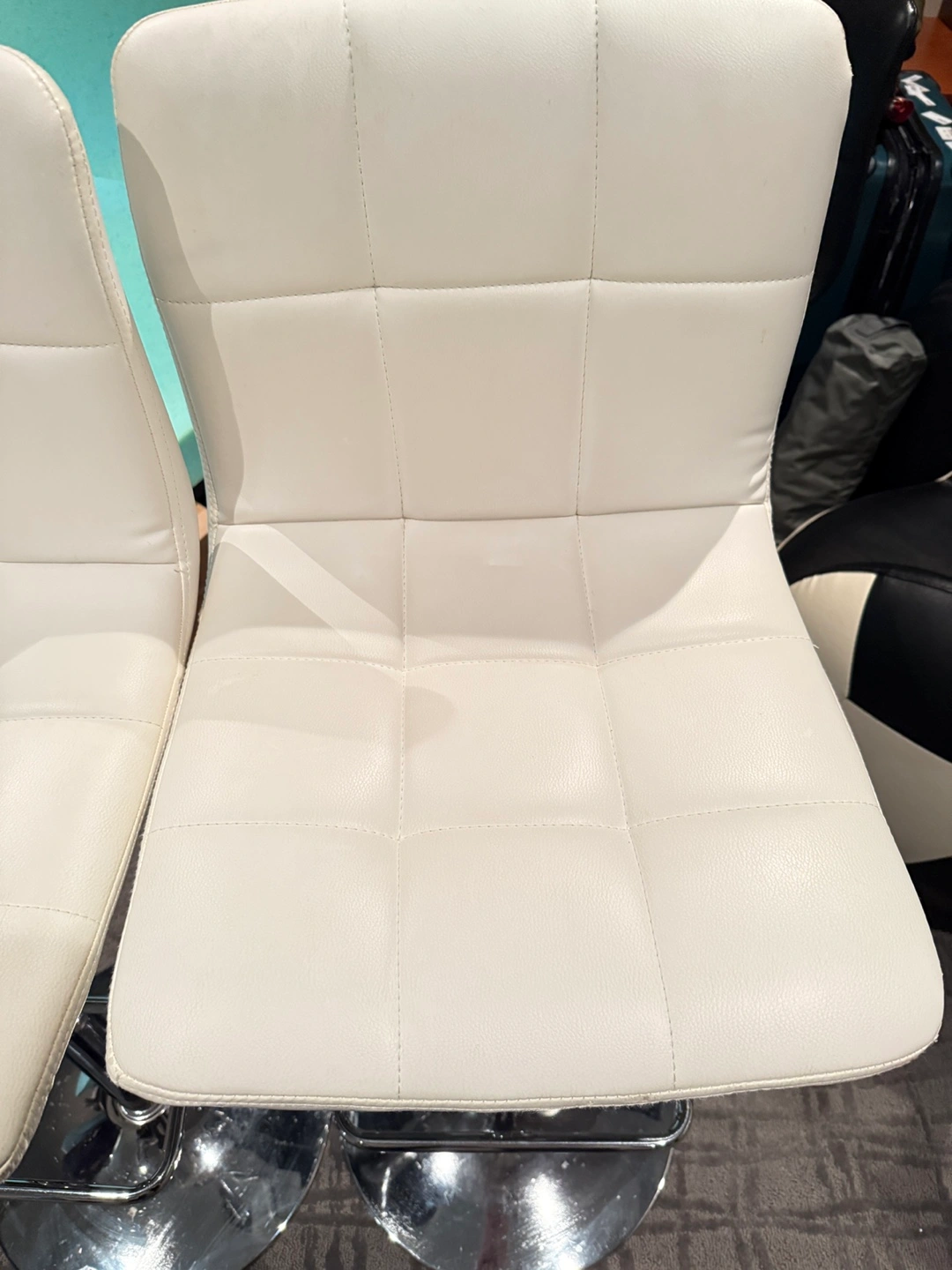 481Selling a set of two bar stools in great condition. They feature a clean, white faux leather seat with a stylish, modern design. The base is chrome. The seat width is approximately 17 inches. Perfect for adding a touch of elegance to your kitchen or bar area!