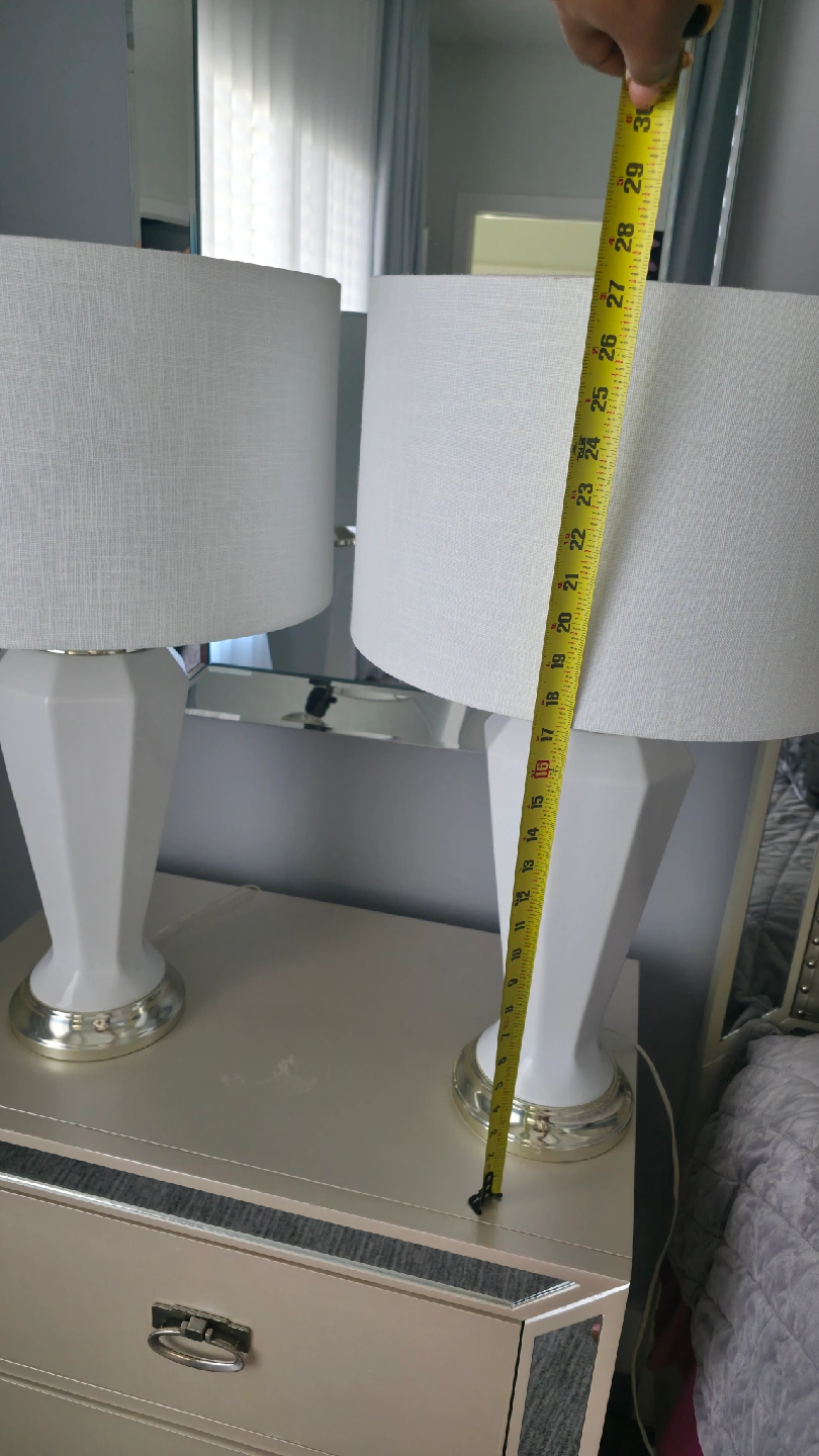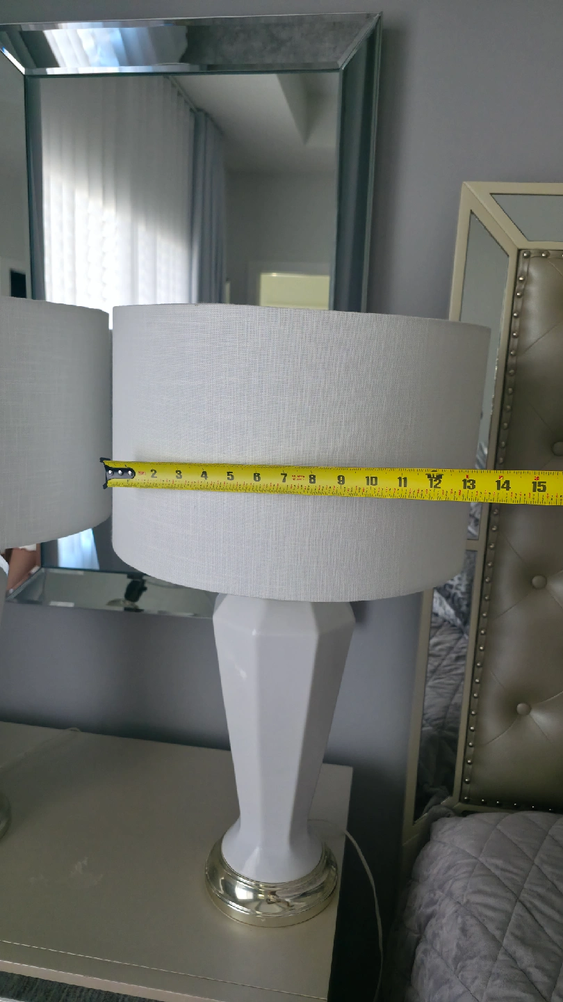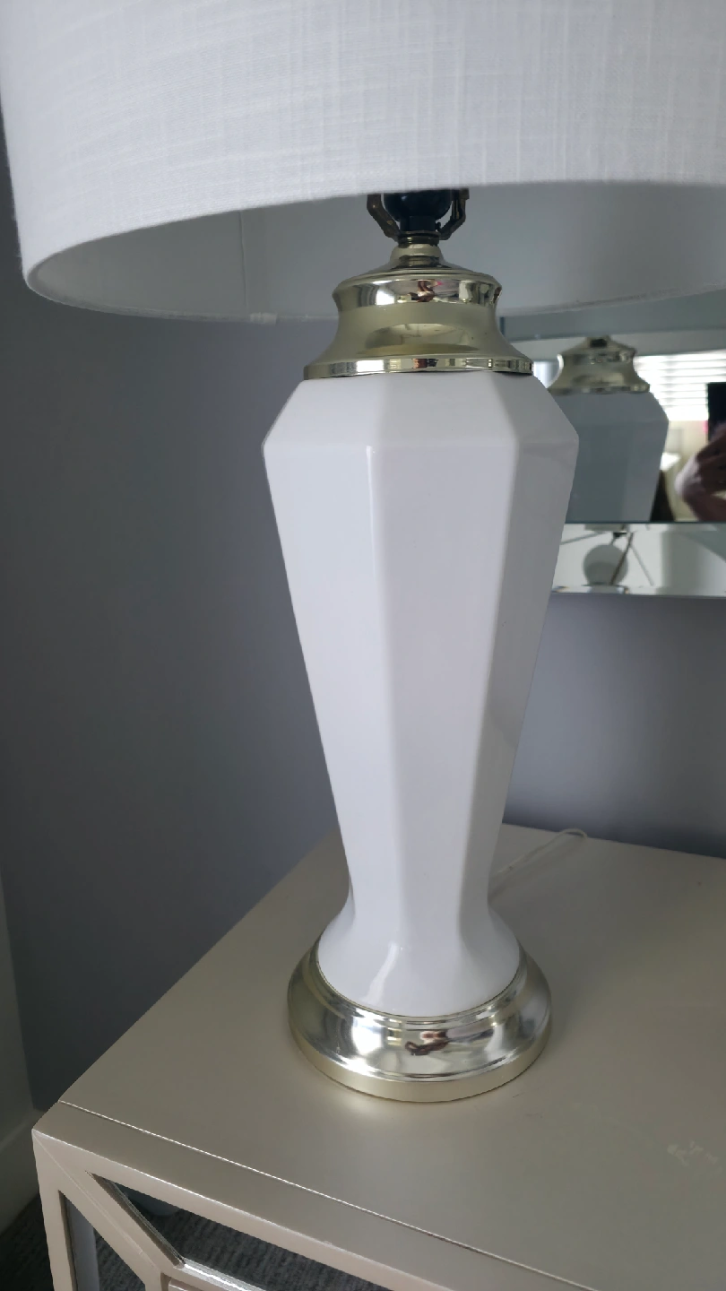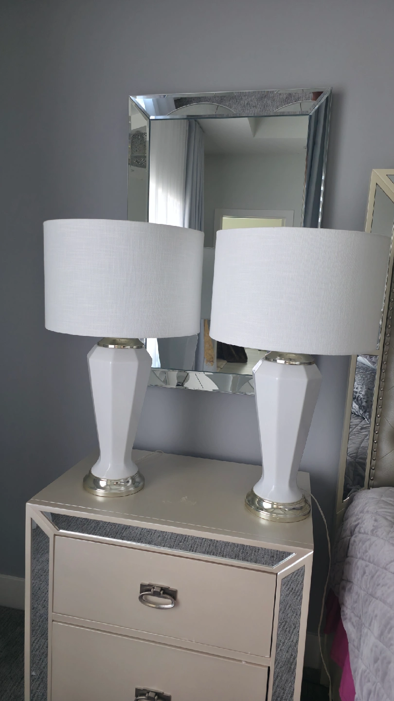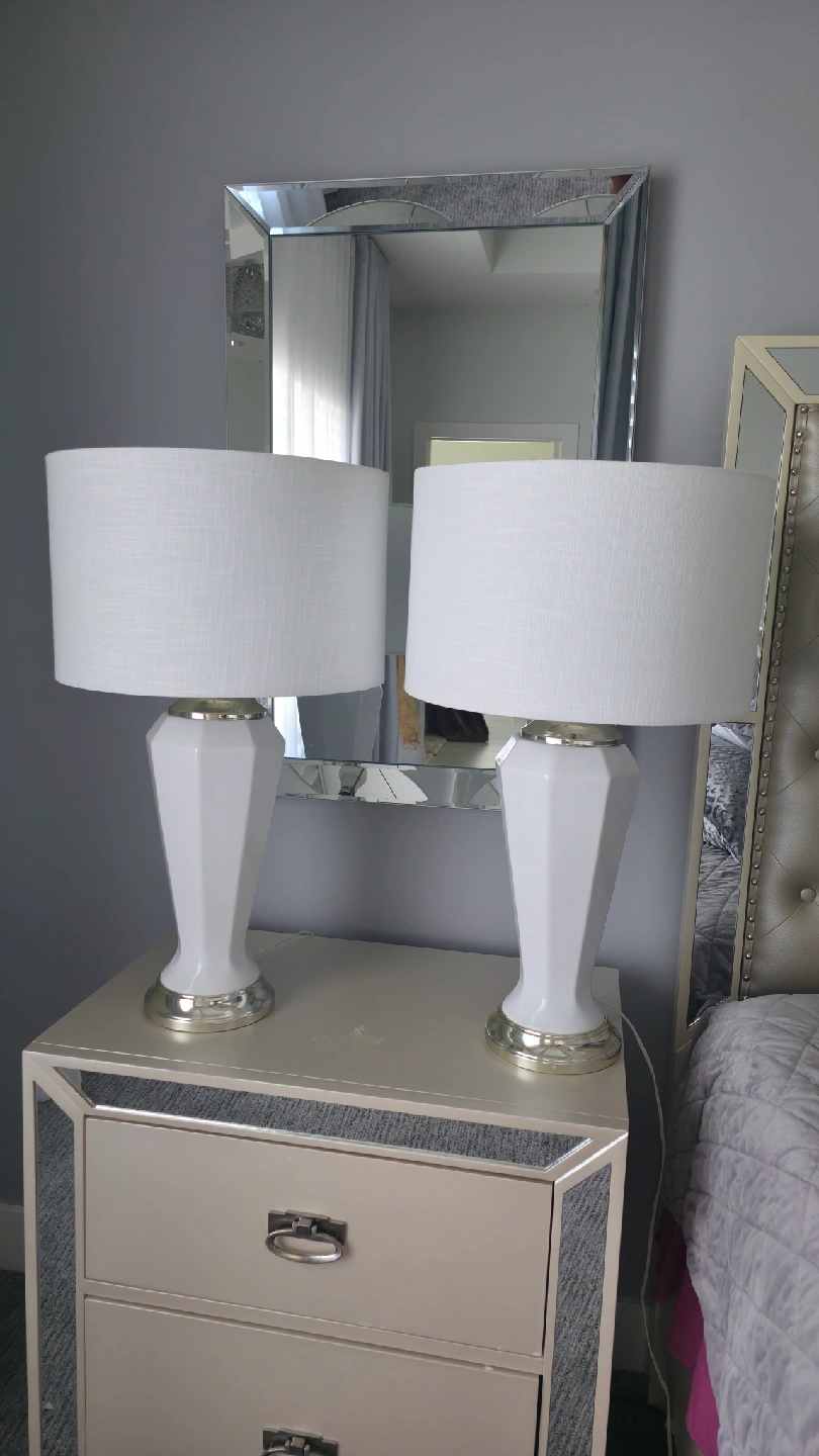 Selling a pair of lovely white lamps! The drum shades are about 14 inches wide and the lamps stand about 30 inches tall. They’re in great condition and would look amazing in any room. Only use for showroom decor.