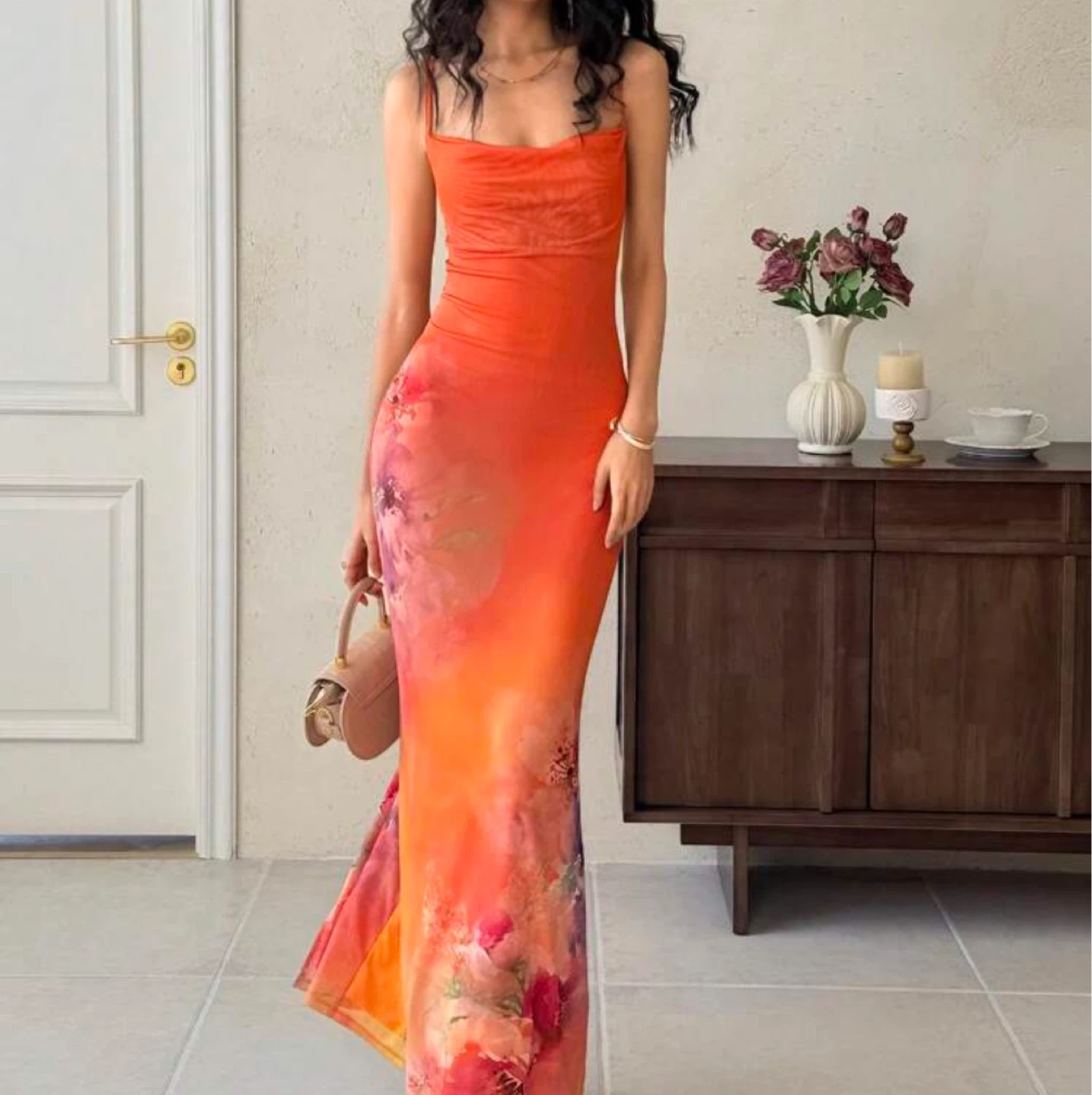 Beautiful orange maxi dress with a floral print. It's in great condition and perfect for a summer event or a night out. The dress has a flattering silhouette and is sure to turn heads!