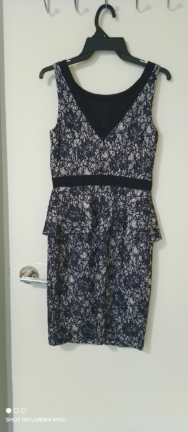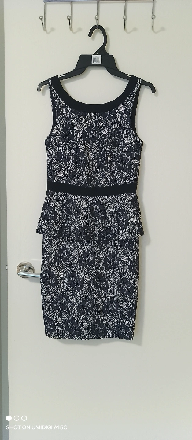 Selling a beautiful Le Chateau dress in size 4! It features a lovely black and white lace pattern with a flattering peplum style. Perfect for a special occasion or a night out