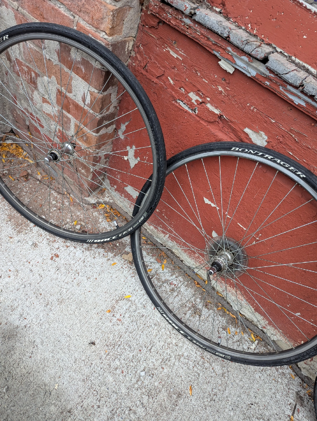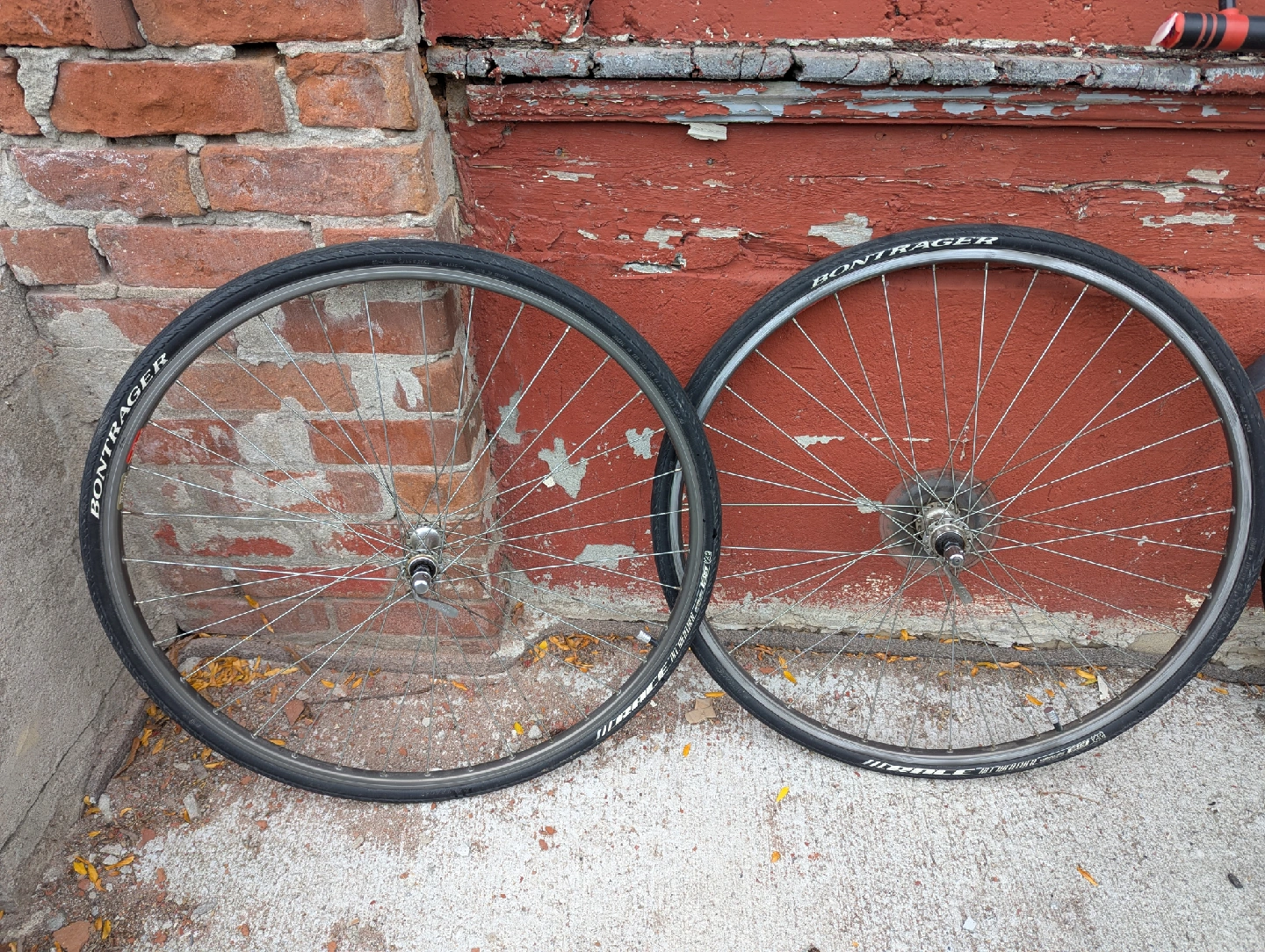 Selling a set of used vintage Hybrid bicycle wheels . These wheels are good for for road riding. They show signs of wear consistent with regular use, but are in fair working condition. Here are some specs: * : exage sport hubs Bontrager tires * Type: Road / Hybrid bike Wheels * Wheel Size: 700c Based on Kijiji listings, a comparable used wheelset typically sells for aroundCAD. . If the ad is up, then they're available!