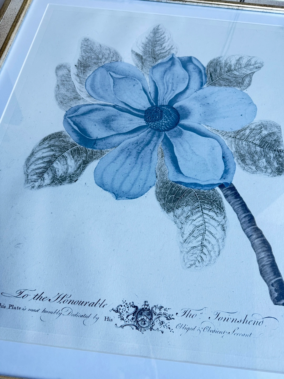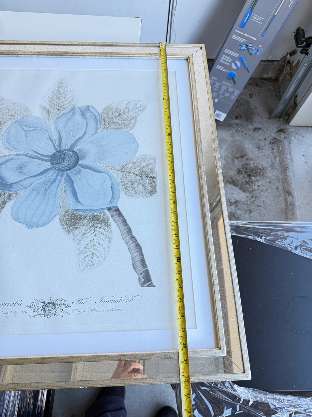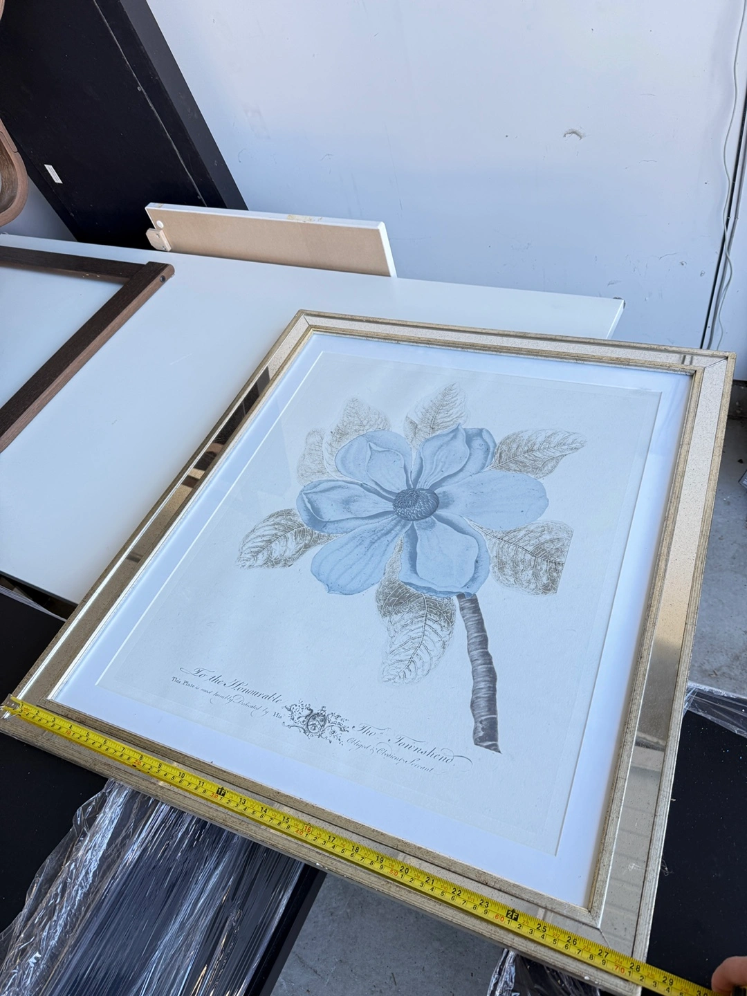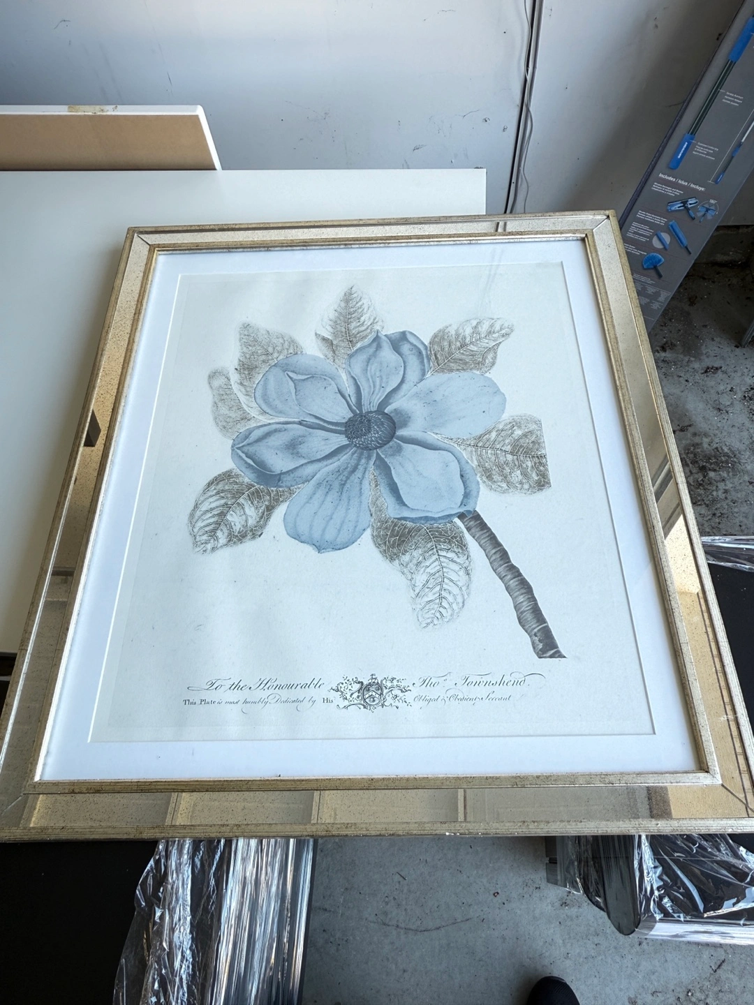 481Framed flower print art with a gold frame. The print features a blue flower with grey leaves. The frame has a mirrored inner border. Great for adding a touch of elegance to any room