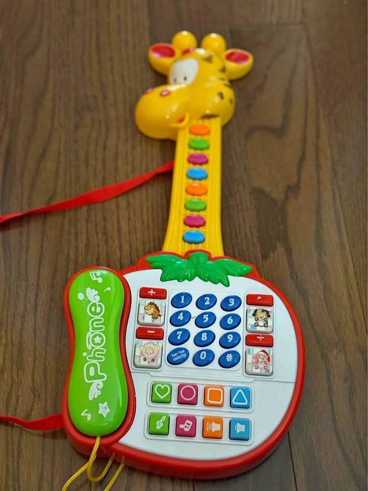 This is a multi-functional educational toy designed for toddlers, shaped like a friendly yellow giraffe that combines features of a guitar and a telephone. Key features and functionalities include: Musical Guitar: The toy's body resembles a guitar, with a long neck forming the giraffe's neck. It features a row of colorful buttons along the neck, representing musical notes or sounds. Interactive Phone Keypad: The lower part of the toy has a phone-like keypad with numerical buttons (0-9, *, #) and various icons representing different functionalities like animal sounds, songs, or shapes. Educational Content: The toy aims to teach numbers, animal sounds, basic arithmetic symbols, and shape recognition through interactive play. Light and Sound Effects: Has Lights that flash in rhythm with music or sounds, and it can play various melodies, and animal sounds Child-Friendly Design: Made of sturdy plastic, it's designed to be durable and safe for young children, encouraging both musical exploration and imaginative play as a phone. Portability: The design, possibly including a strap as seen in the image, suggests it can be easily carried by a child. (Batteries not included) Cash only-local pick up Richmond Hill