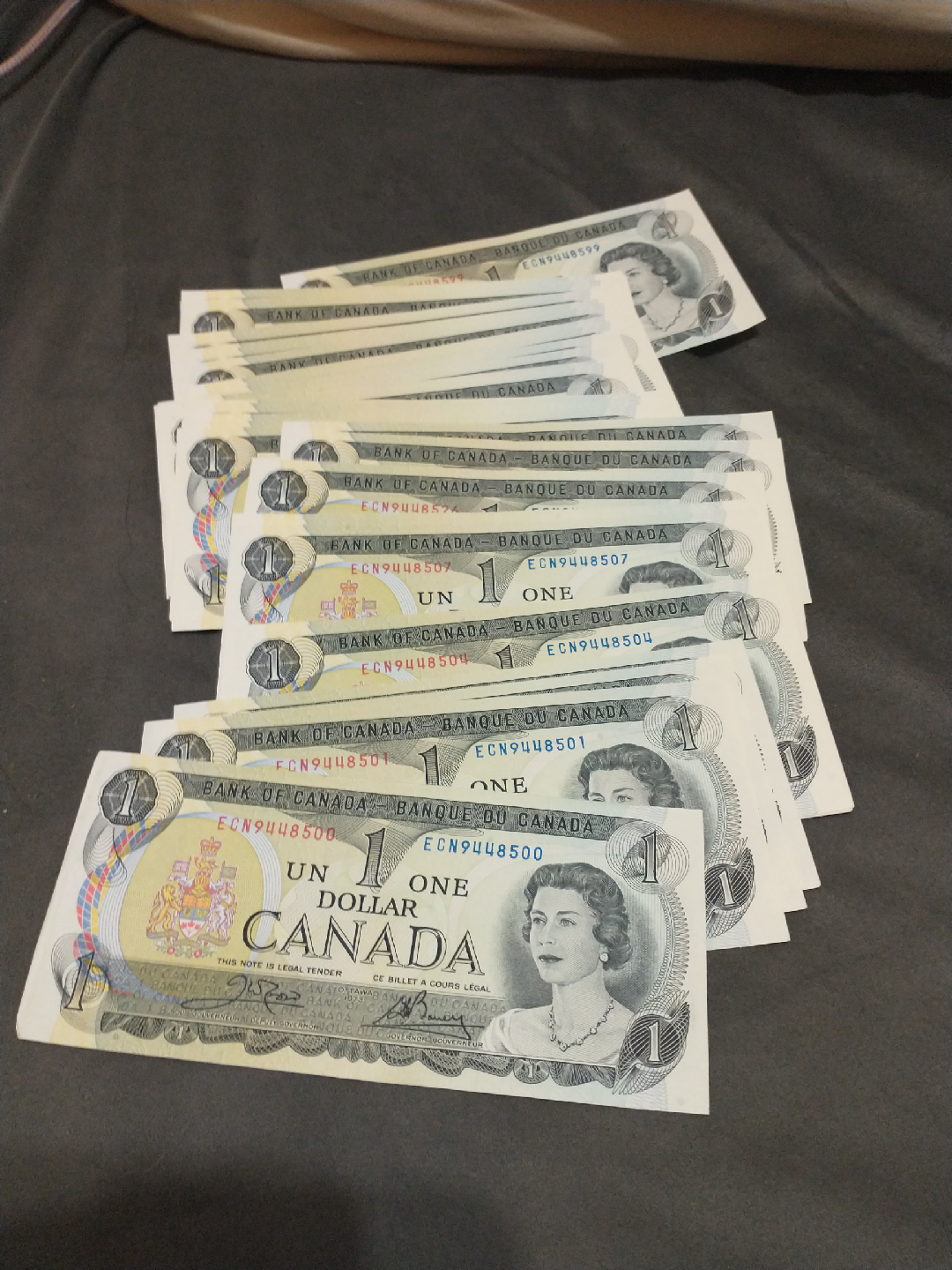 1973 Canada 100 consecutive, uncirculated banknotes, serial numbers ending ~8500 to ~8599. To see all my coins and banknotes, search zzz. For only my Canadian coins and banknotes, search zzzc. Numista CV $5.70 per note. Slava Ukrayini!