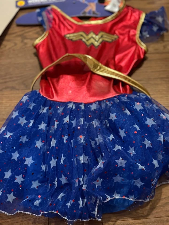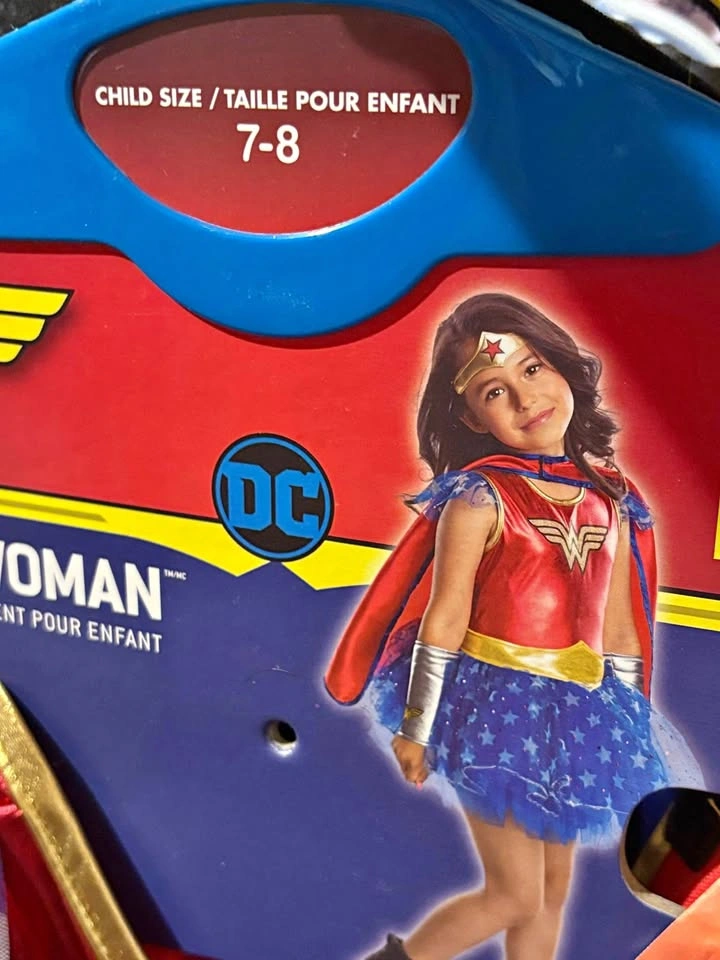 Selling a Wonder Woman costume for kids! It's a child size 7-8. The costume features the classic Wonder Woman design with the DC logo. Perfect for dress-up or Halloween! Includes dress, belt, headband, and arm cuffs. Note: due to the fabric type -has some discolouration from friction with belt.