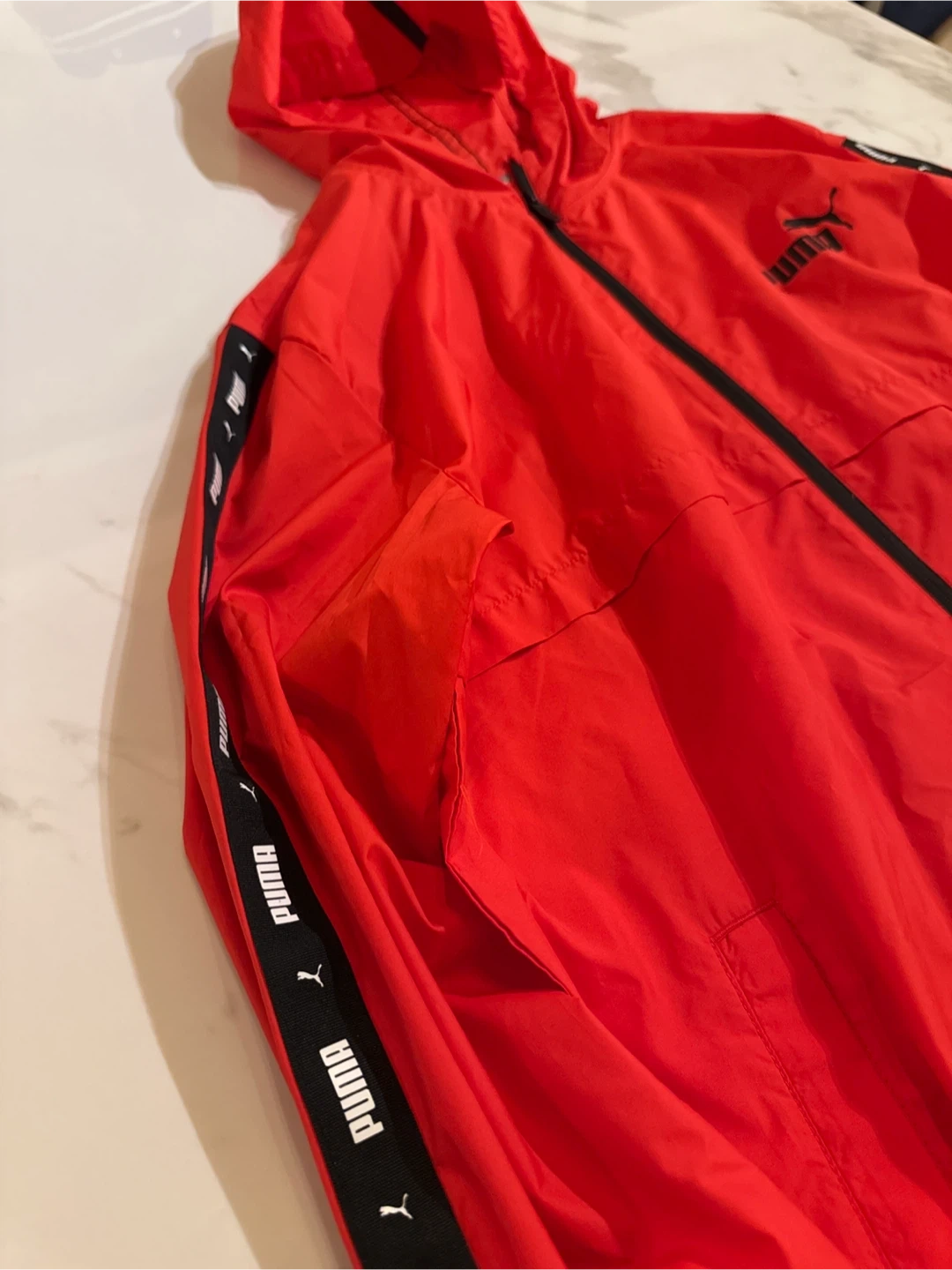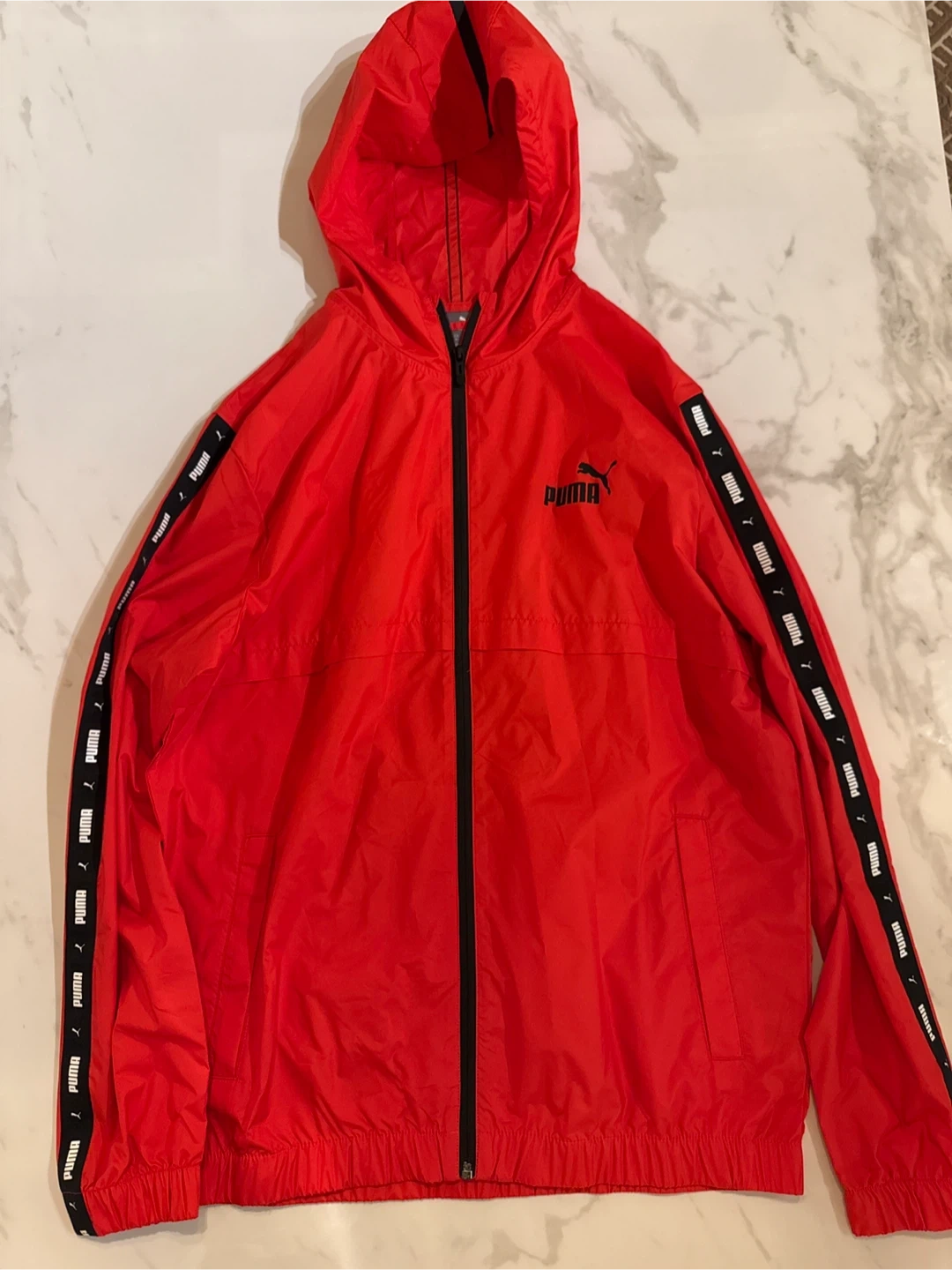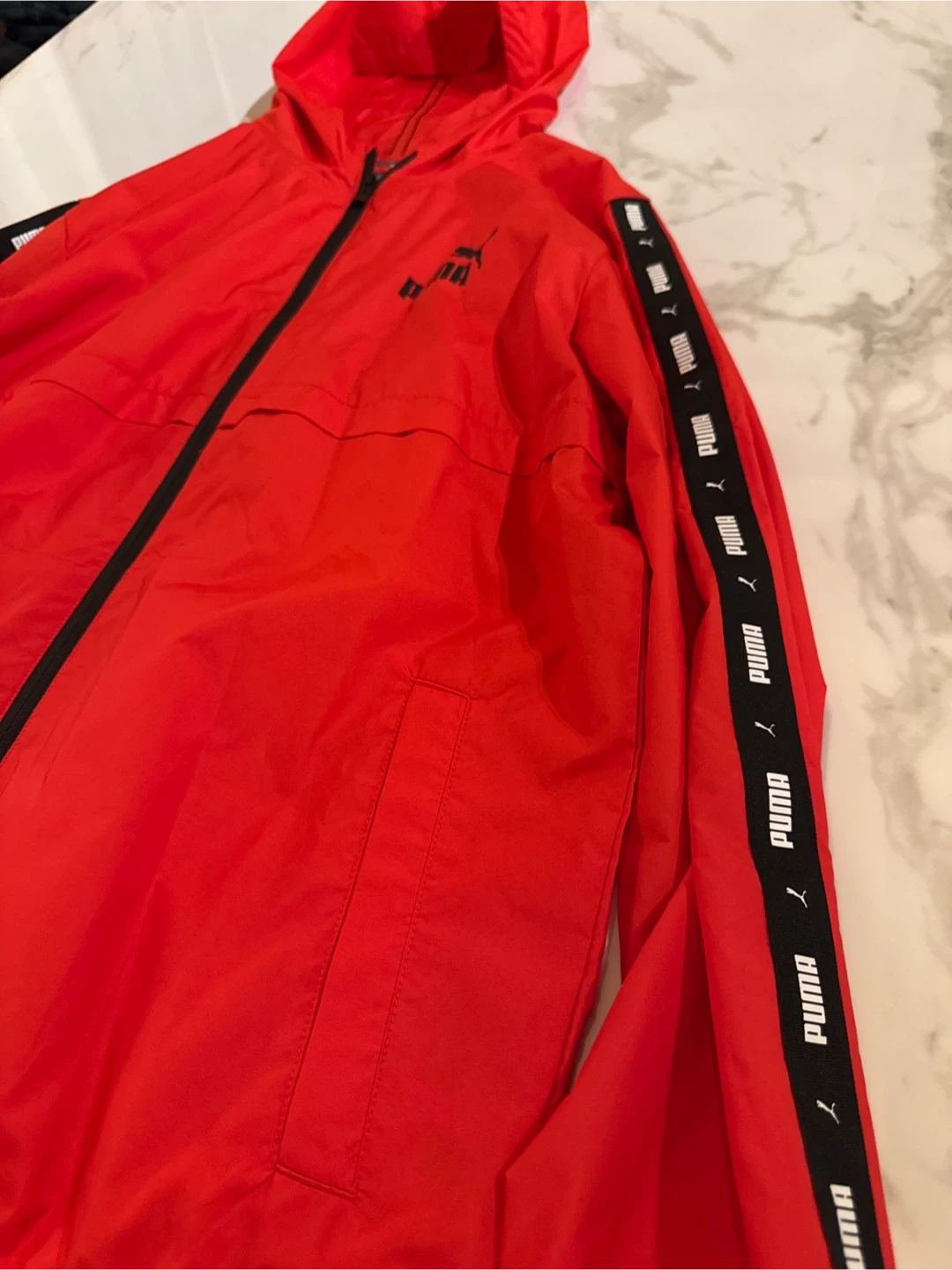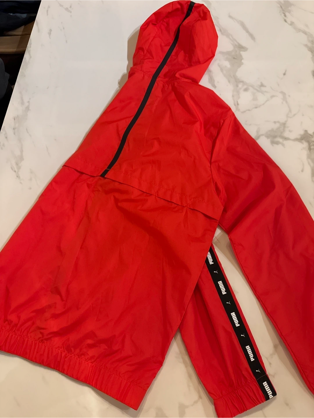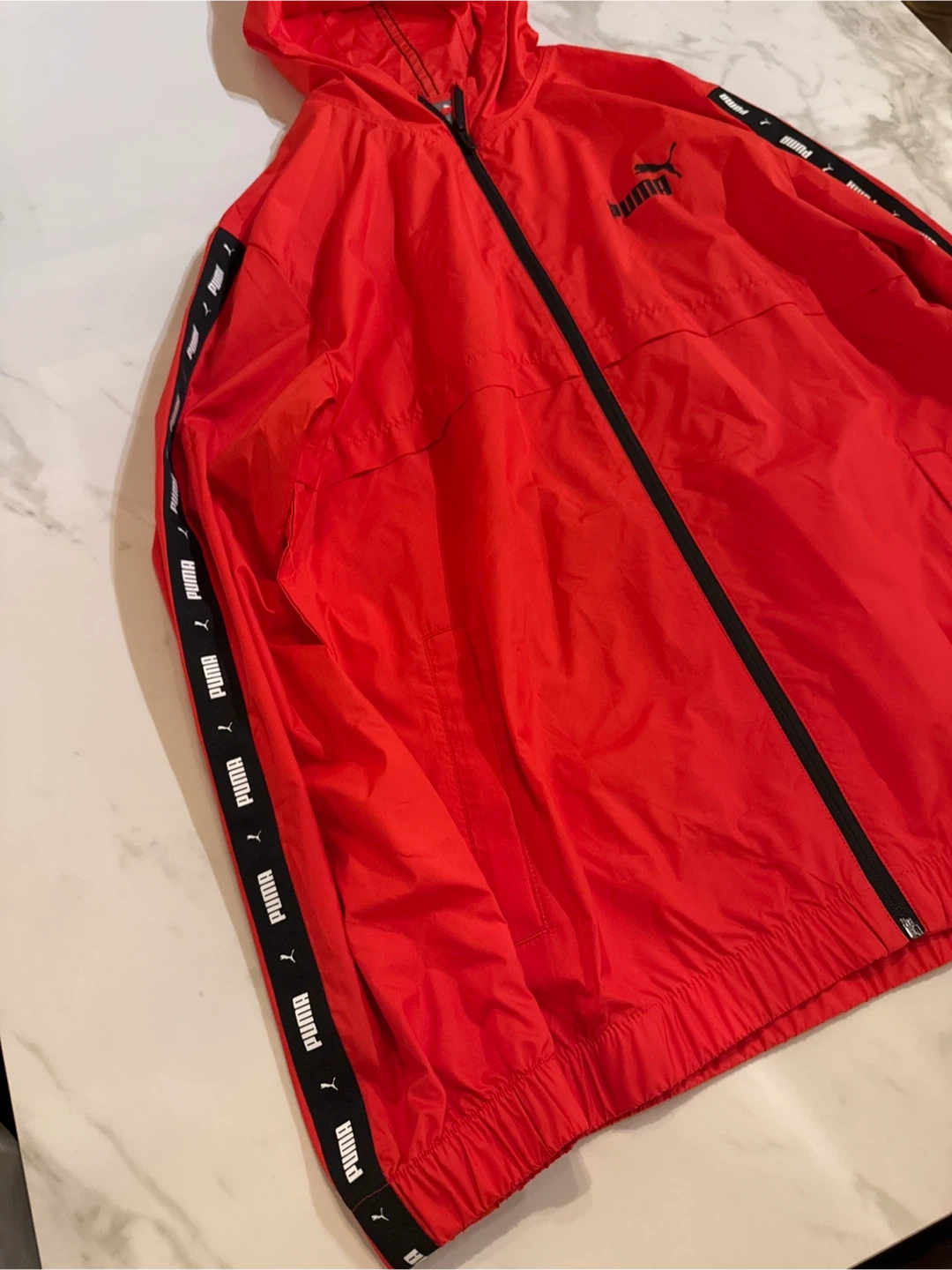 Selling a bright red Puma windbreaker jacket in size medium. It features the Puma logo and branded tape detailing along the sleeves. Perfect for layering or wearing on a windy day!