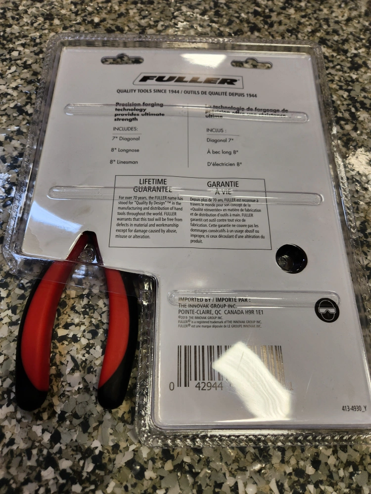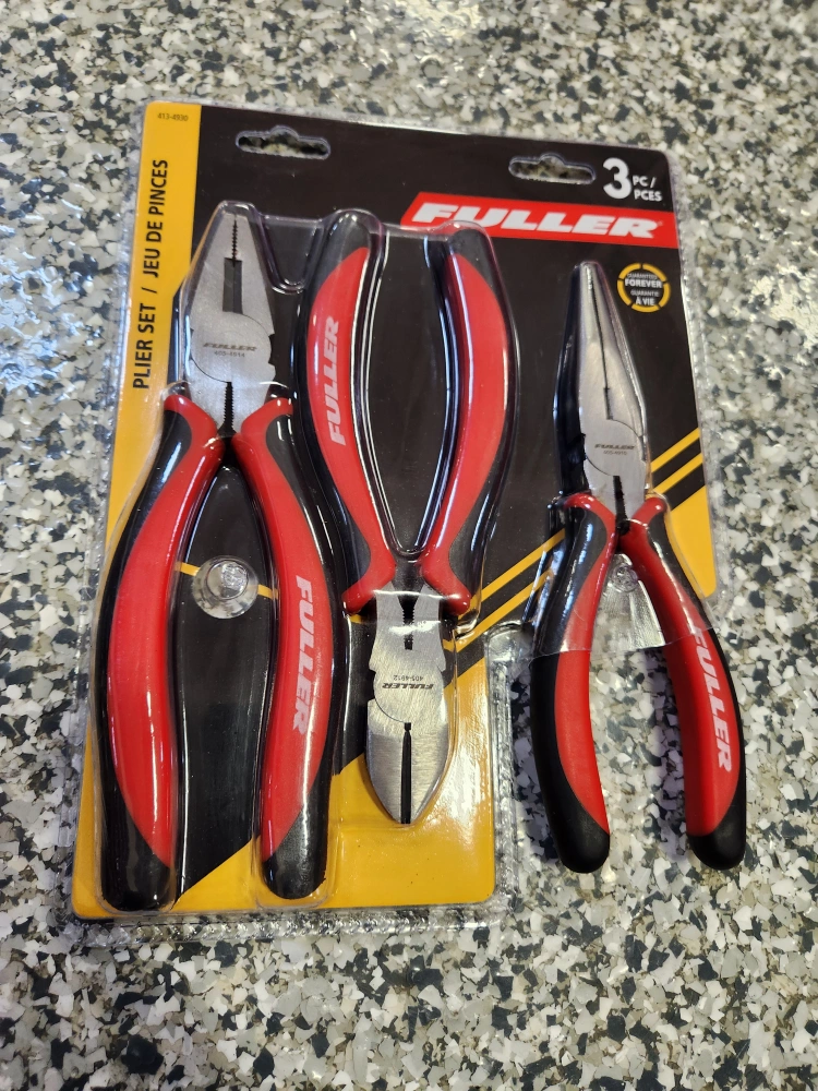 31Selling a brand new Fuller 3-piece plier set! This set includes 7" diagonal pliers, 8" long nose pliers, and 8" lineman's pliers. Precision forging technology ensures ultimate strength. Lifetime guarantee included!