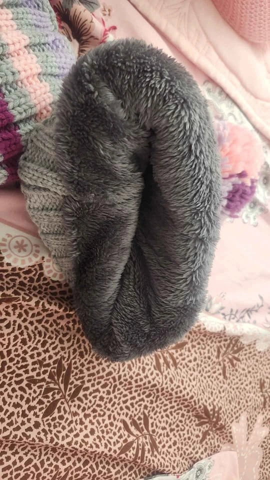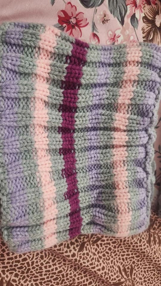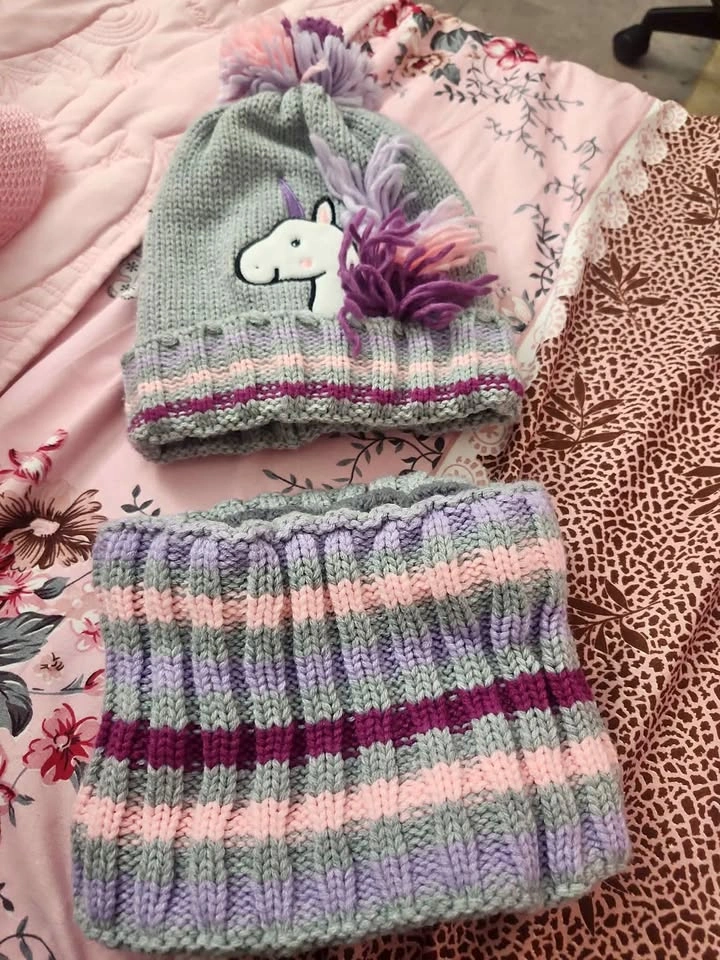 Cute unicorn-themed knitted hat with matching neck warmer in soft pastel shades of lilac, pink, and grey ππ