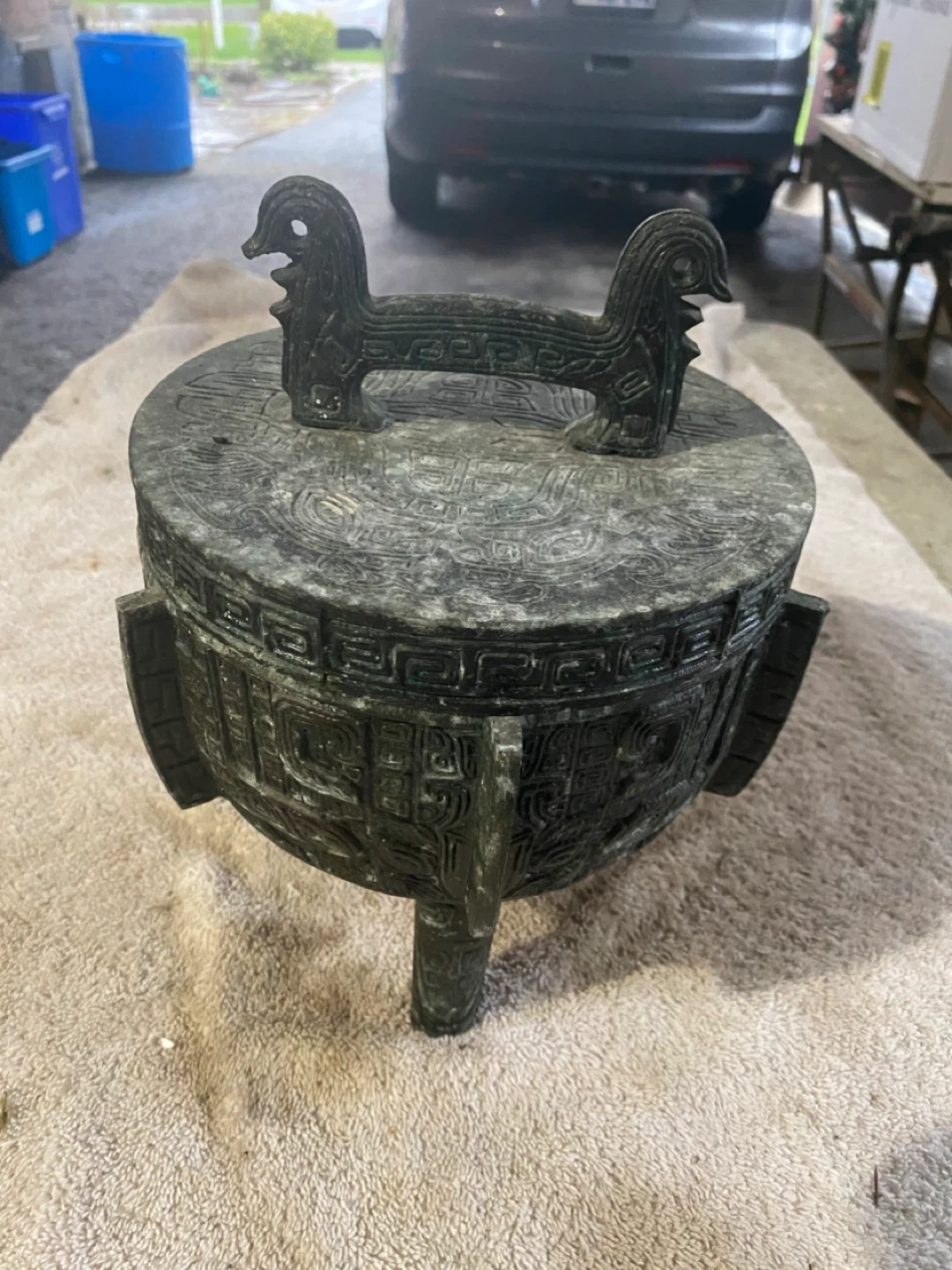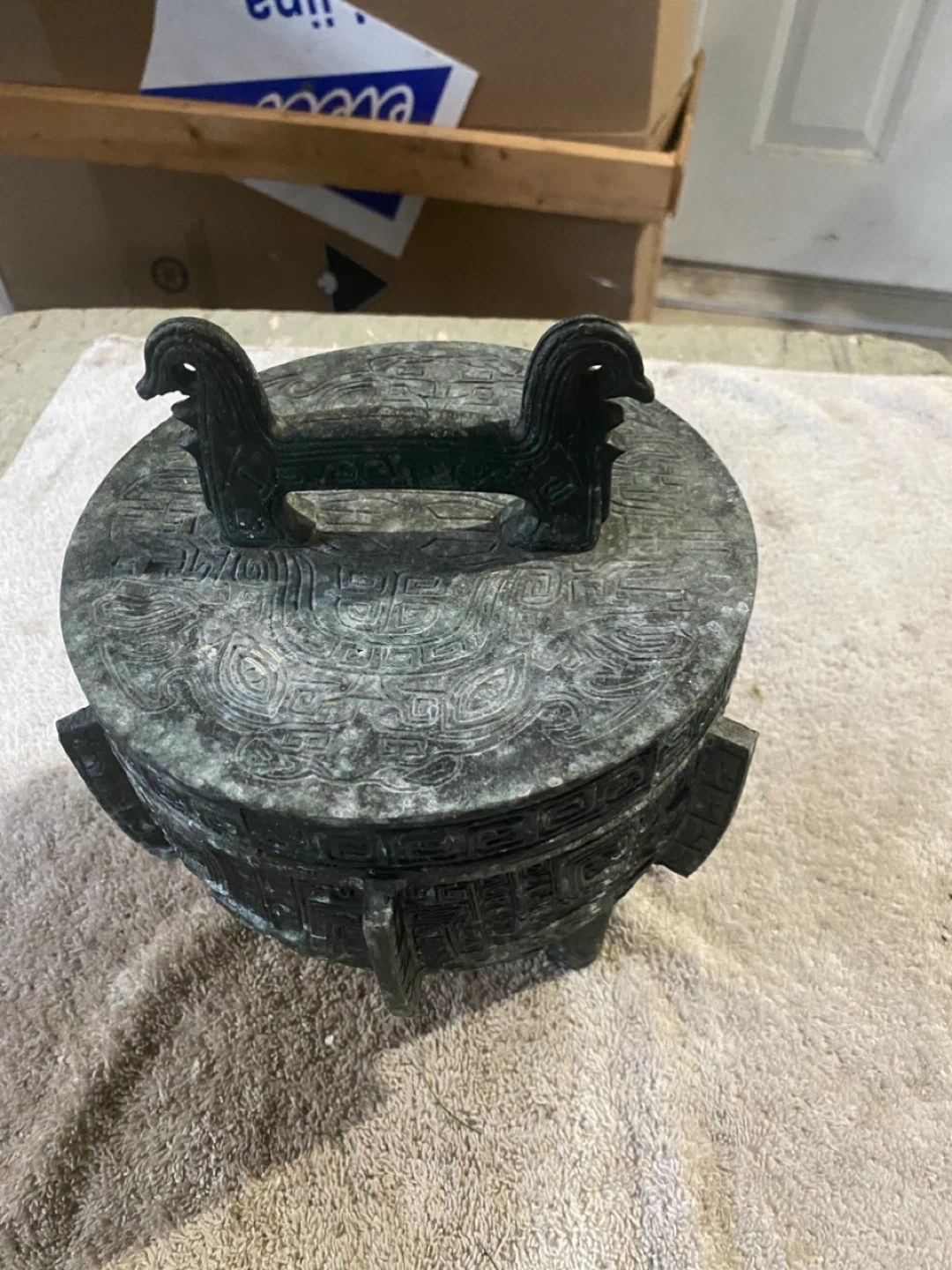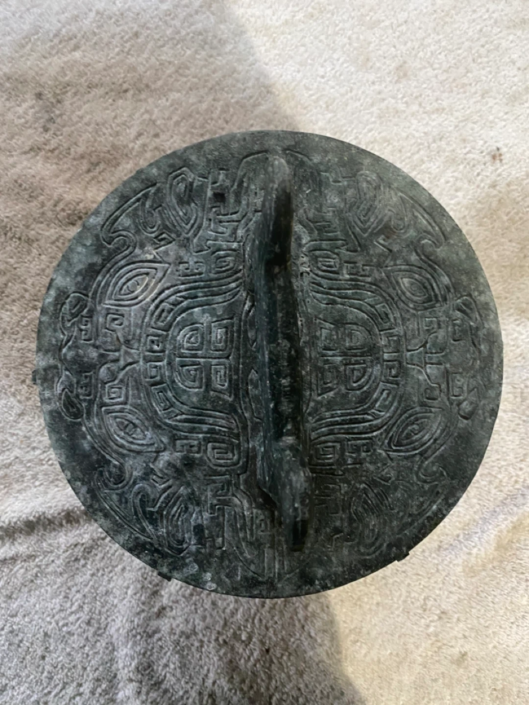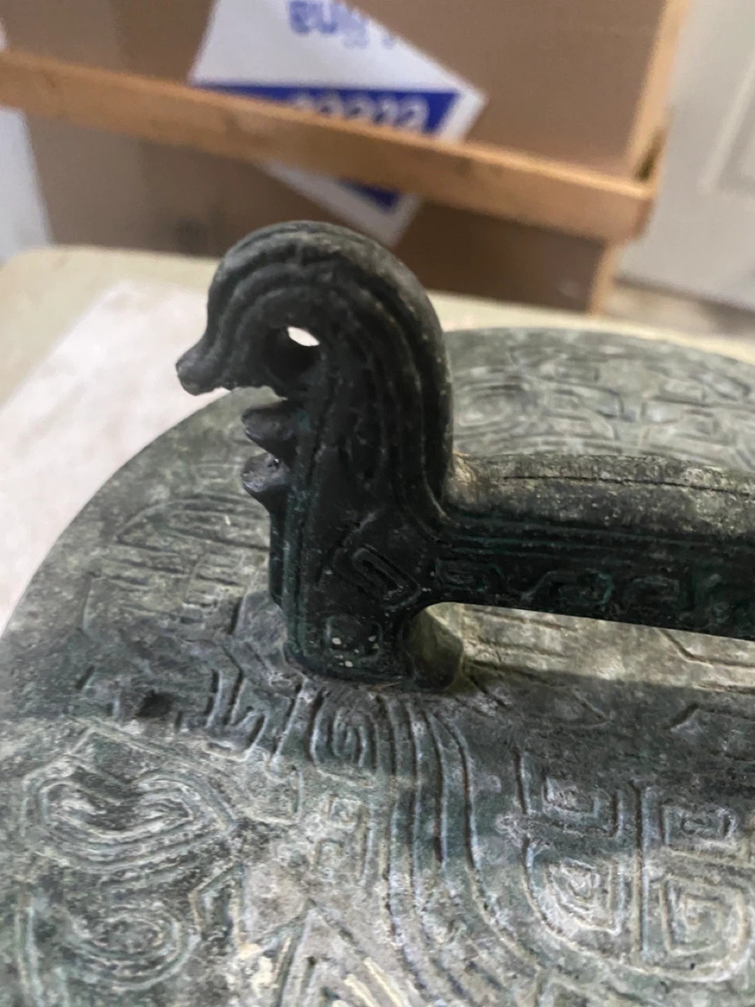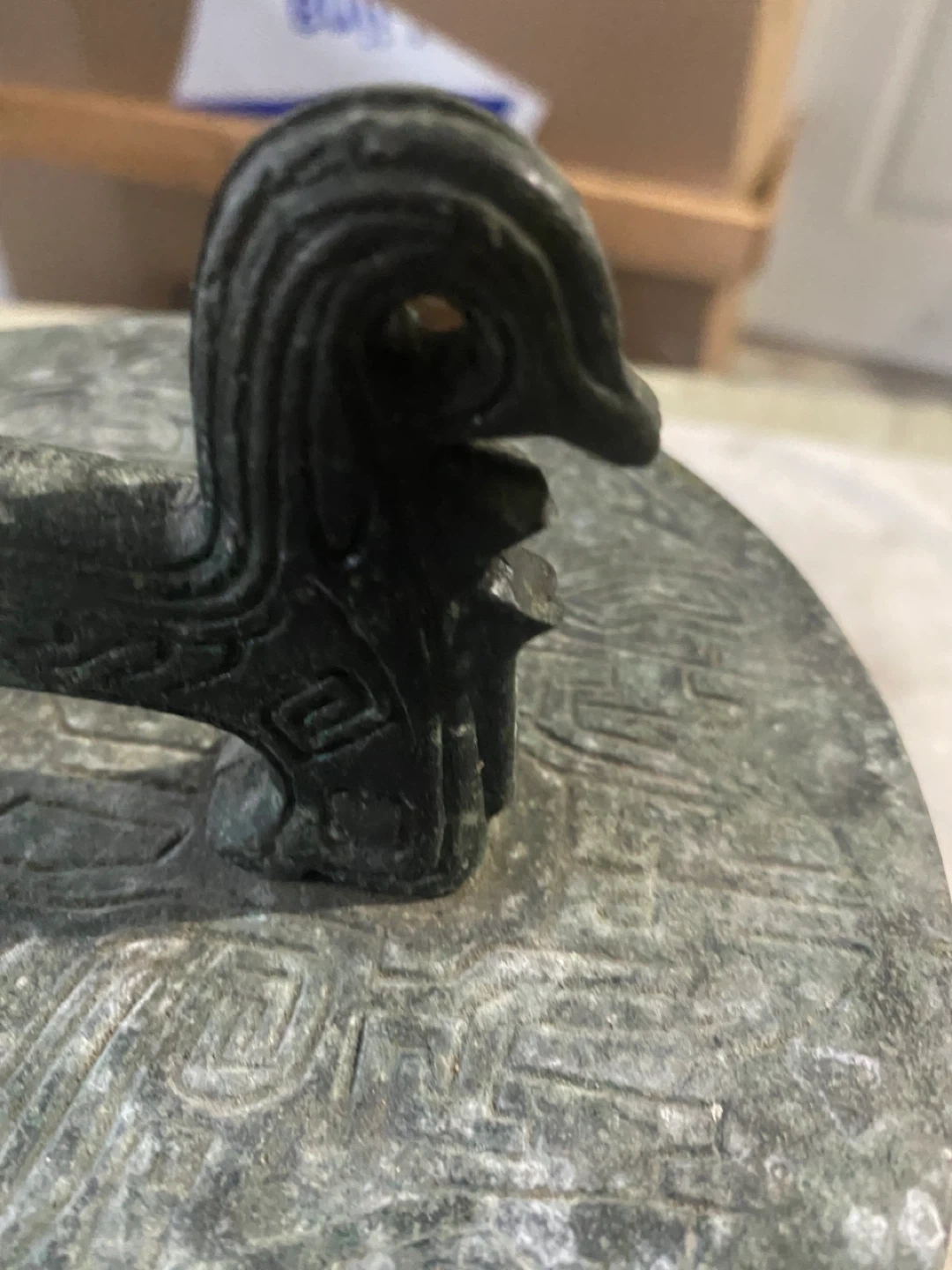 The design is heavily embossed with patterns inspired by Chinese, Asian, or Mayan/Aztec art, and it has a verdigris bronze finish.