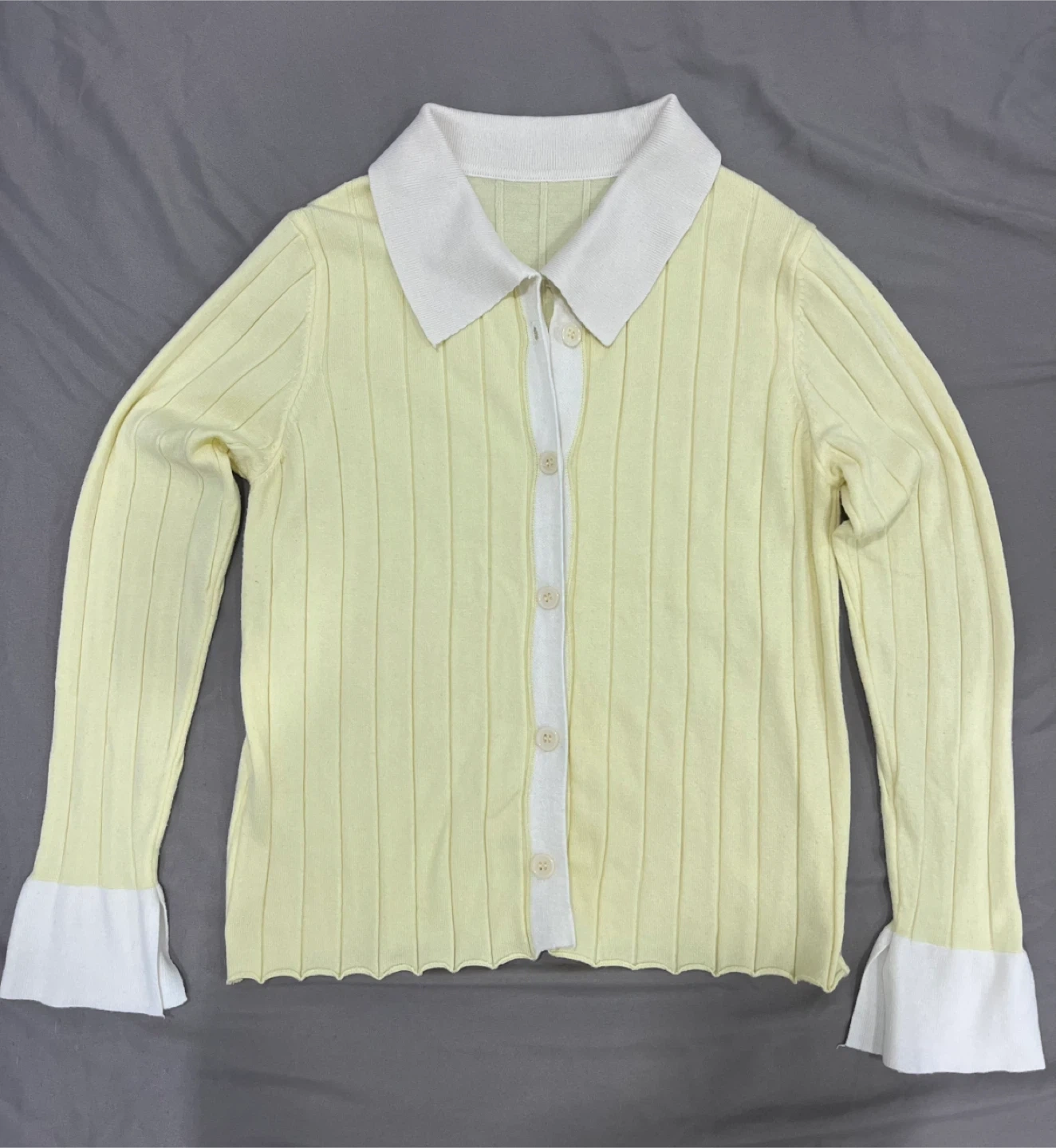 Selling a cute yellow knit cardigan with a white collar and cuffs. It's in great condition!