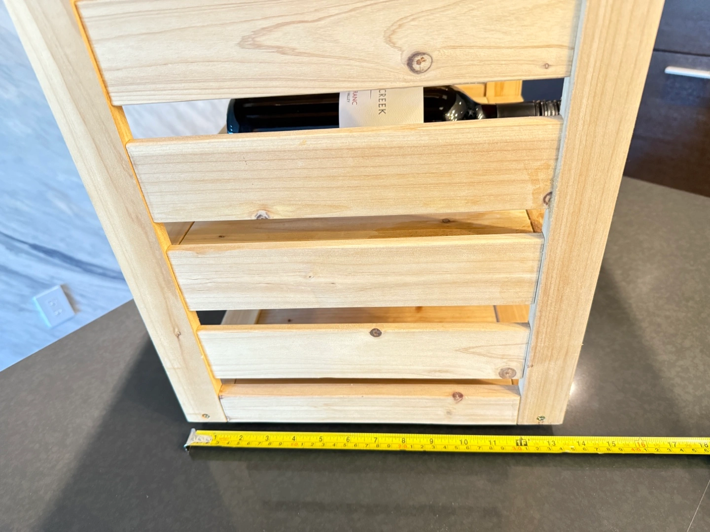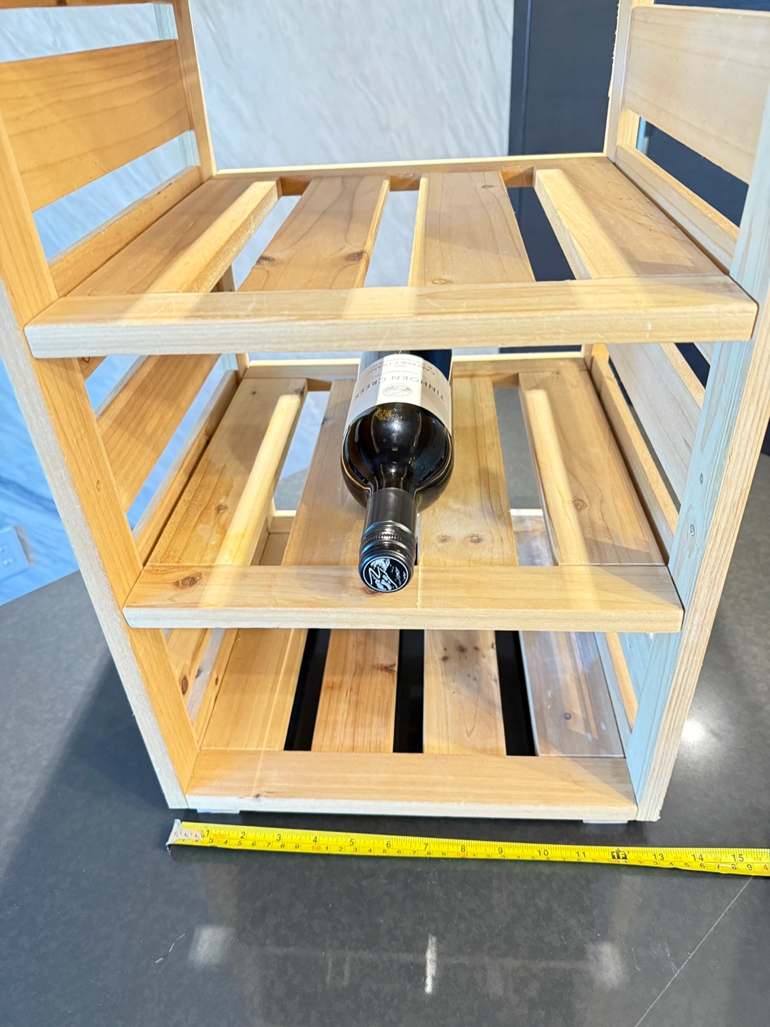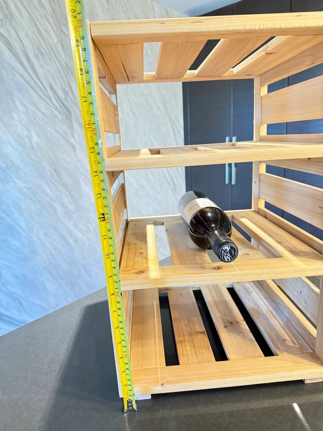 481Selling a wooden wine rack shelf! It has three tiers and is perfect for storing your wine collection. The dimensions are approximately 25 inches tall, 17 inches wide, and 11 inches deep. It's in great condition and ready for a new home