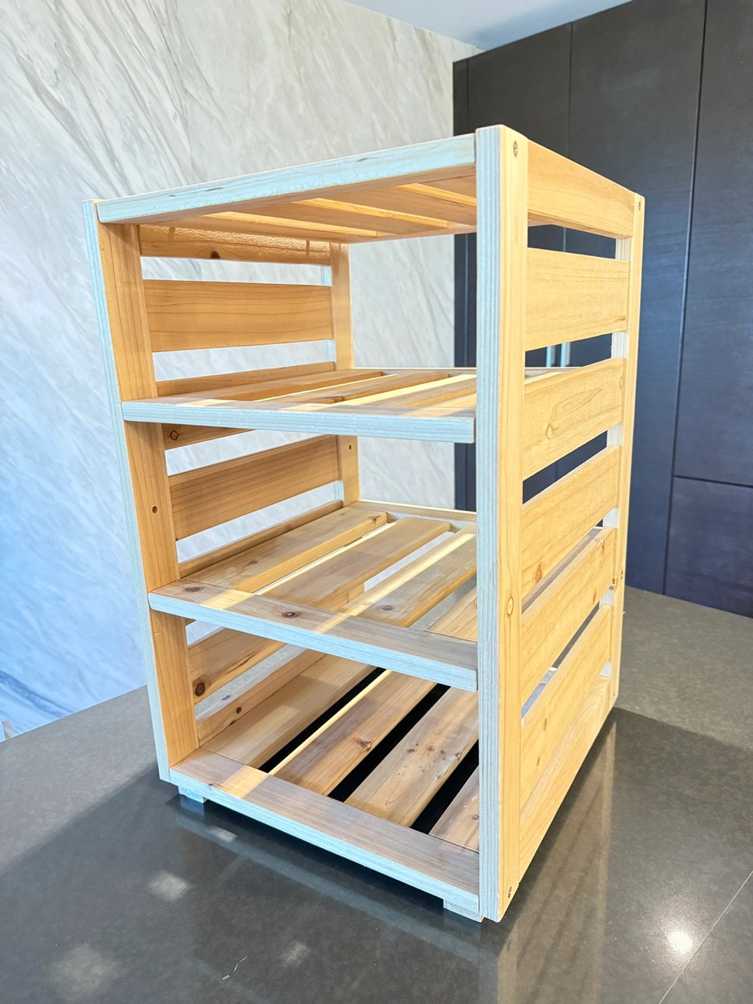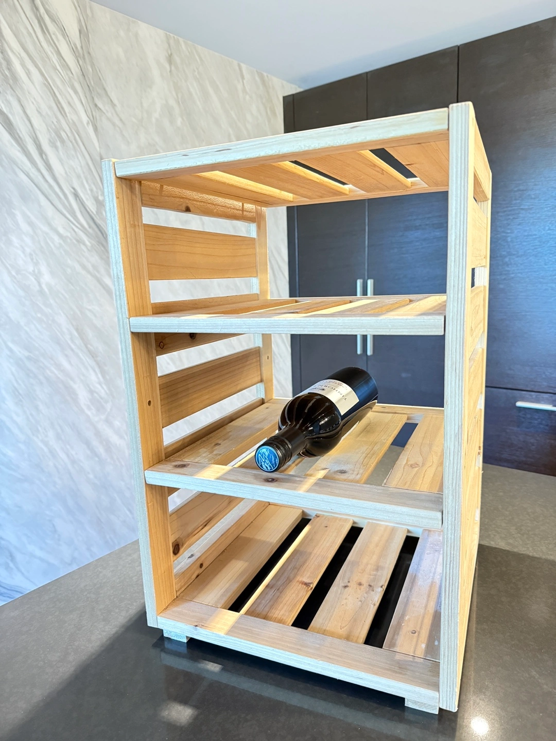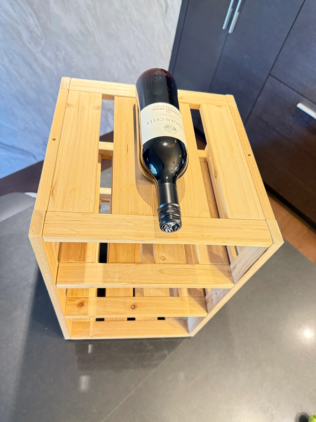 481Selling a wooden wine rack shelf! It has three tiers and is perfect for storing your wine collection. The dimensions are approximately 25 inches tall, 17 inches wide, and 11 inches deep. It's in great condition and ready for a new home