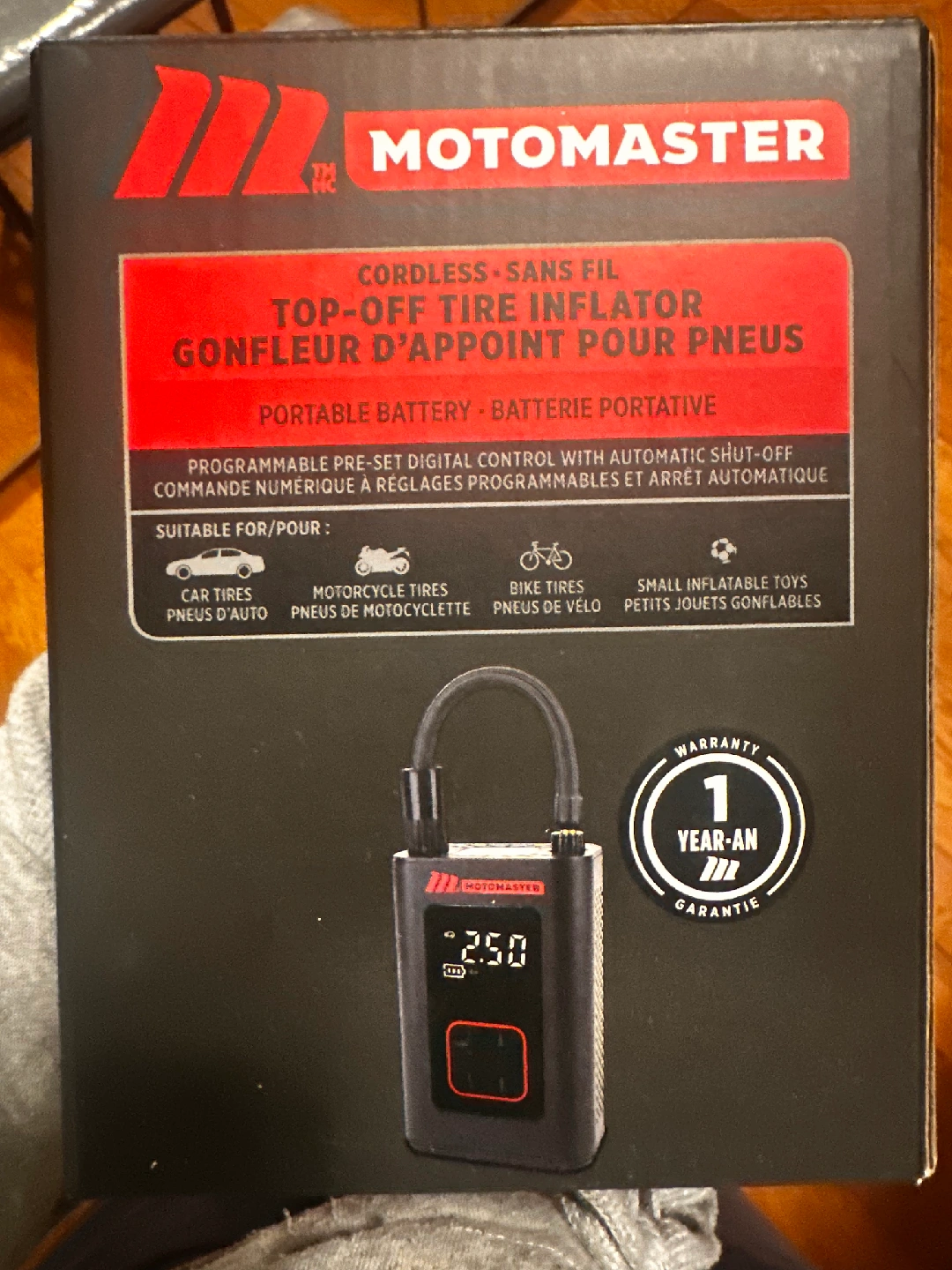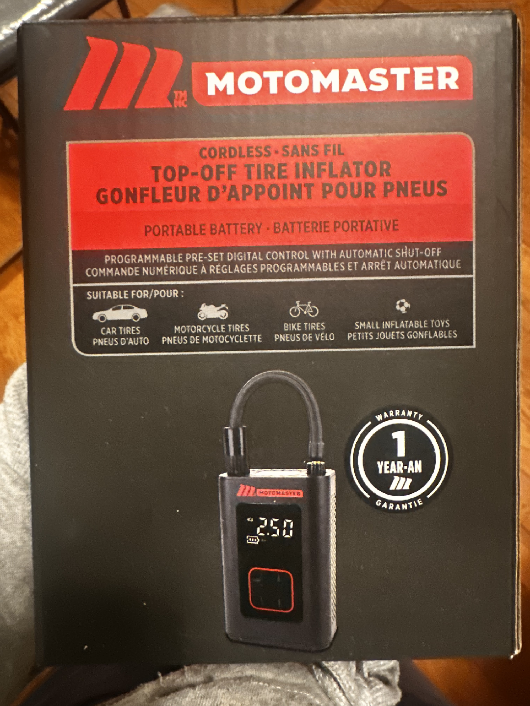 Selling a brand new MotoMaster Cordless Top-Off Tire Inflator still in its original box!