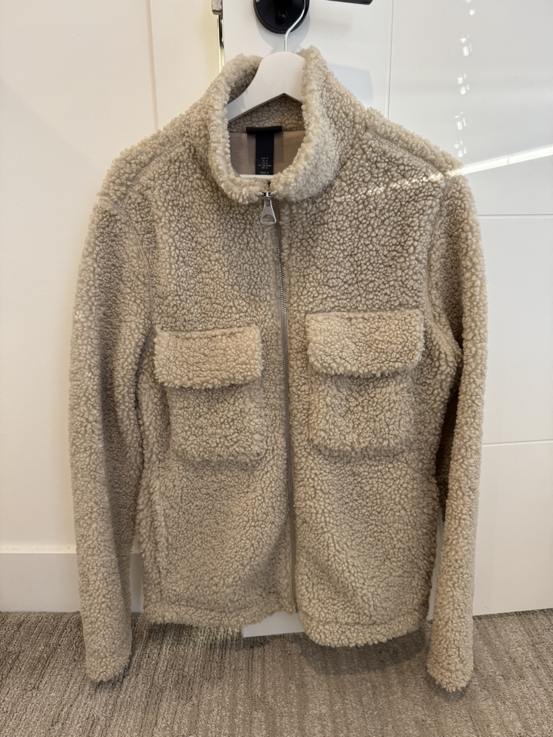 Cozy up with this H&M fleece jacket! It's a regular fit and super comfy for those chilly days. The jacket is a beige colour and a size M. Perfect for layering or just wearing on its own