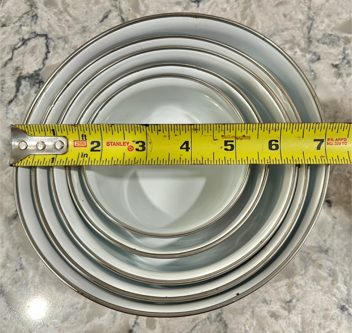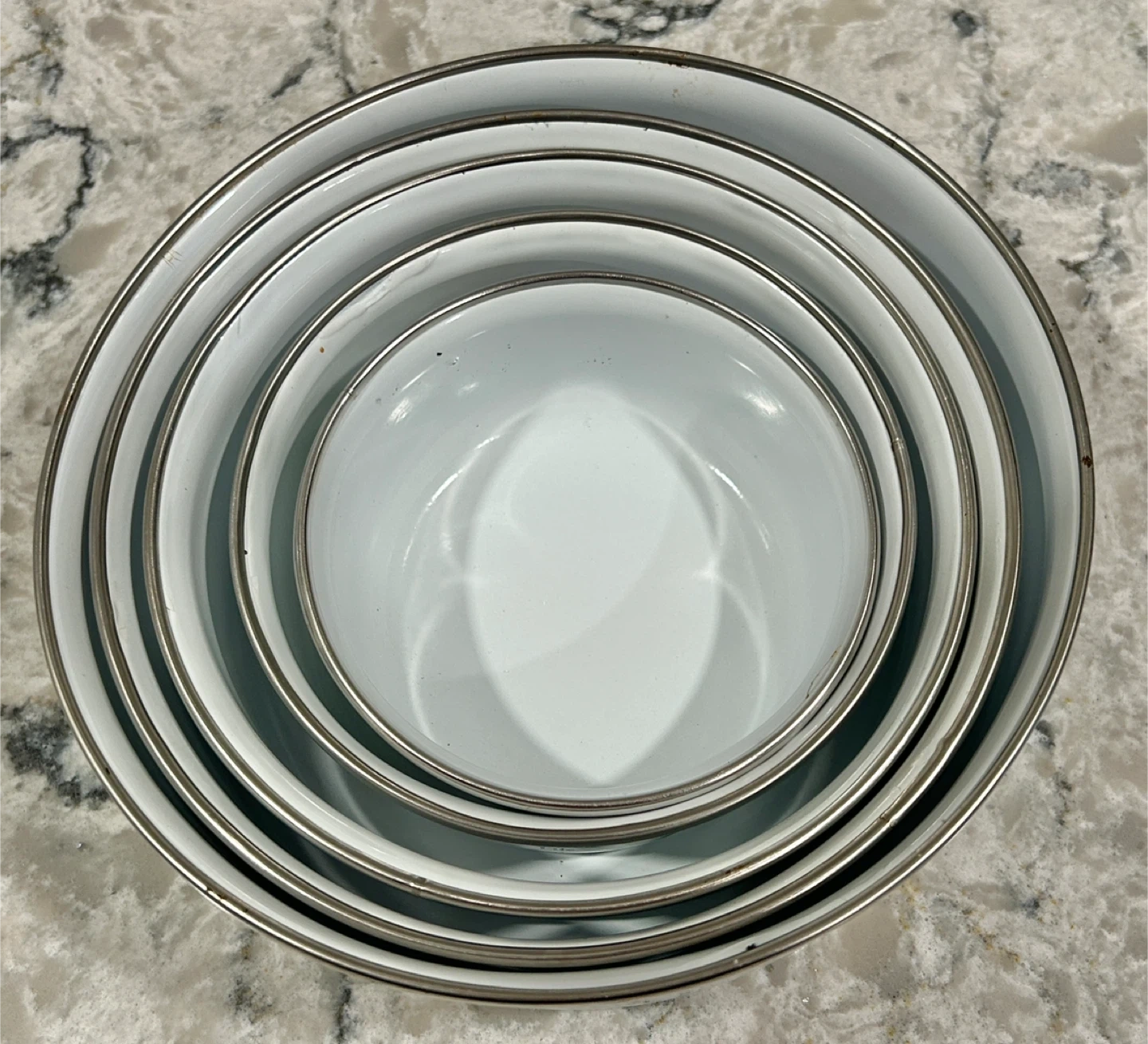 They're made of enamelware and nest neatly inside each other for easy storage.
