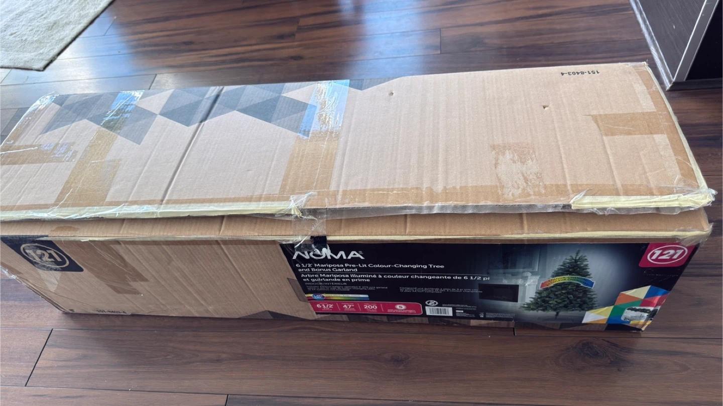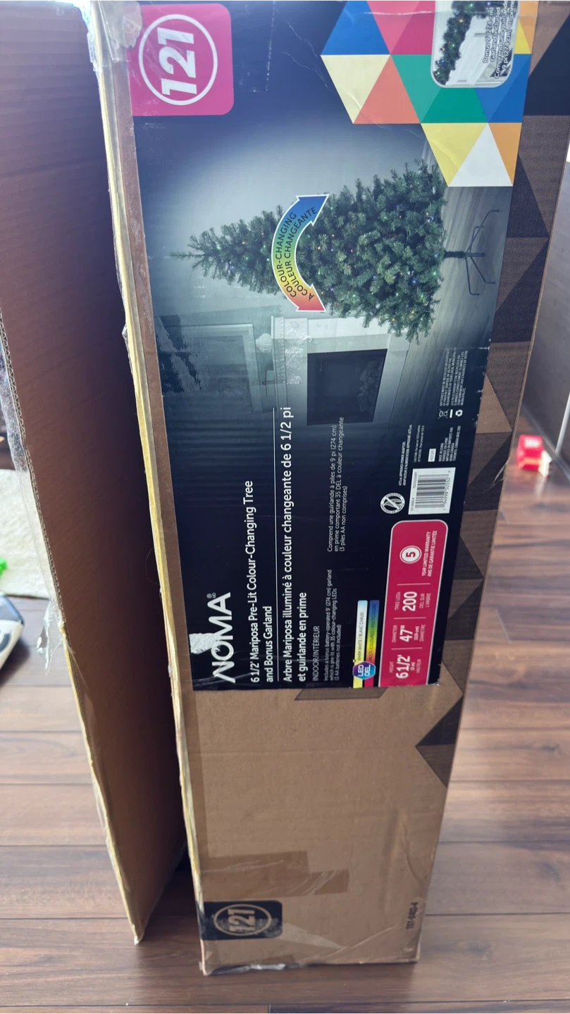 Selling a NOMA 6 1/2' Mariposa Pre-Lit Colour-Changing Tree and bonus garland. It's an indoor/interior tree that is pre-lit with 35 colour-changing LEDs. Please note that the 3 AA batteries are not included.