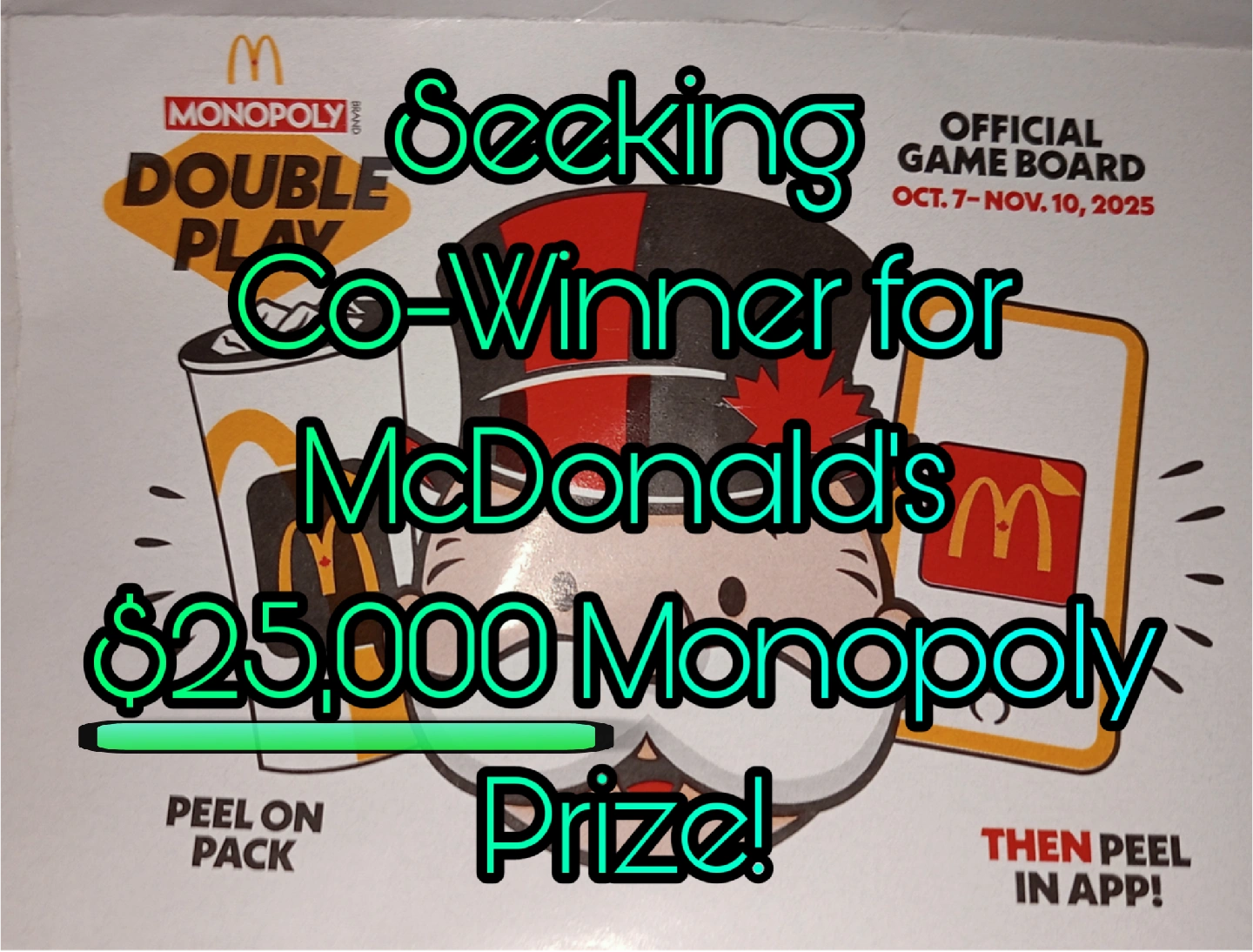 Seeking someone to co-win the McDonald's $25,000 Monopoly prize! Official game. Partner Up to Claim $25K Monopoly Prize! Your Monopoly Piece + My Monopoly Piece = (half of) $25,000. Let's Connect! Missing piece needed is : #721- FAIRMONT LE CHĀTEAU.