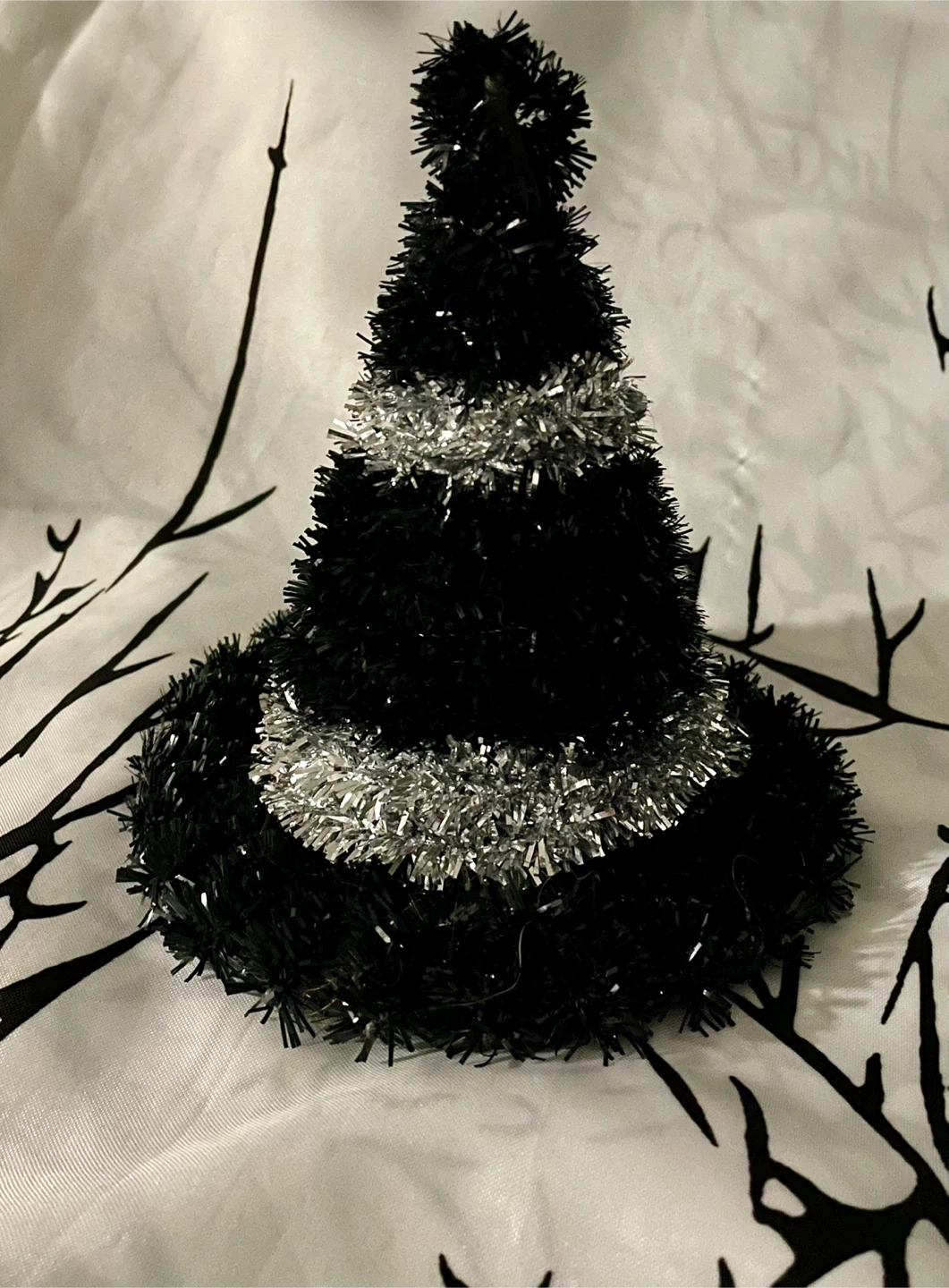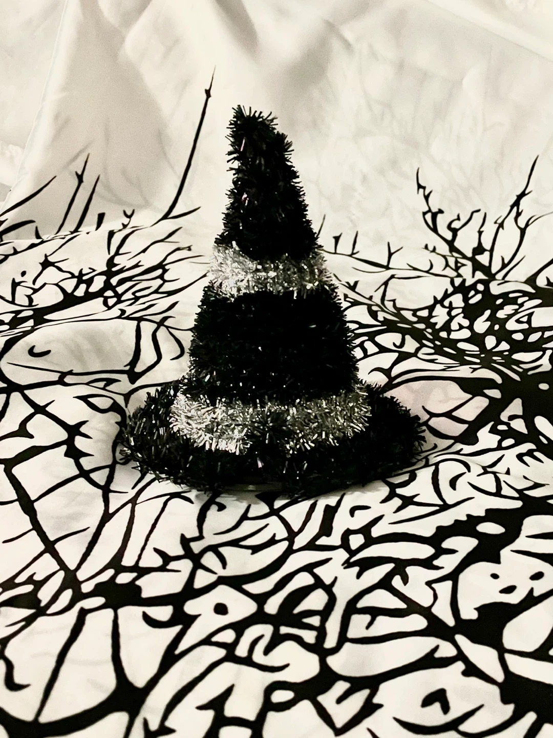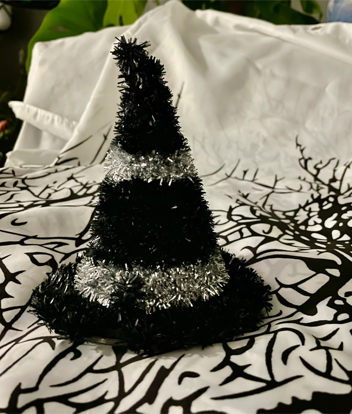 169This is a cute little witch hat decoration, perfect for Halloween or just adding a bit of spooky fun to your decor! It's black with silver tinsel accents. Definitely cute