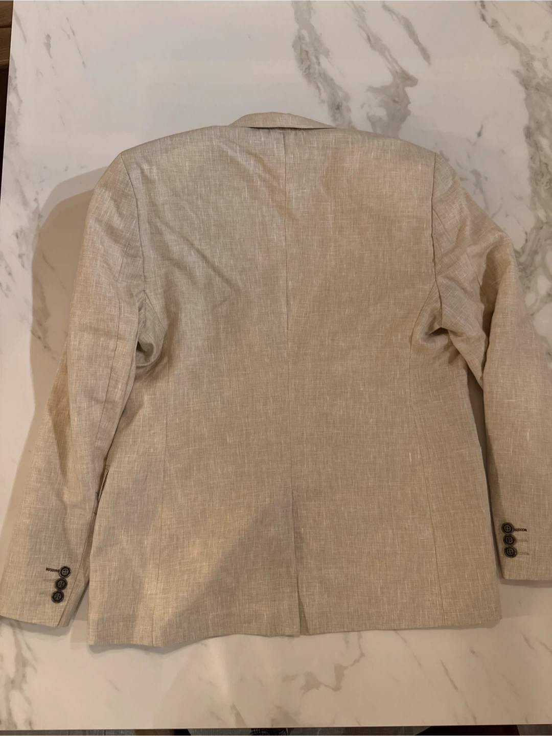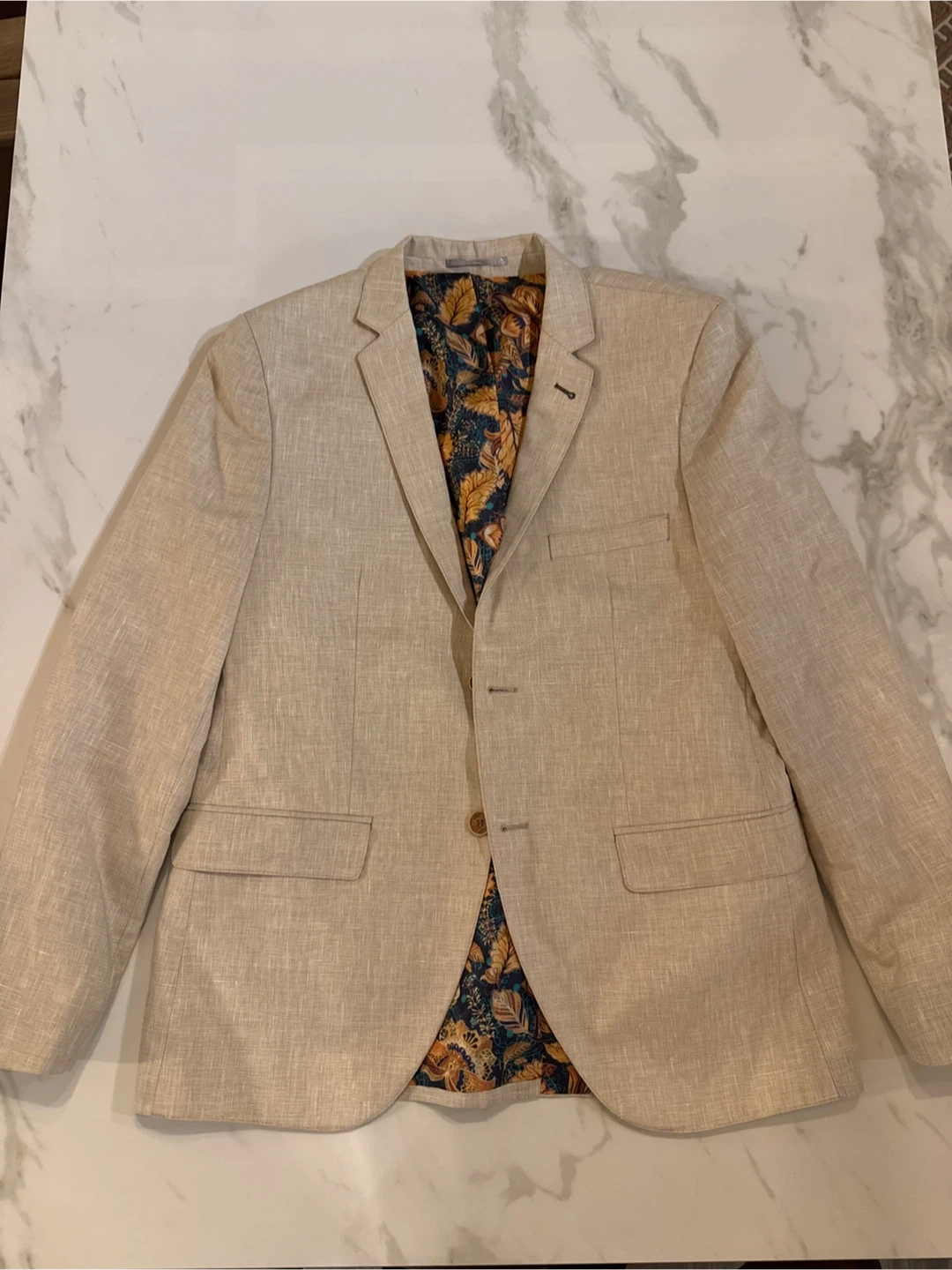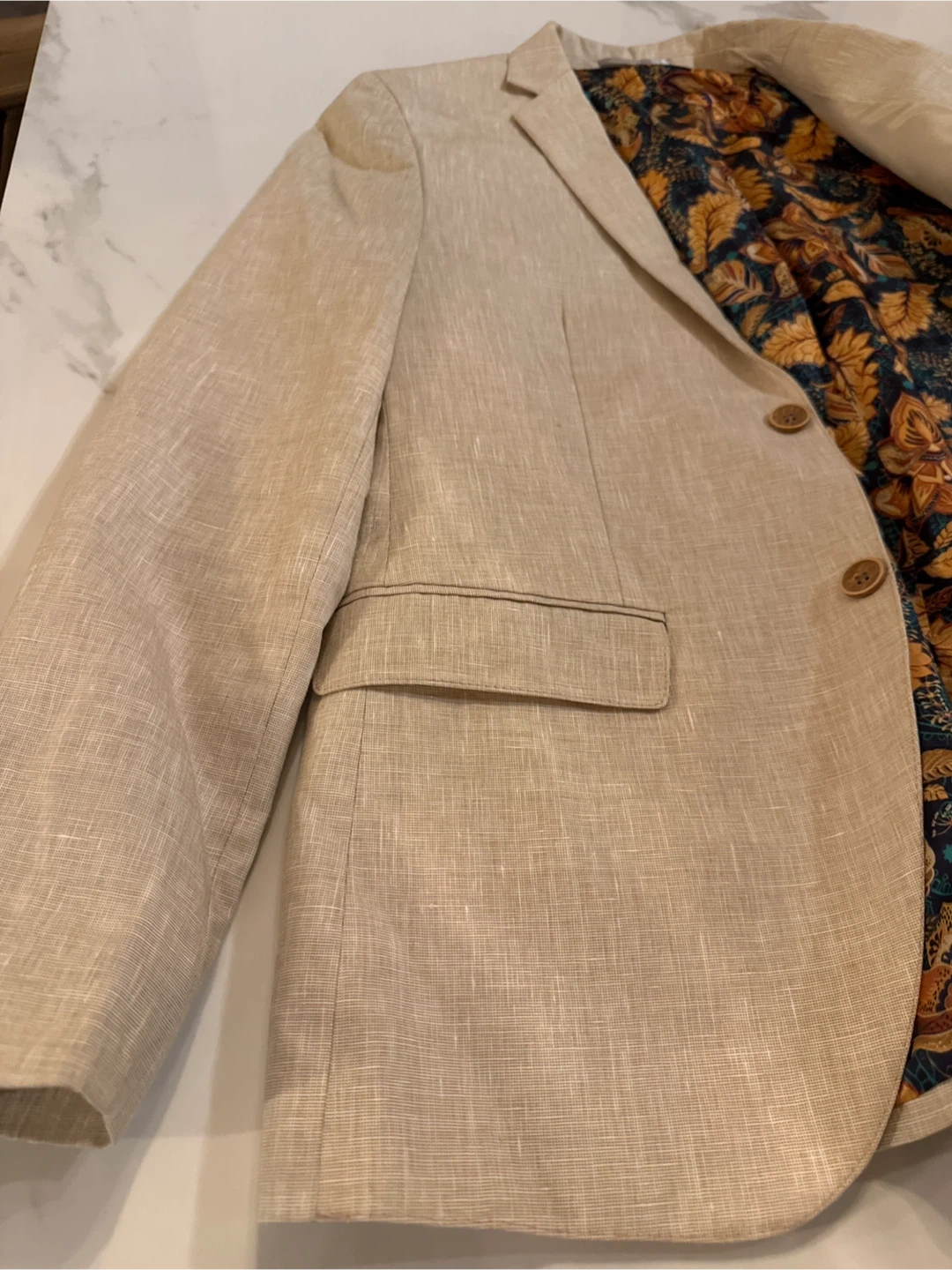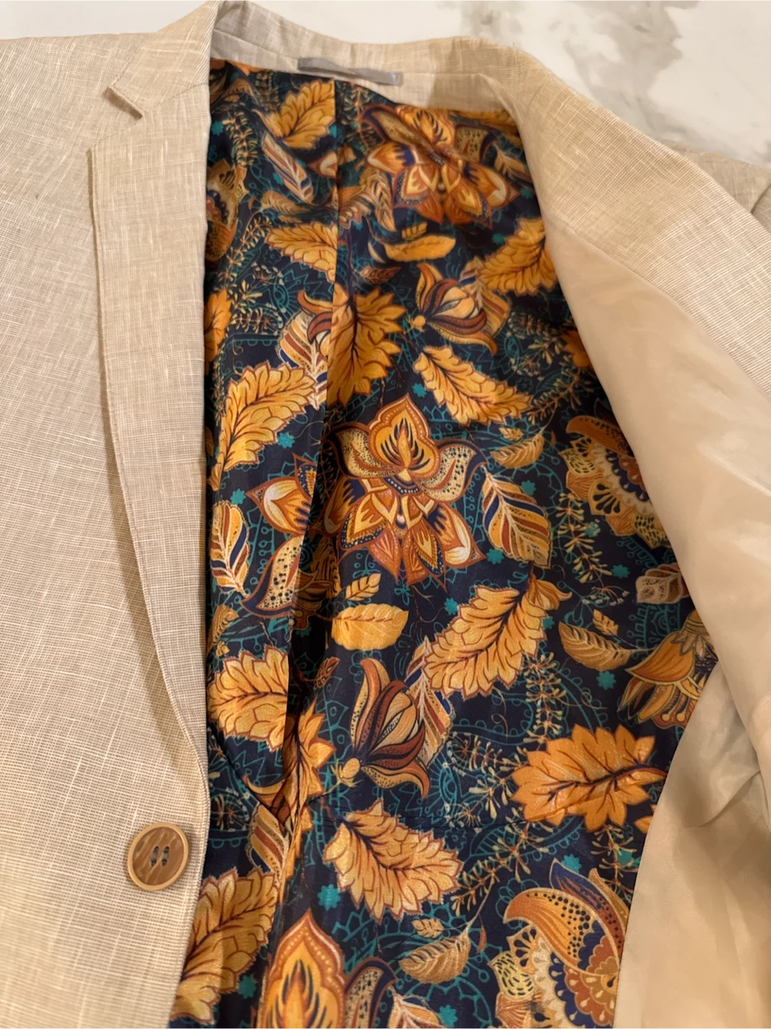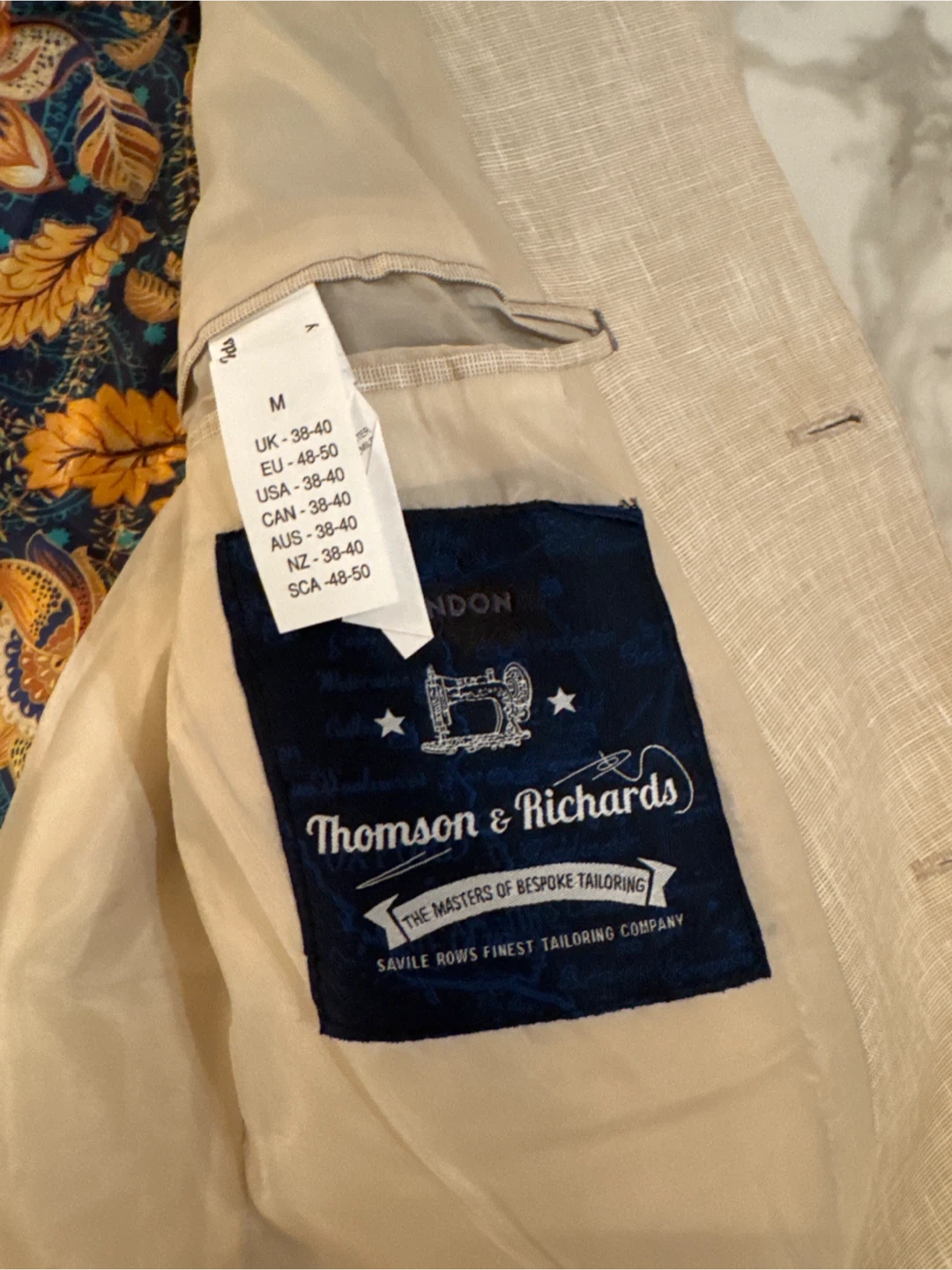 Selling a Thomson & Richards blazer in a light beige linen. It's a size medium and features a beautiful patterned lining. Perfect for a smart casual look!