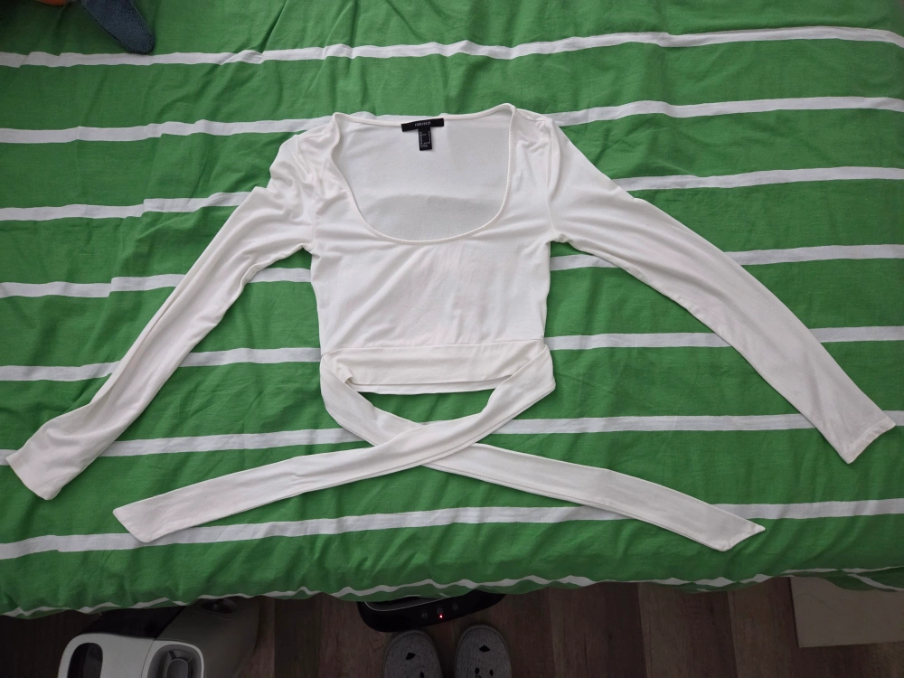 A cute and stylish white long sleeve wrap top from Forever 21! Size small and in great condition. Perfect for layering or wearing on its own. It has a flattering neckline and a comfortable fit, and can be wrapped/tied however youd like