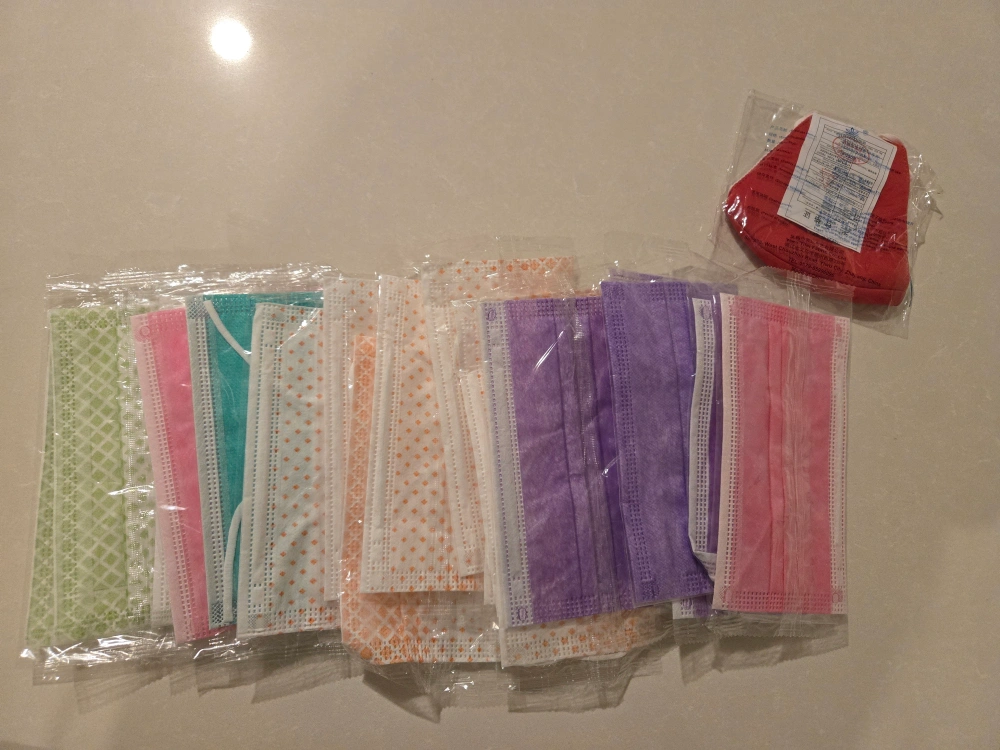 A collection of individually wrapped disposable face masks in various colours and patterns. Includes green, pink, turquoise, orange, purple, and pink masks. Also comes with a red reusable cloth mask.