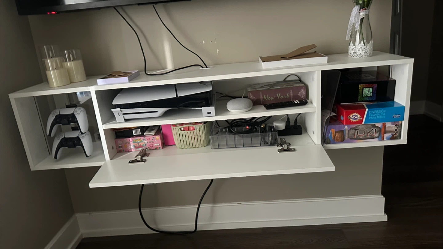 Selling a white floating TV stand ! It's perfect for mounting under your TV to hold consoles, streaming devices, and more.