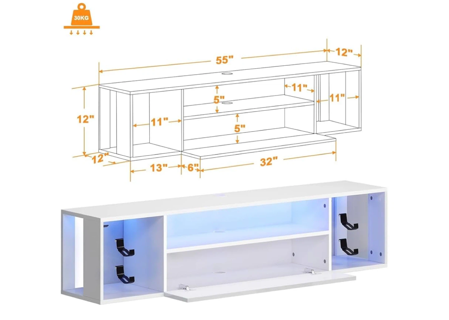 It measures 55 inches wide, 12 inches high, and 12 inches deep. The middle shelves are 11 inches high and 5 inches deep, with a drop-down door that's 32 inches wide and 13 inches high. It also features LED backlights!
