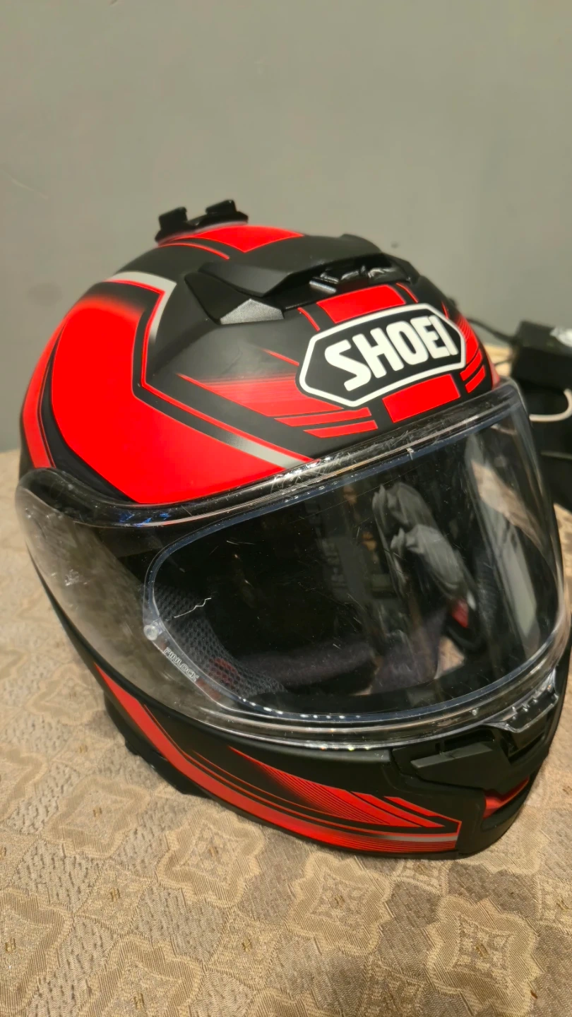 Full-face Shoei motorcycle helmet in a red and black colourway. It features a clear visor and a secure chin strap. This helmet offers excellent protection for riders.