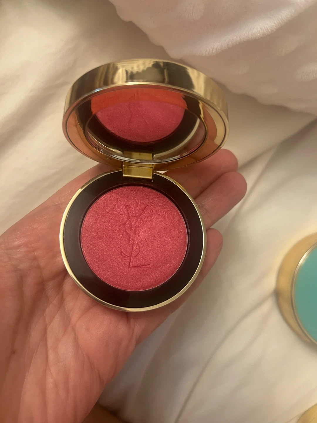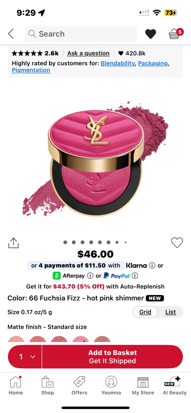 This is the Yves Saint Laurent Rouge Volupté Shimmer Blush in the shade 66 Fuchsia Fizz. It's a hot pink shimmer shade with a matte finish. The compact contains 0.17 oz / 5 g of product.