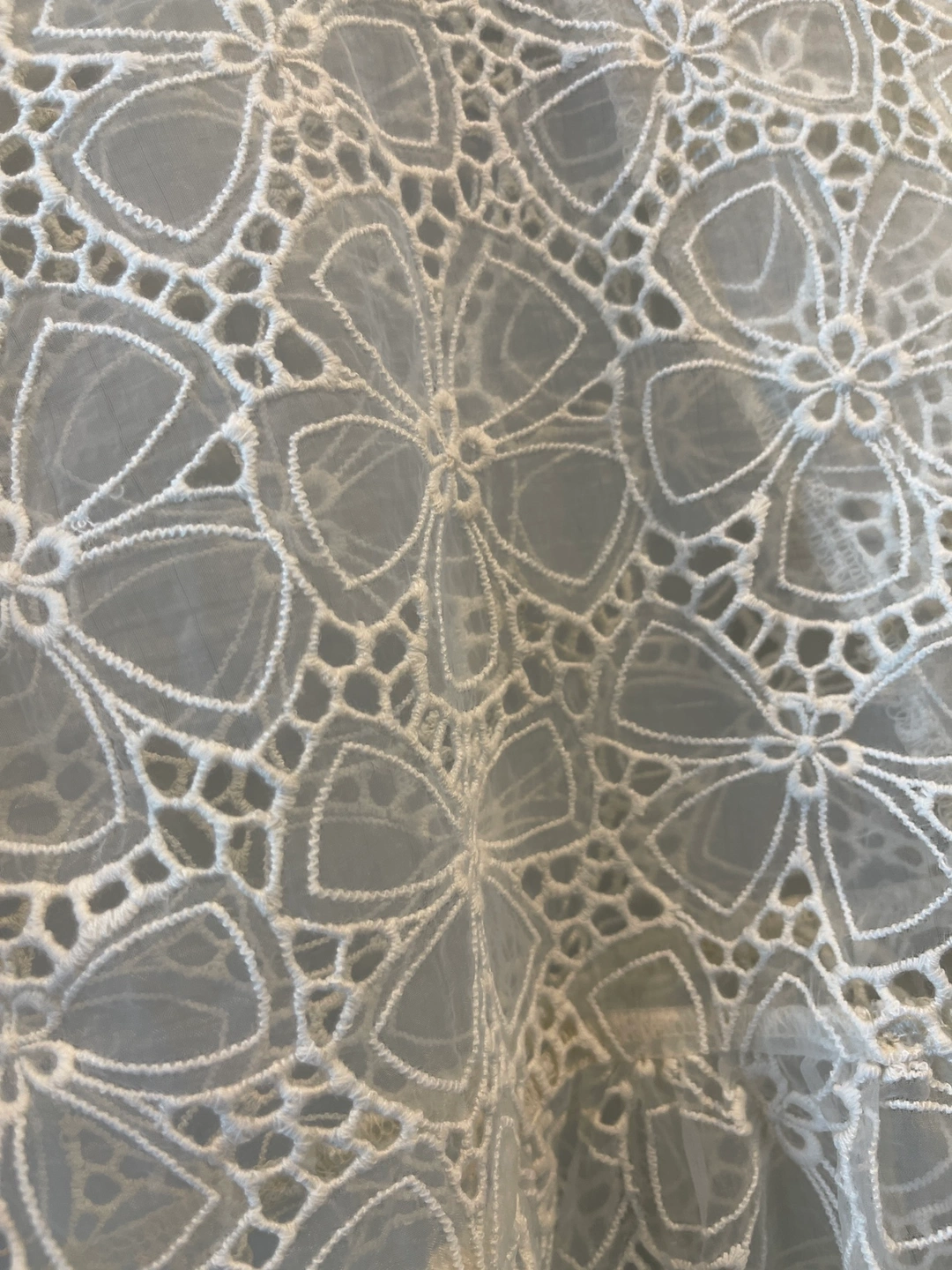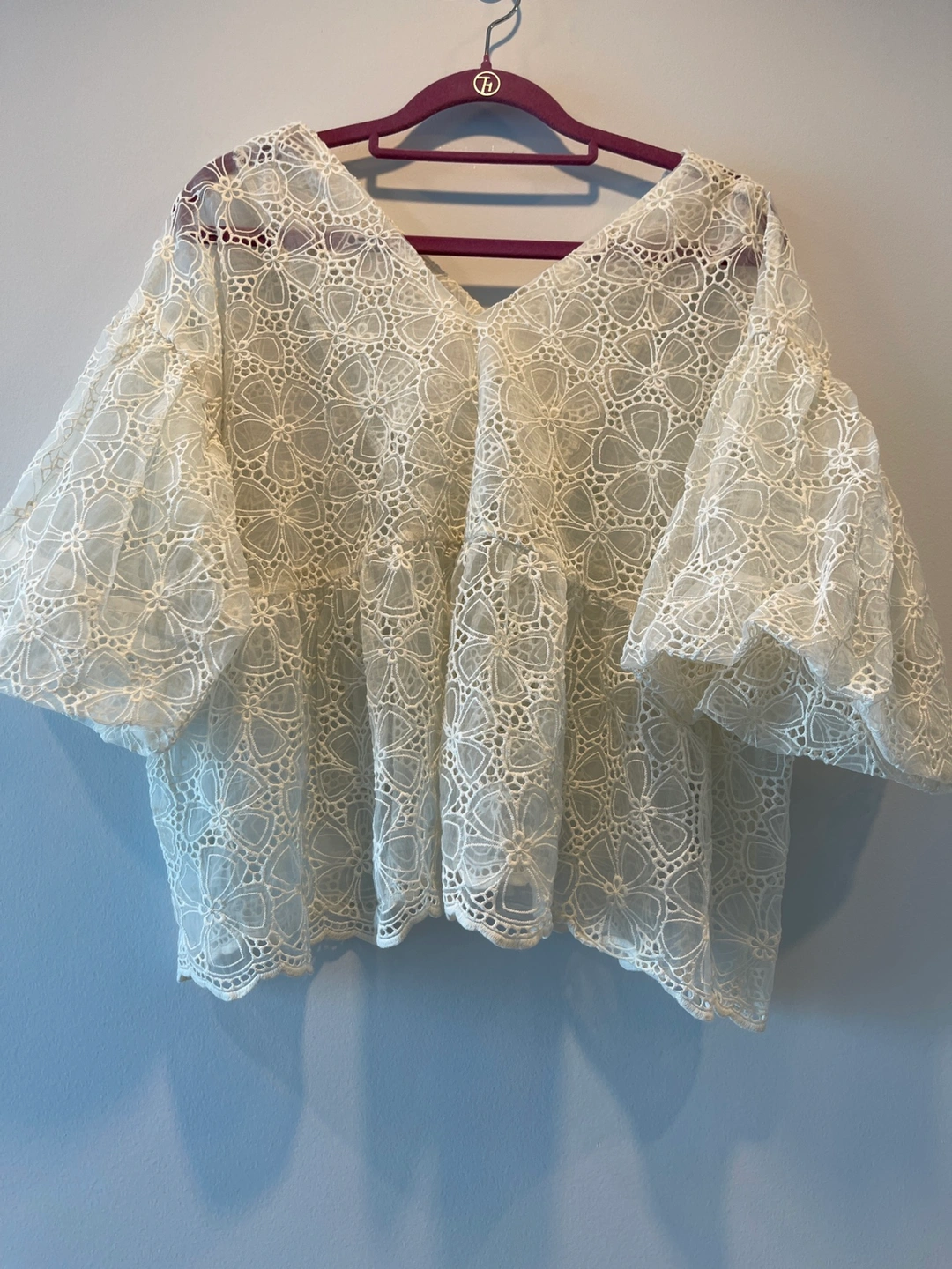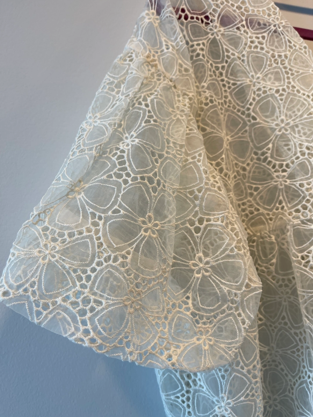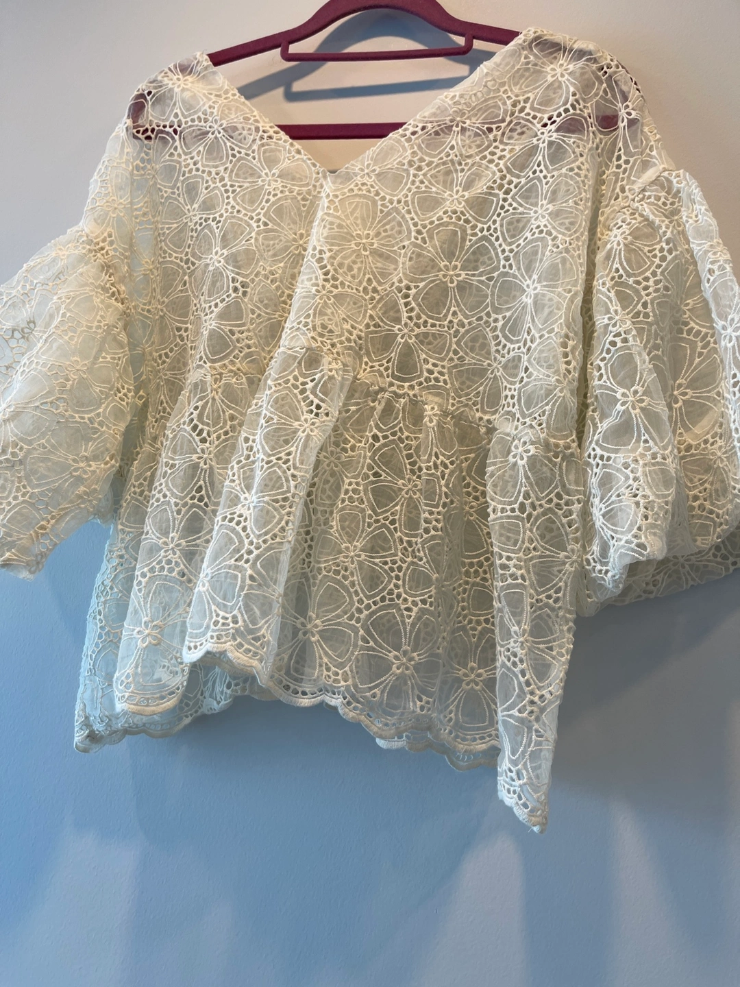 A delicate, sheer, and very feminine white blouse. The fabric is a soft cotton lace with a floral design. The blouse has a v-neck and short puffed sleeves. The bodice is fitted and the blouse flows out from the waist. It is perfect for dressing up a casual outfit or for a special occasion.