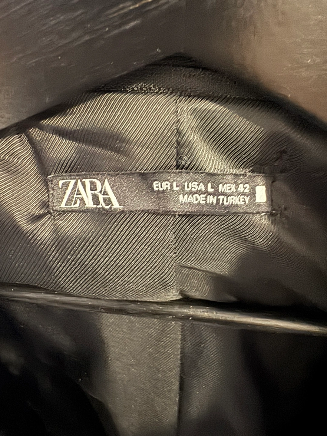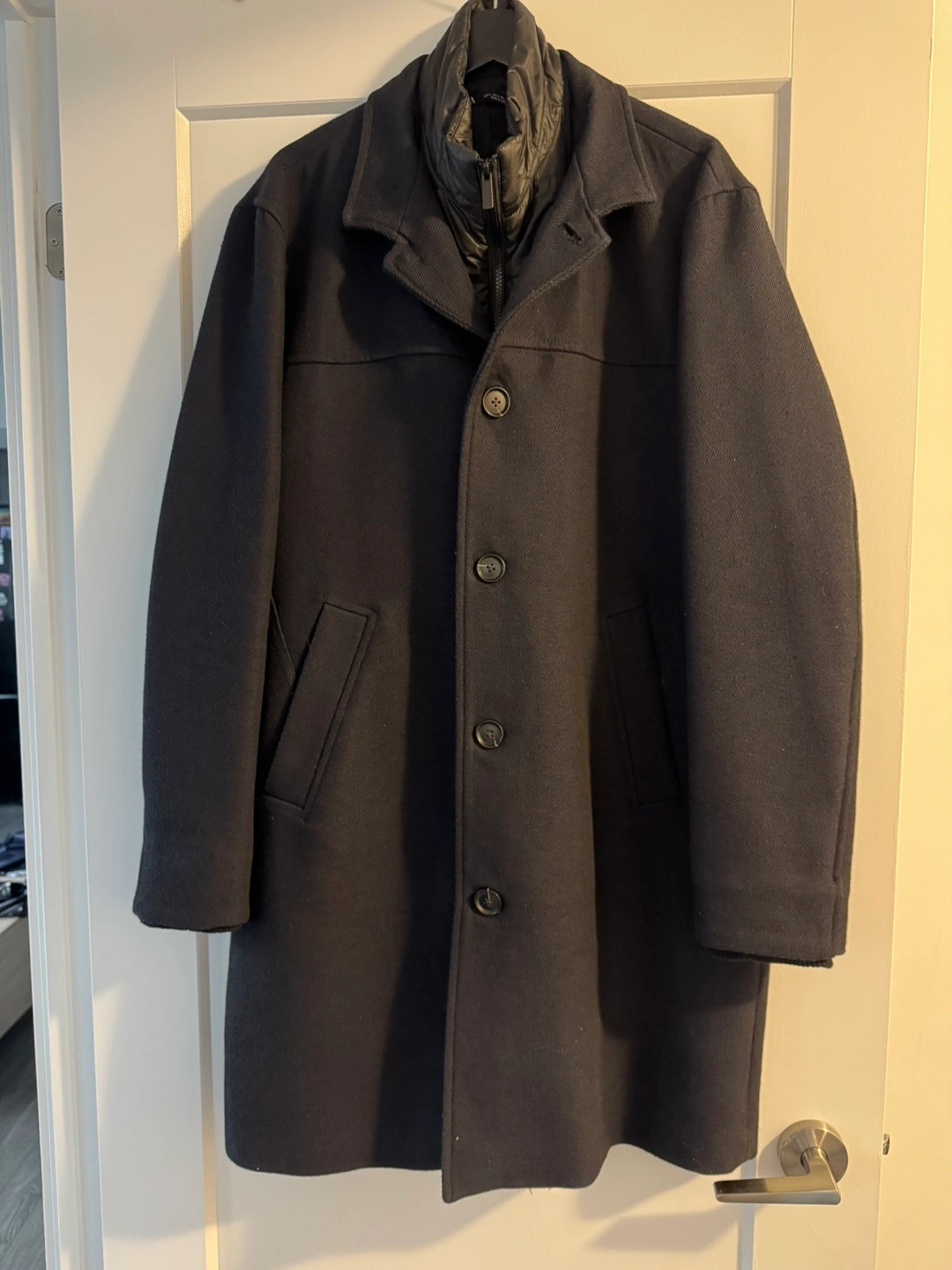 This Zara coat features a classic wool blend outer shell and a detachable quilted vest for extra warmth. It's a size Large,It's great for keeping you warm during colder weather.