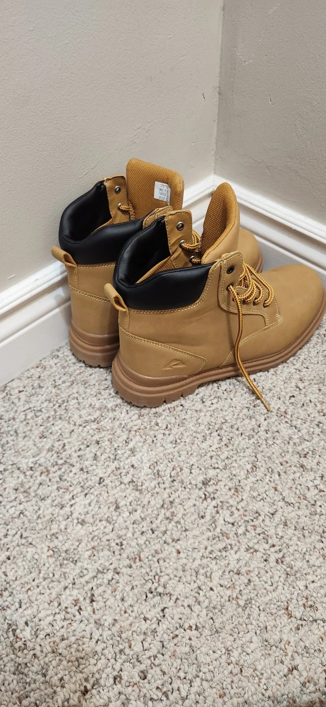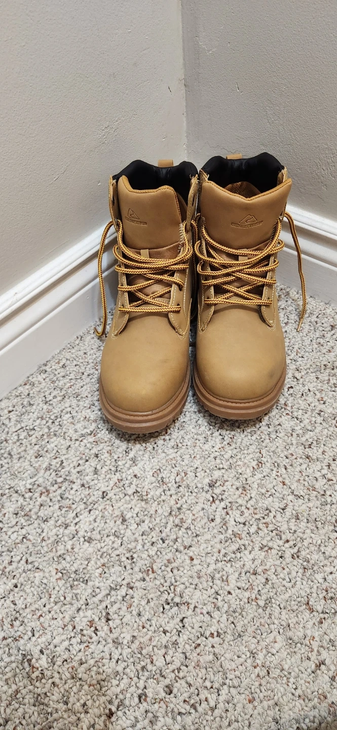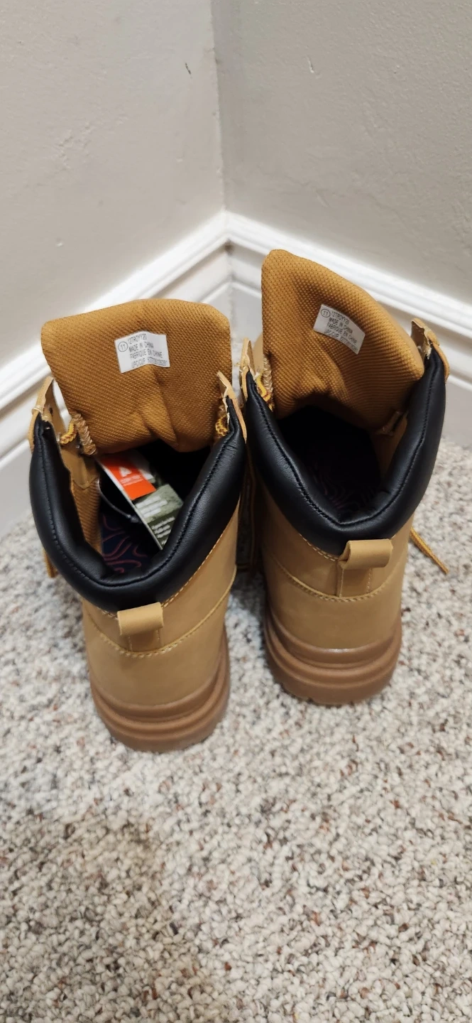 Brand New. Ozark Trail. These tan work boots are a size 11. They're made in China with a durable sole. These boots are suitable for demanding job sites.