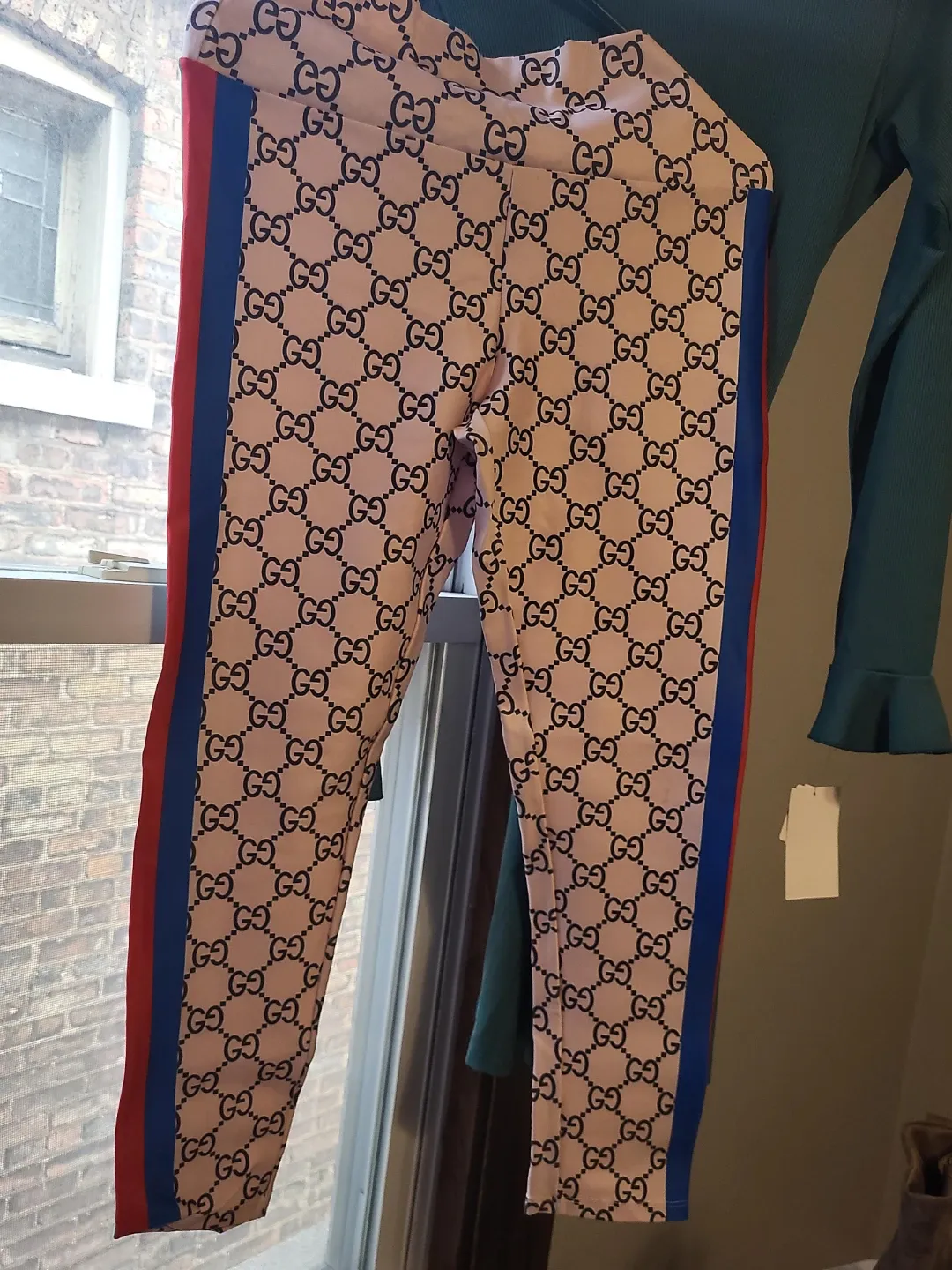 Selling a pair of Gucci patterned leggings. They feature a repeating Gucci logo design and have red and blue stripes down the sides. Perfect for adding a touch of designer style to your wardrobe!