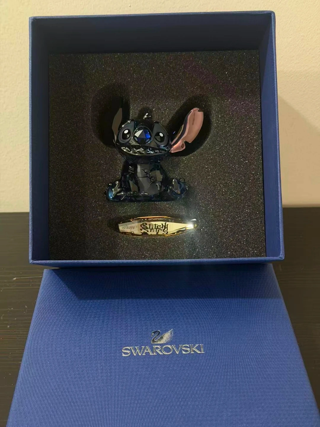 This Swarovski crystal figurine features the beloved Disney character Stitch. It's crafted with dazzling blue crystals and includes a gold-tone accent piece with 'Stitch' inscribed. Comes in its original Swarovski box brand new.