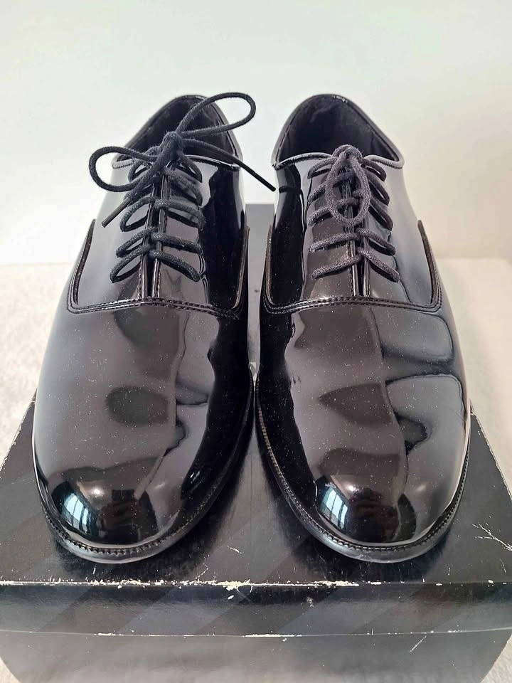 Shiny black patent leather formal shoes. Freeman Formalwear brand. Size 9M. Great for any formal event or tuxedo outfit.