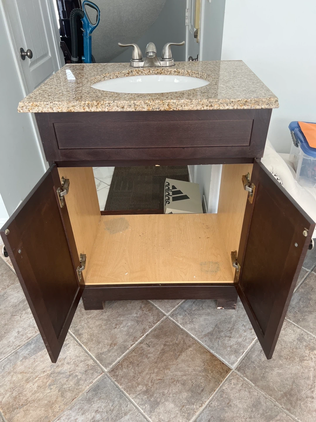 This is a dark wood bathroom vanity with a granite countertop and a white sink. It features two cabinet doors for storage. The top is speckled granite.
