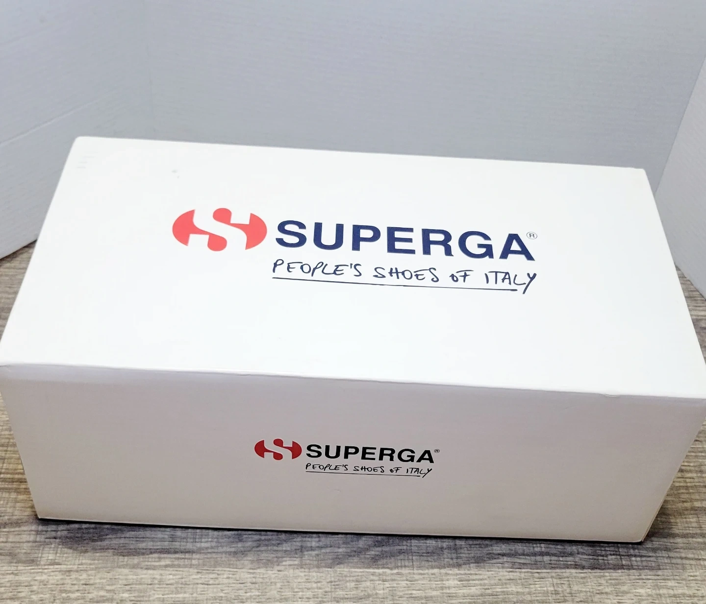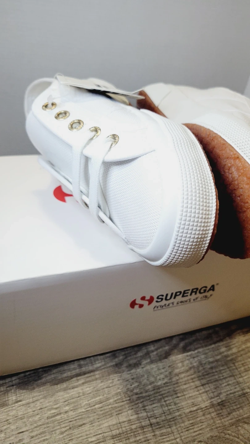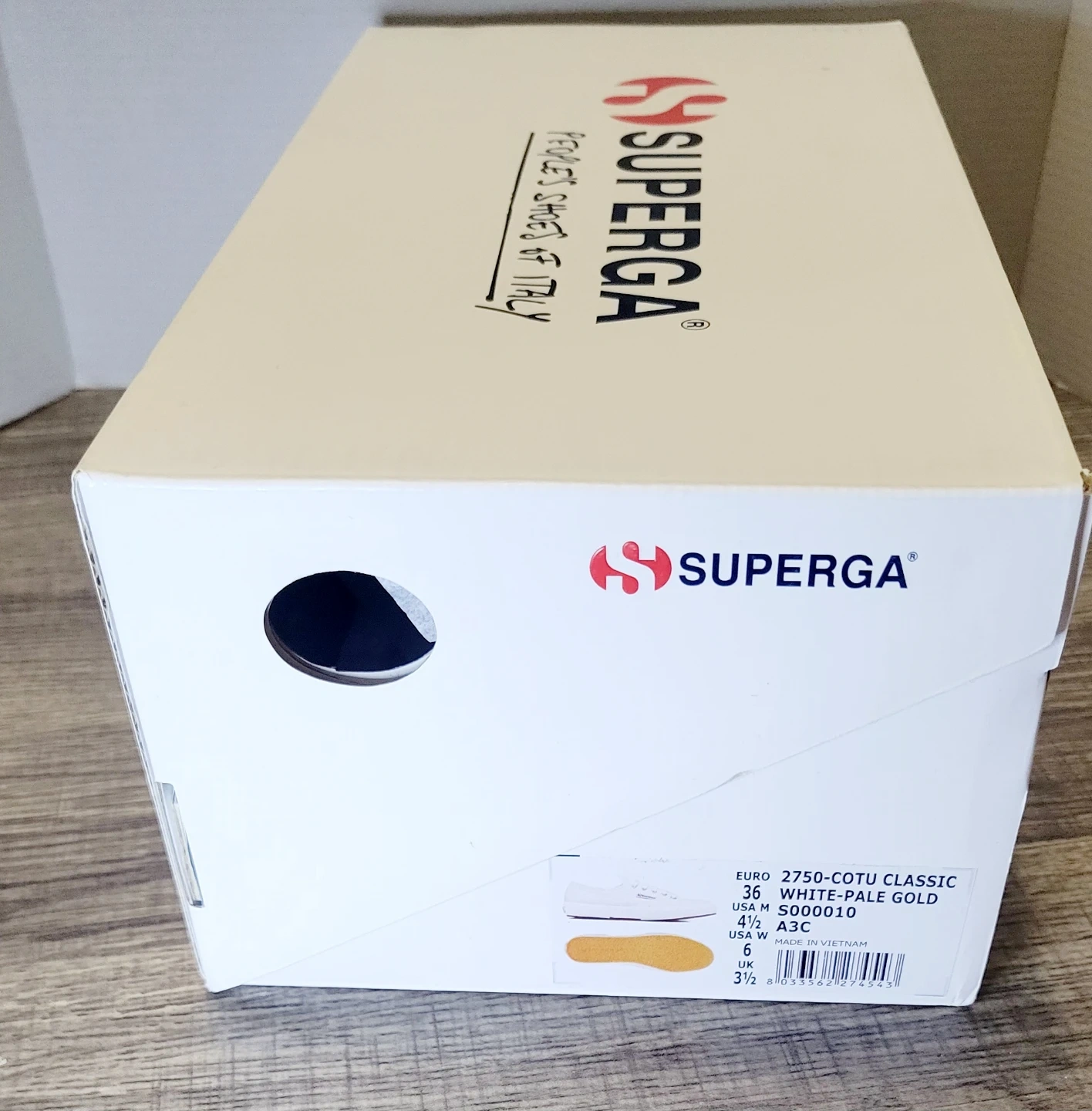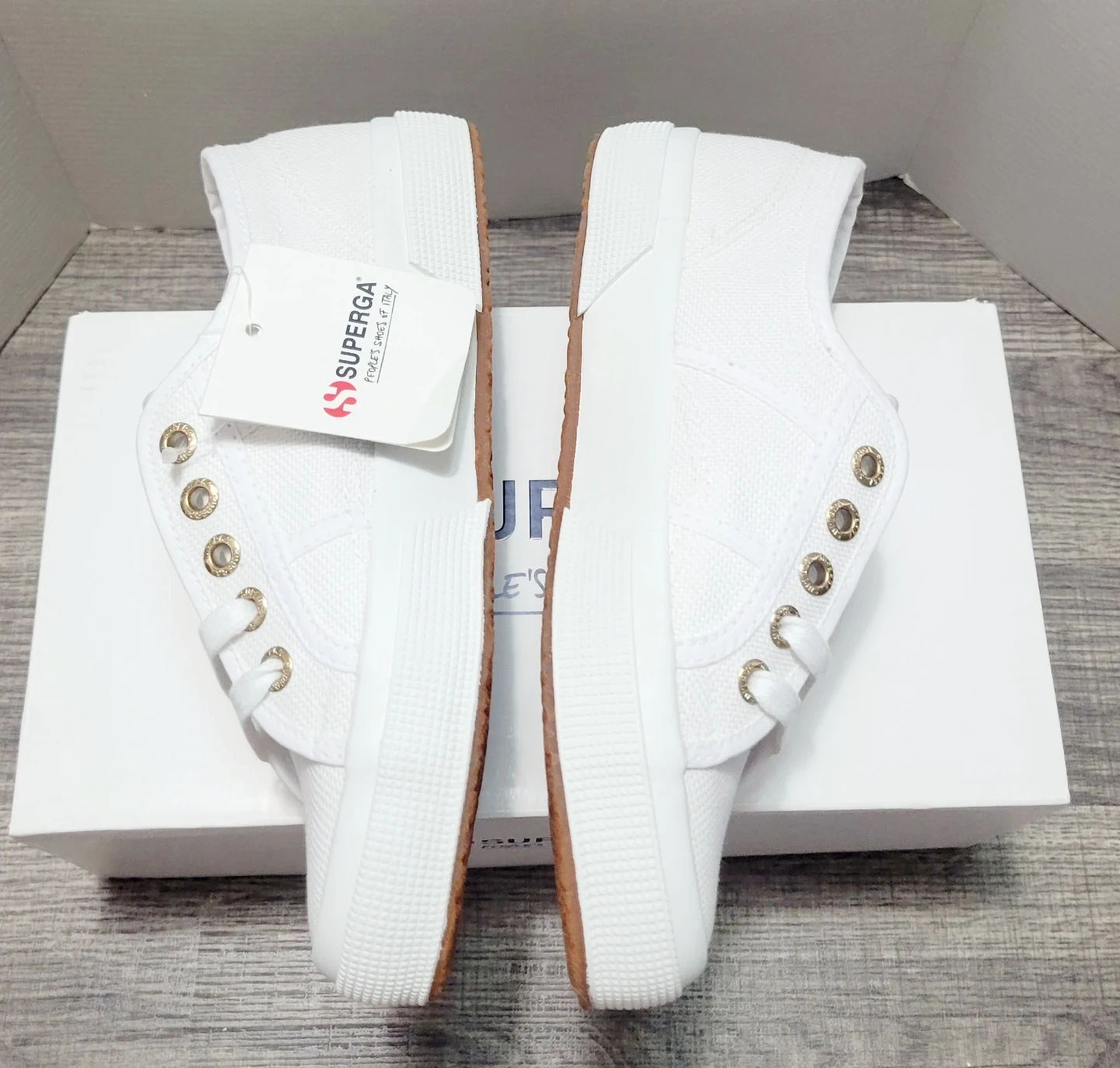 Superga women's white canvas low top sneakers. Classic lace-up design with gold-tone eyelets. Includes original Superga box.