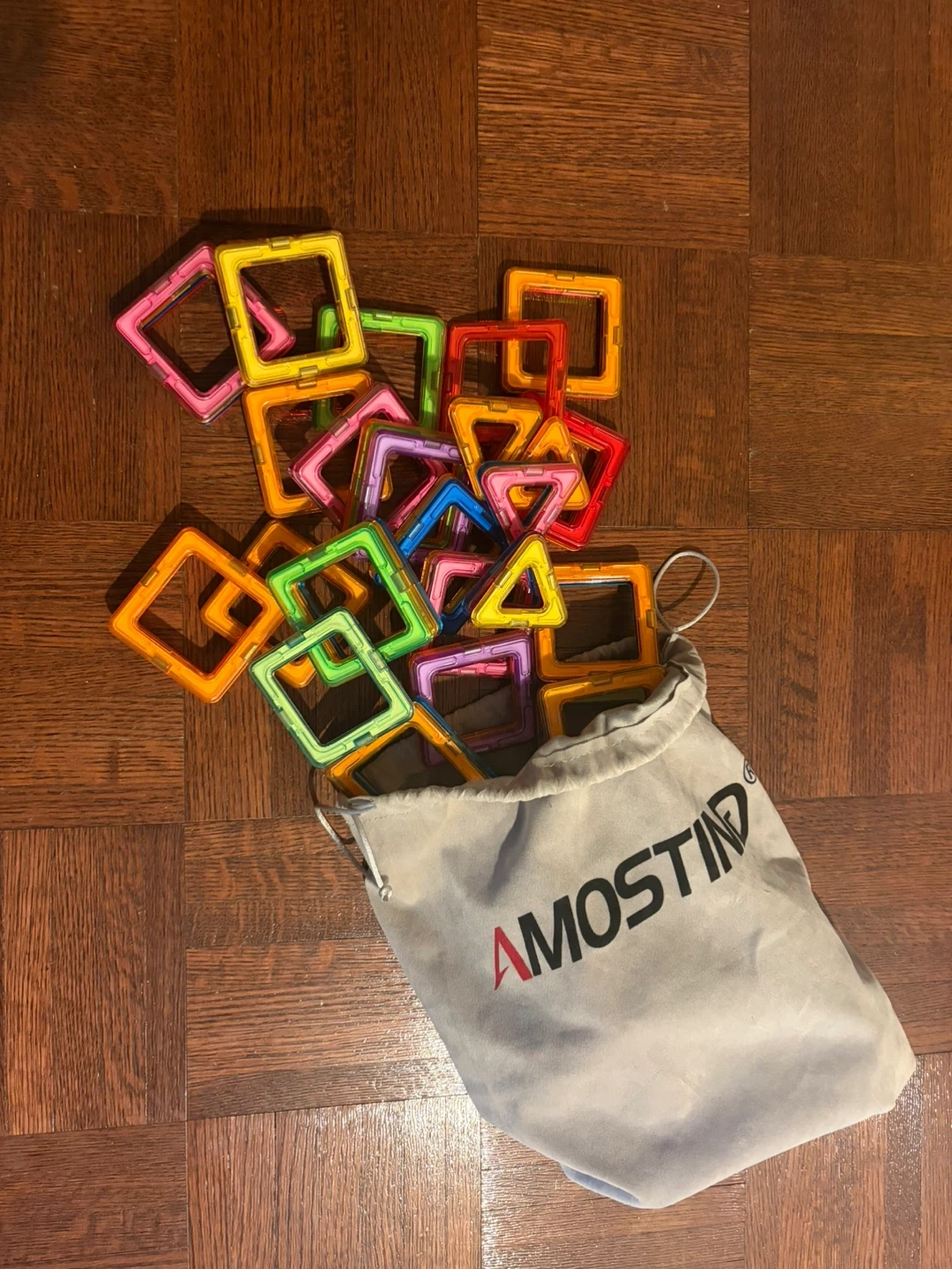 This AMOSTIND magnetic building block set comes with 64 pieces. It includes a storage bag for easy cleanup. These colourful blocks are great for creative play and building different structures!