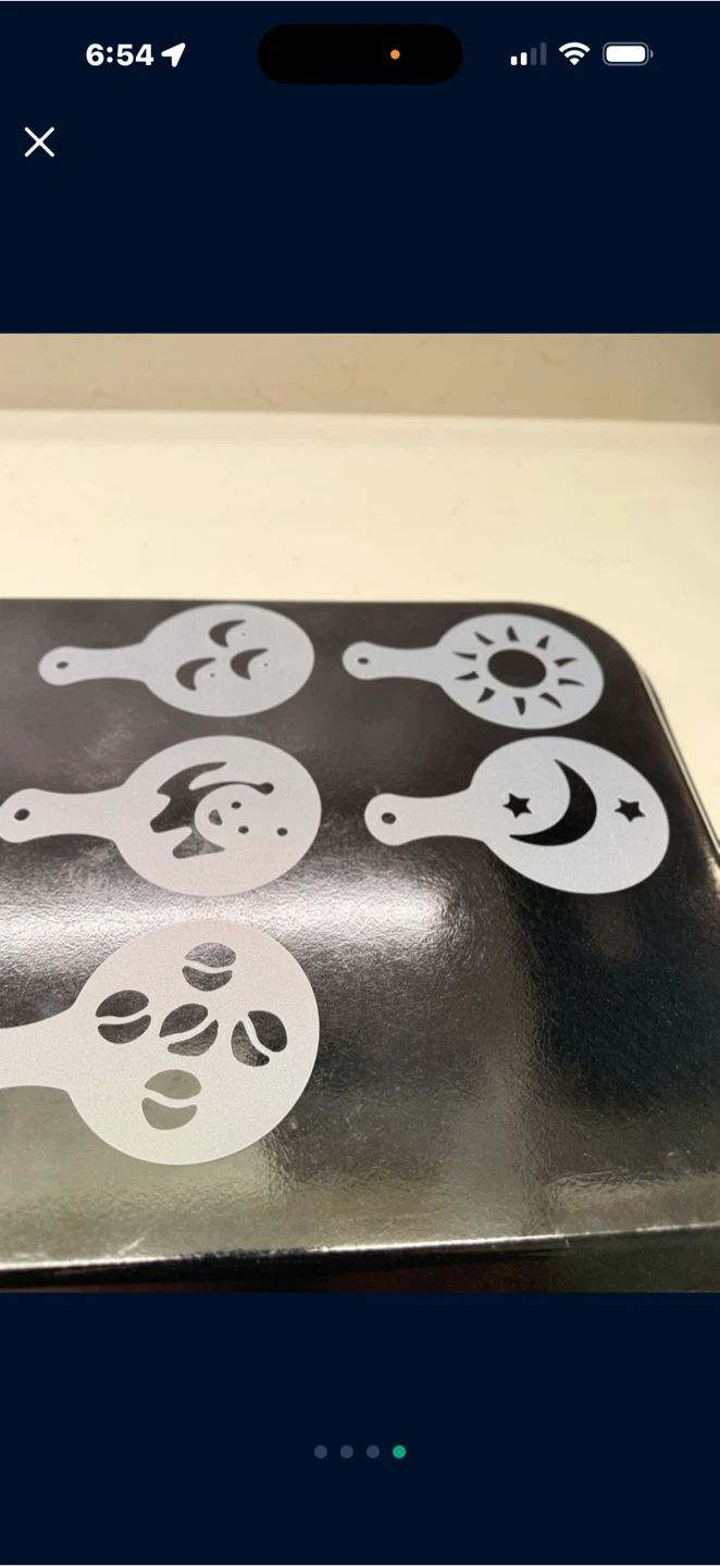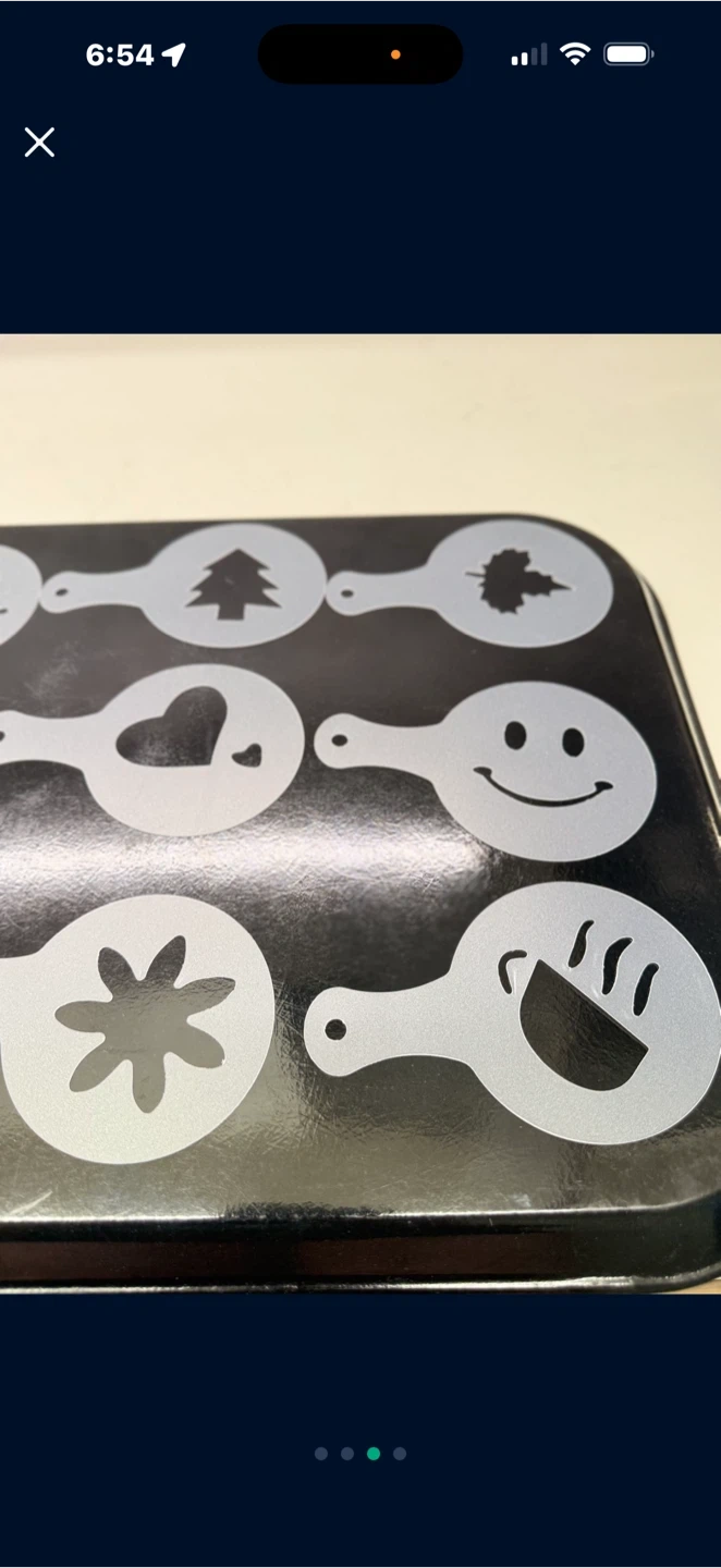 Condition New- includes 16 different fun designs for decorating lattes and cappuccinos. Designs include a sun, moon, stars, coffee beans, hearts, smiley faces, and more. Made of durable material for repeated use. Perfect for home baristas and coffee lovers!