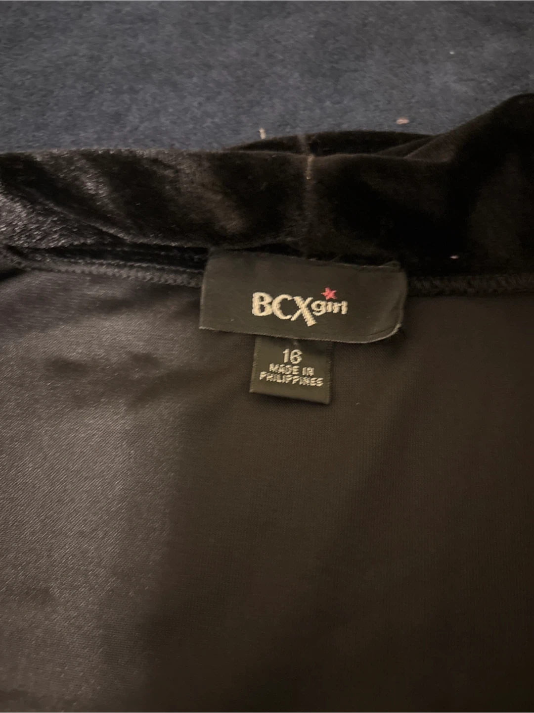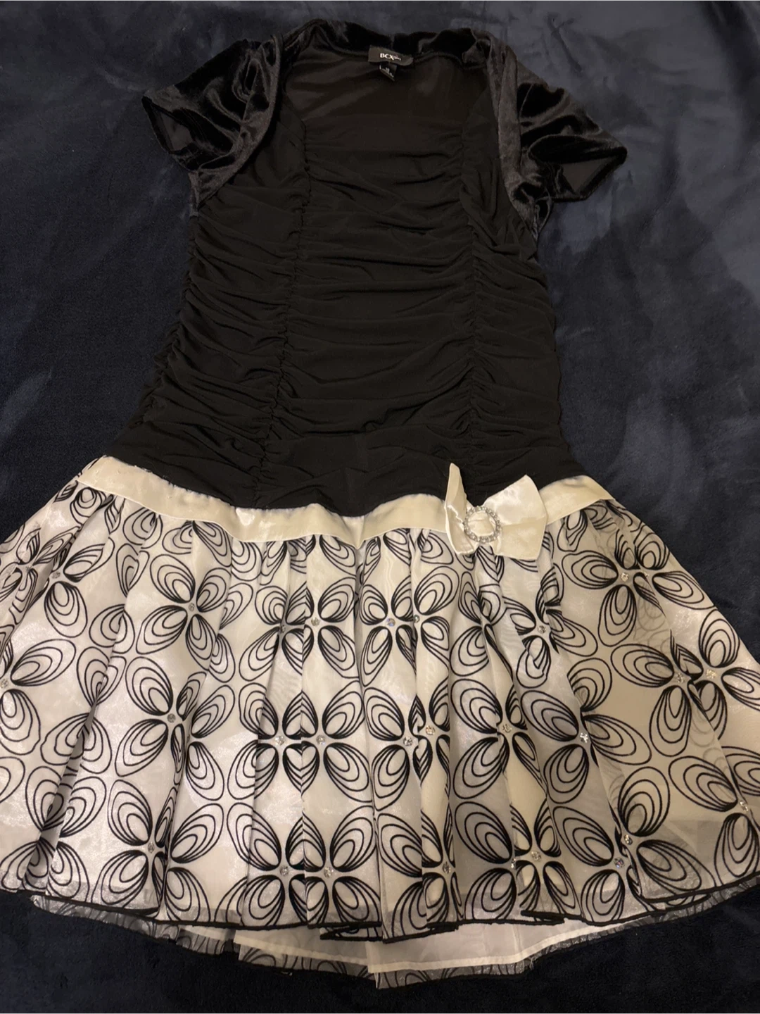 This BCXgirl dress features a ruched black bodice with velvet trim on the sleeves and neckline. The skirt is black and white with a floral pattern. Size 16. It's perfect for parties or special occasions!