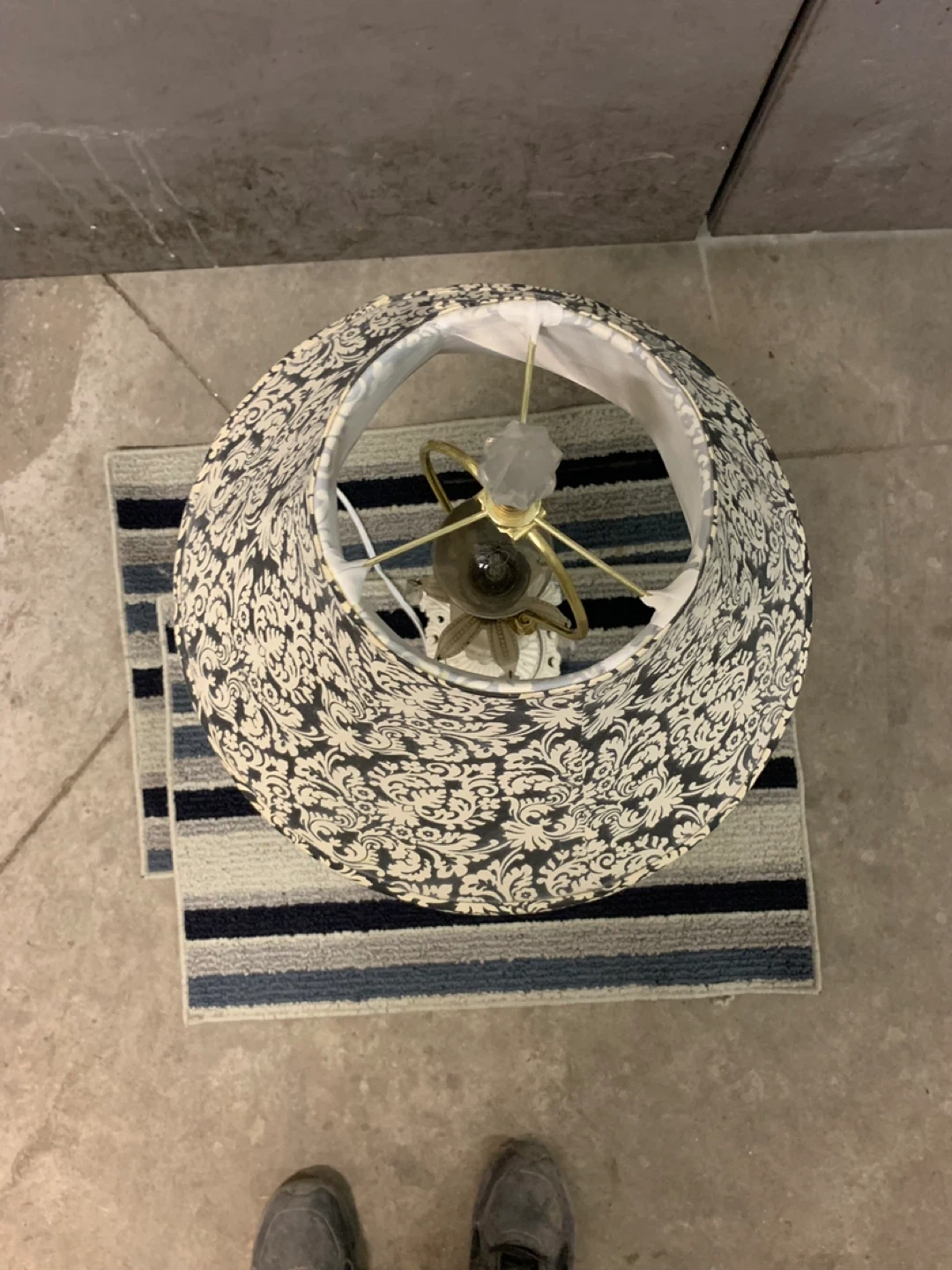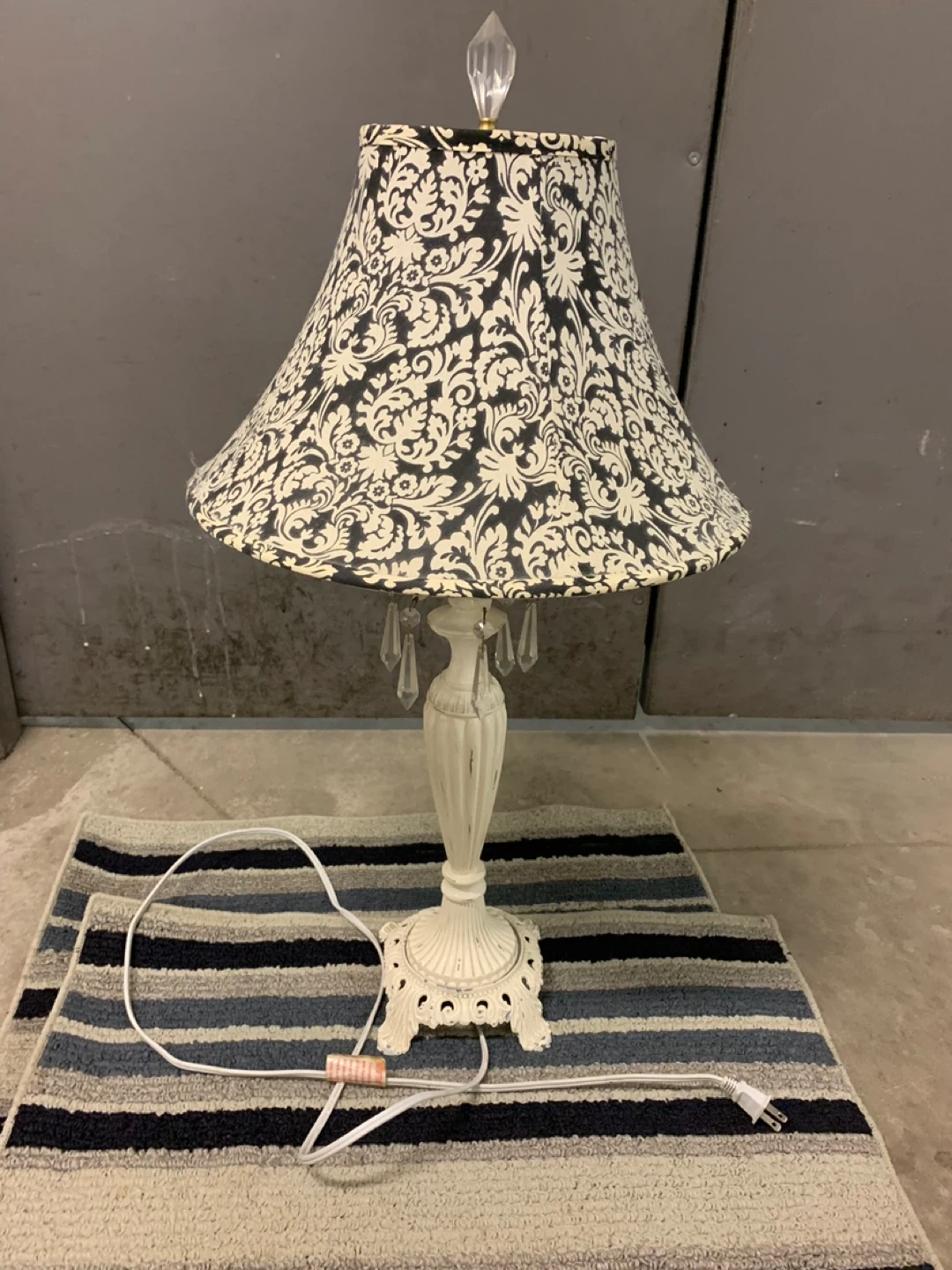 This decorative table lamp features a vintage-inspired white base and a black and white damask patterned shade. It has a classic look with faux crystal accents. The lamp is perfect for adding a touch of elegance to any room. Stands 32 inches tall…