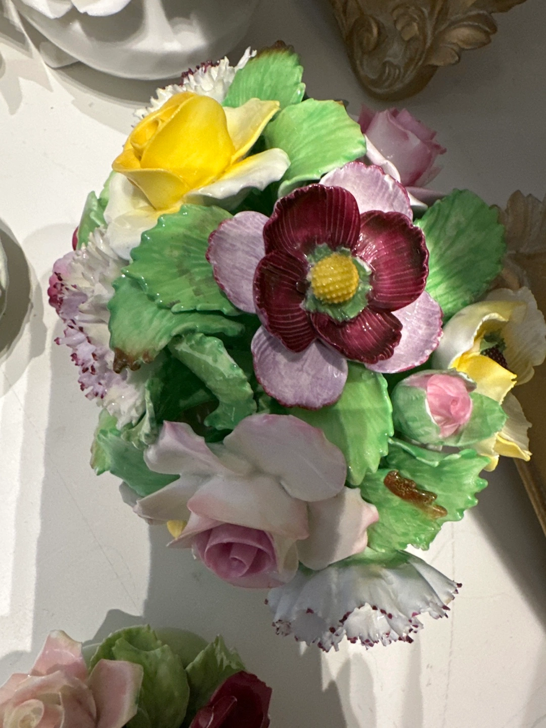 Exquisite bone china floral arrangement. Features various colourful roses and other flowers. Intricate detailing and vibrant colours. Perfect for collectors or as a decorative accent.