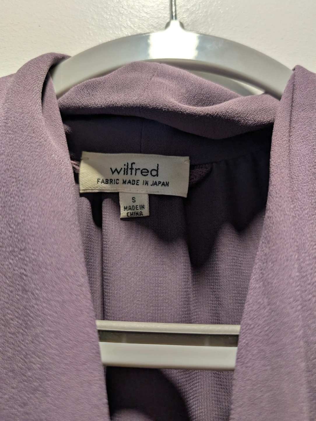 This Wilfred sleeveless wrap dress comes in a lovely shade of purple. It's a size small and features a tie waist. The fabric is made in Japan.