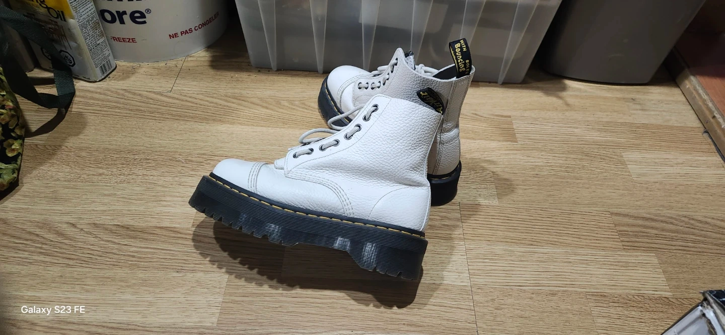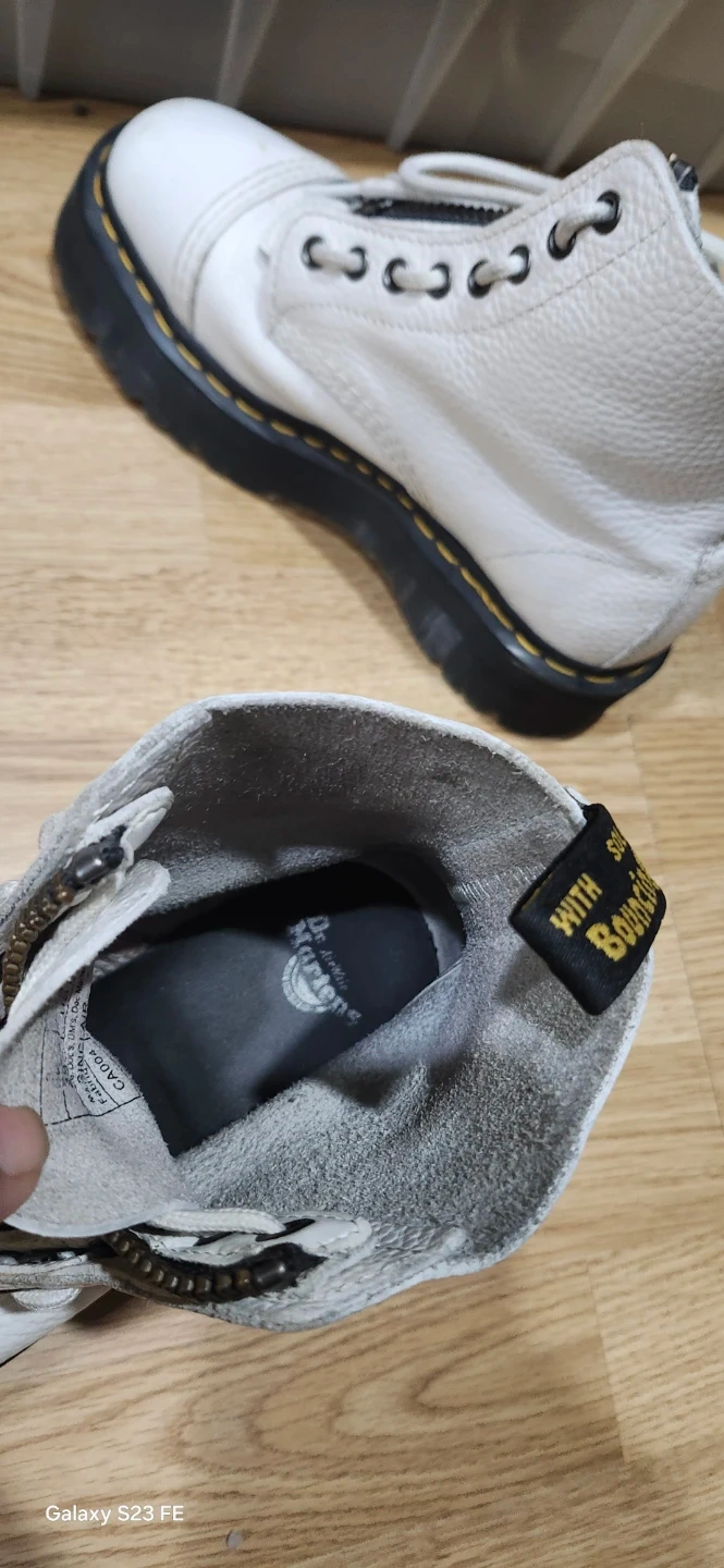 Used excellent condition Selling a pair of Dr. Martens boots in white leather. They feature a unique zipper detail and a chunky platform sole. These boots are in great condition and ready for a new adventure! Price firm final cash only pickup no delivery 891 O'Connor drive outside TD Canada Trust bank door East York.