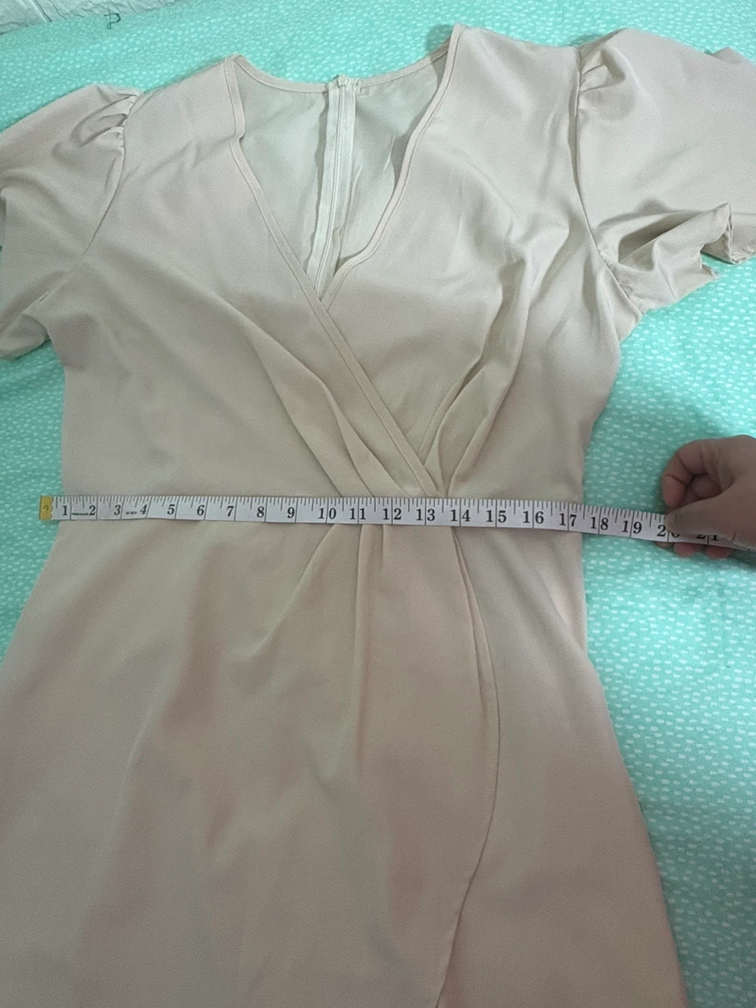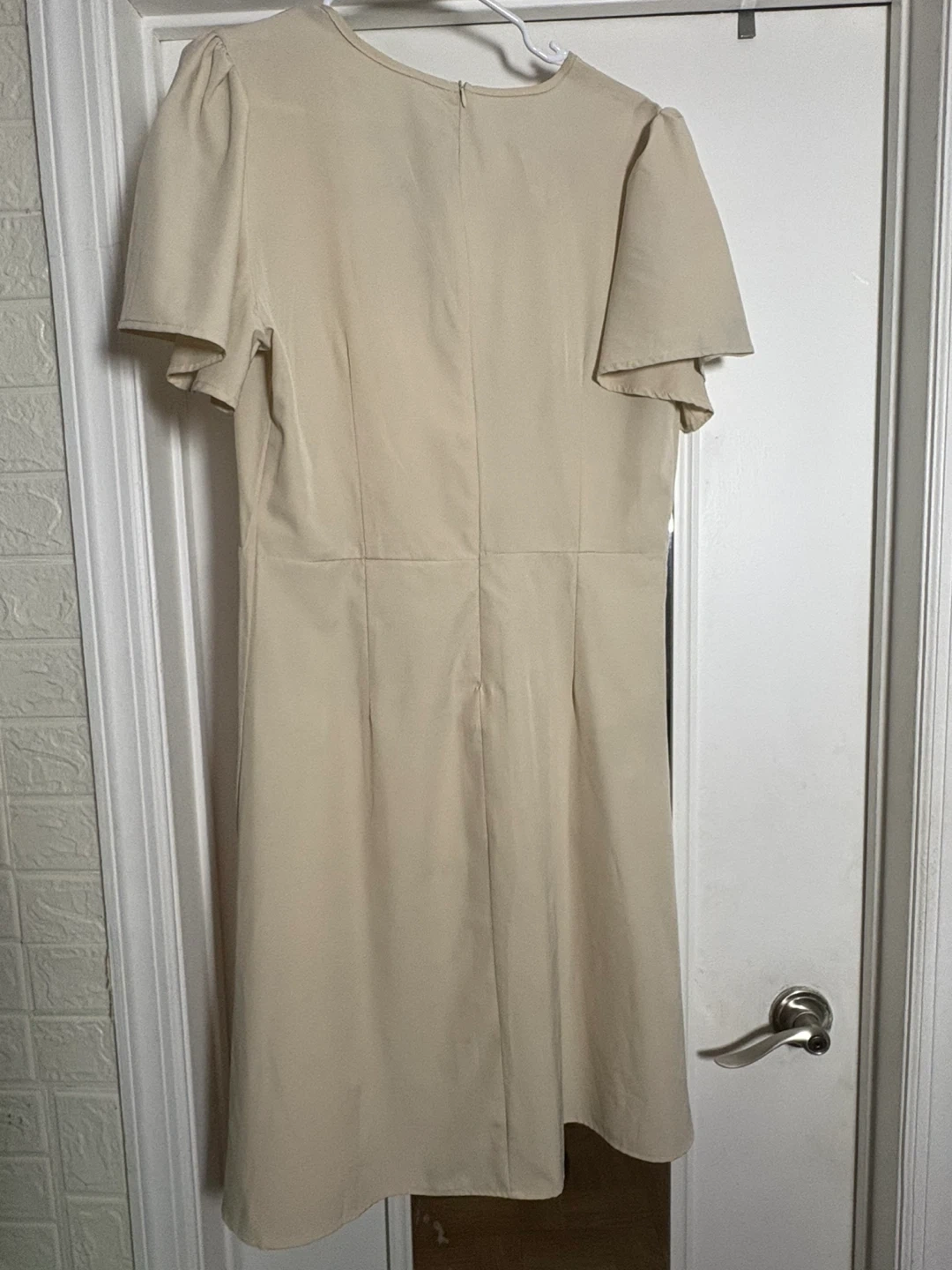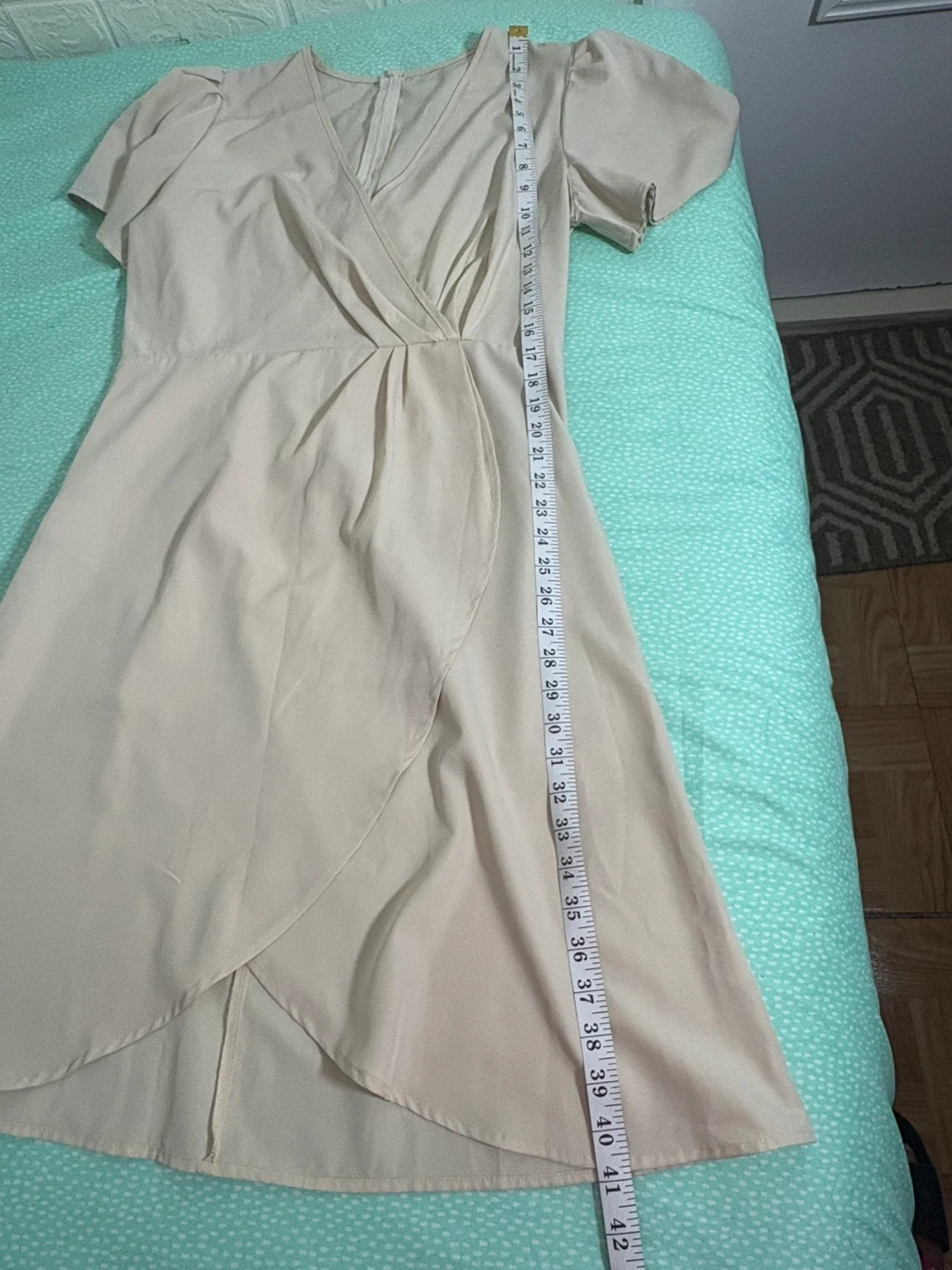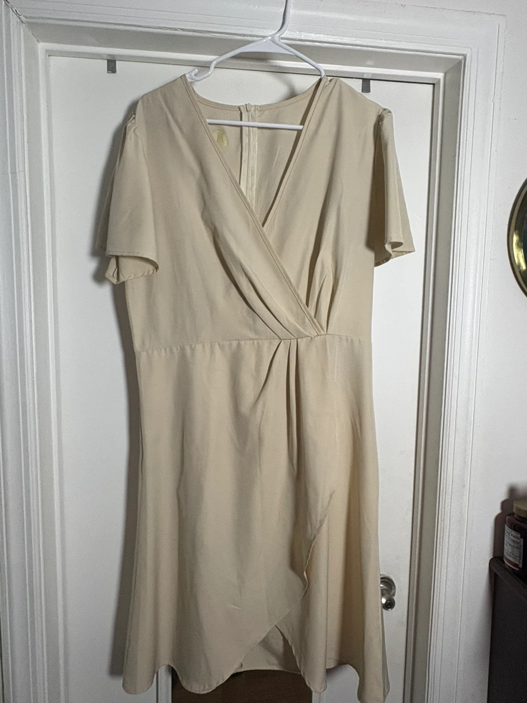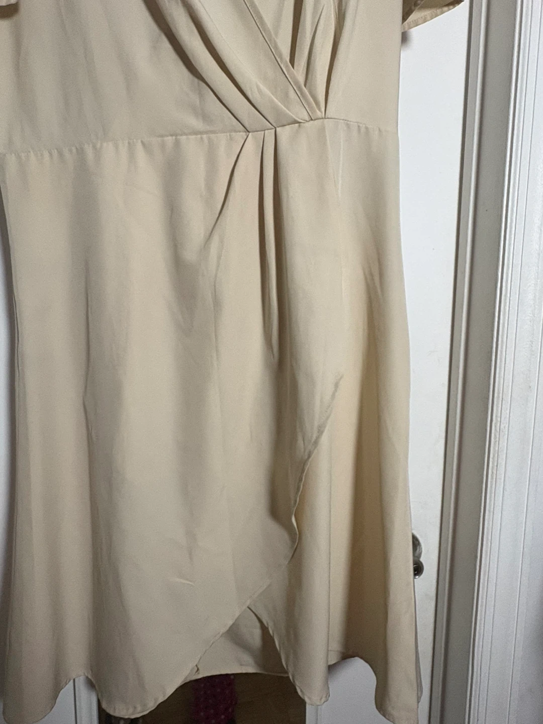 This beige faux leather wrap dress features short flutter sleeves and a flattering V-neckline. It's designed with a tulip hem and a faux wrap skirt for a stylish silhouette. The material's smooth finish offers a chic look.