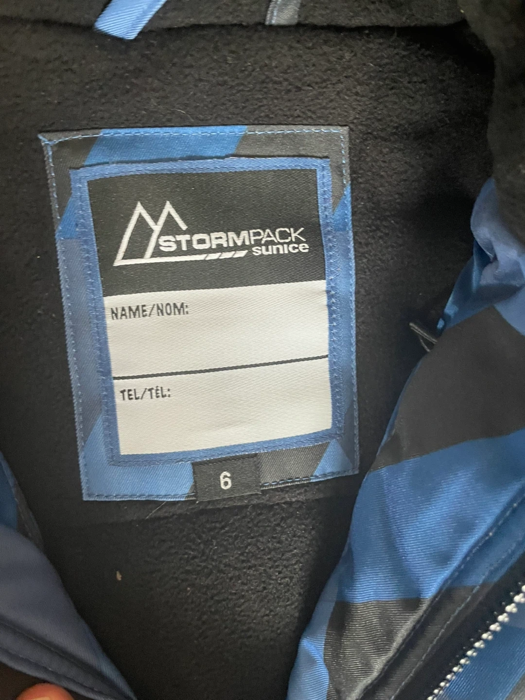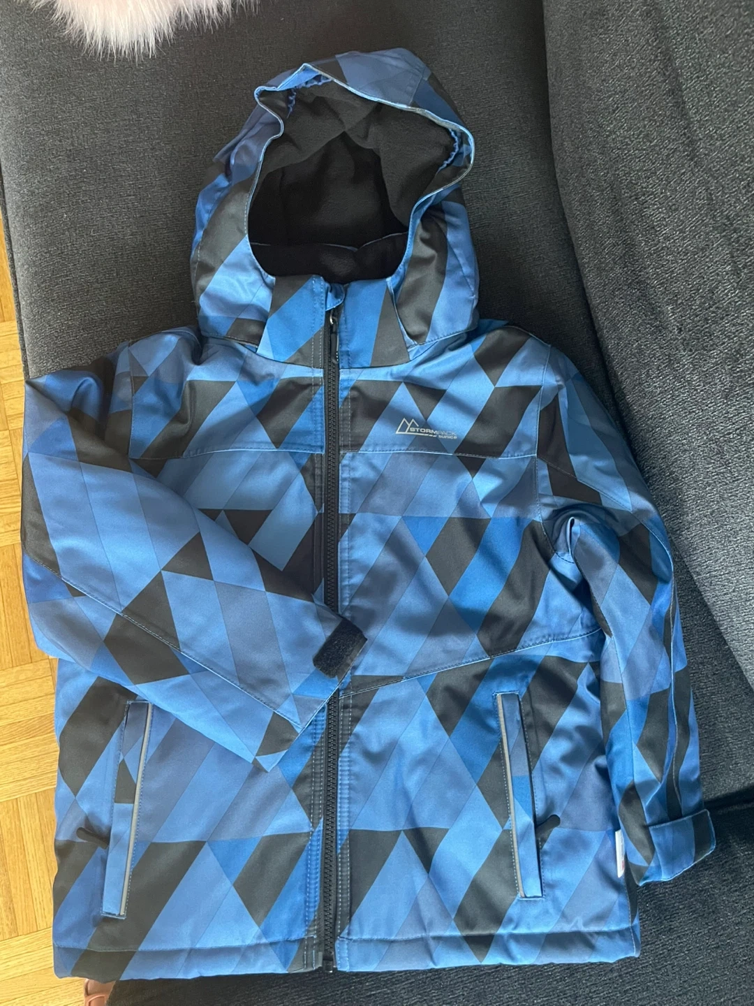 This boys' Stormpack Sunice jacket is blue with a cool geometric pattern. It's a size 6, perfect for keeping your little one warm. Worn just twice .It has a full zip front and a cozy hood.